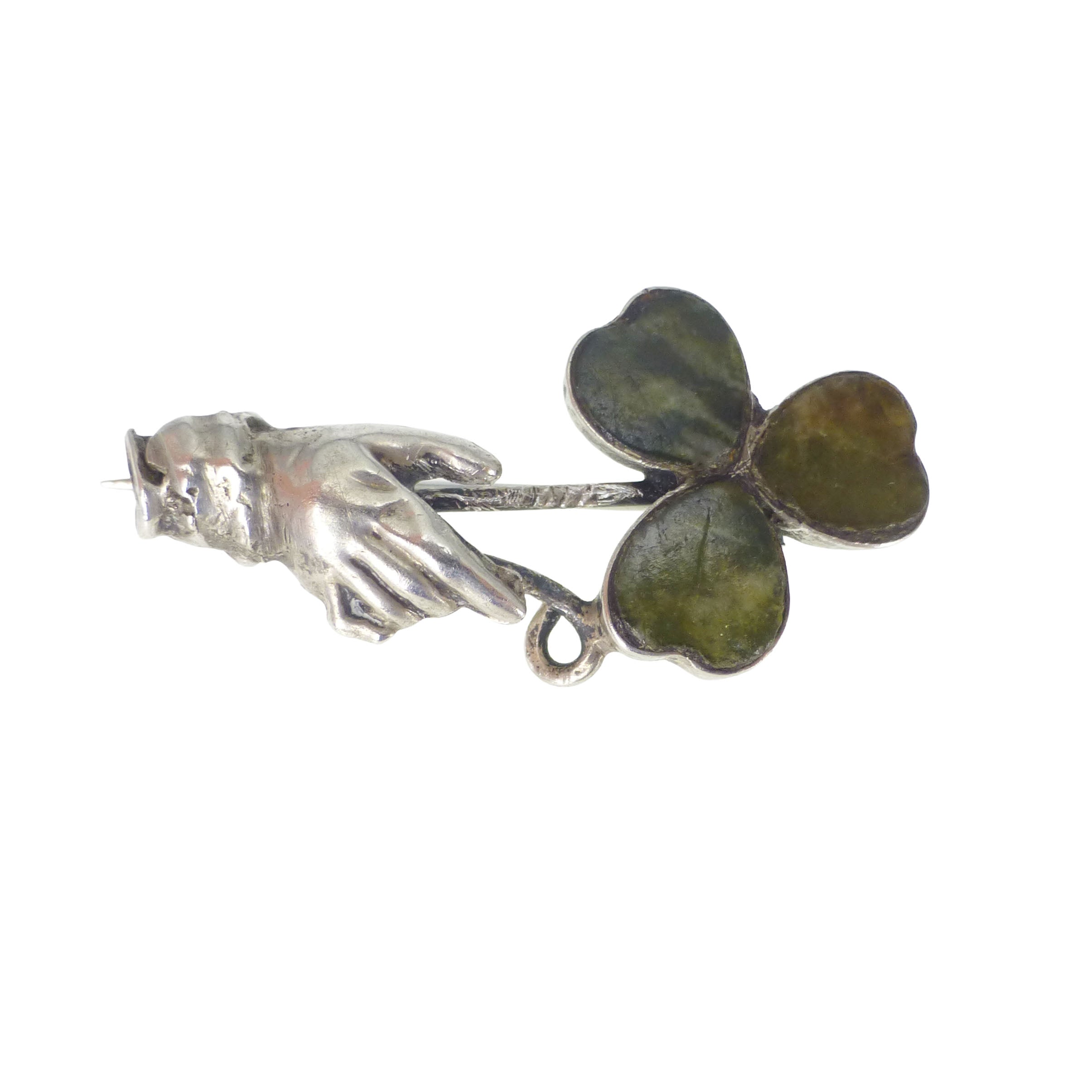 Antique Silver Hand Connemara Marble Shamrock Brooch