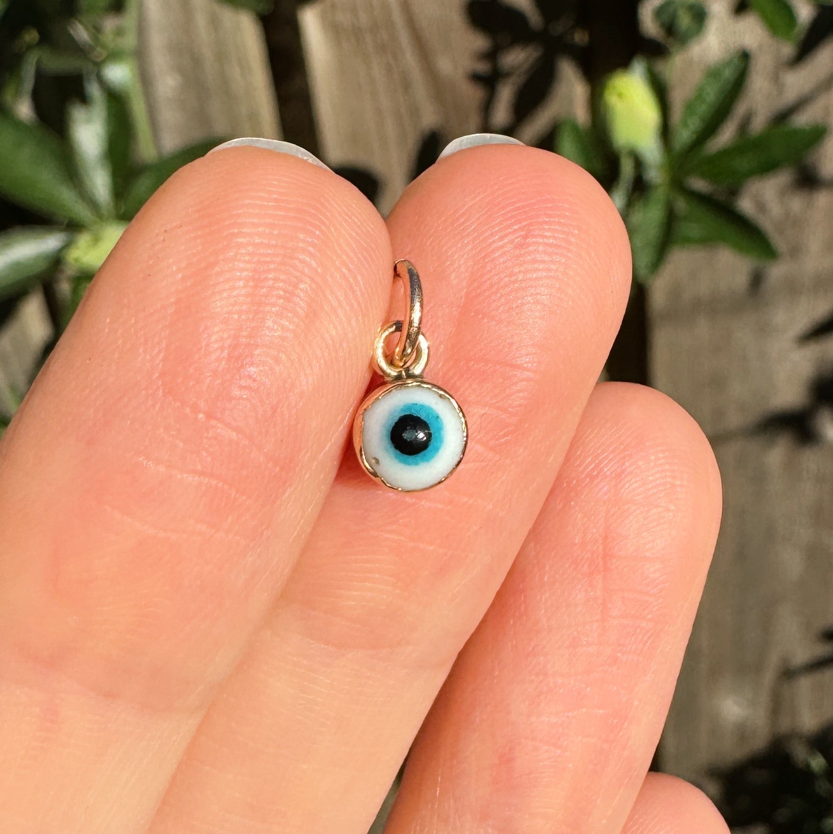 A tiny gold evil eye charm dating to the early 20th Century. The charm is double sided and features a hooked top with a rolled gold bale attached.