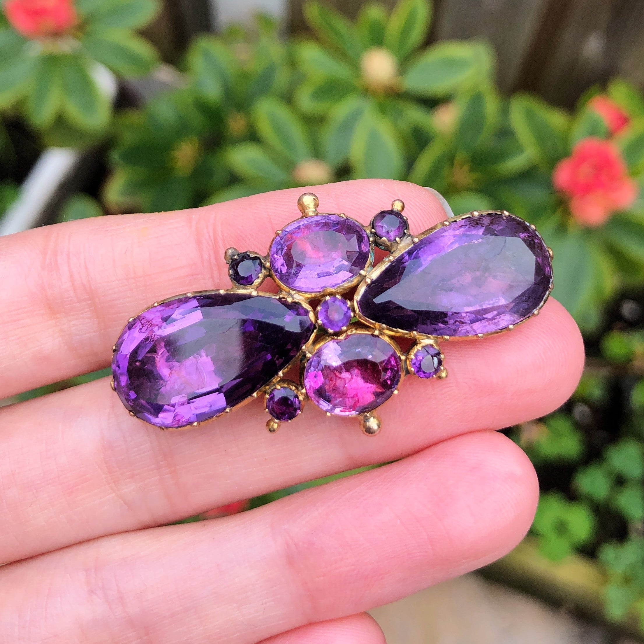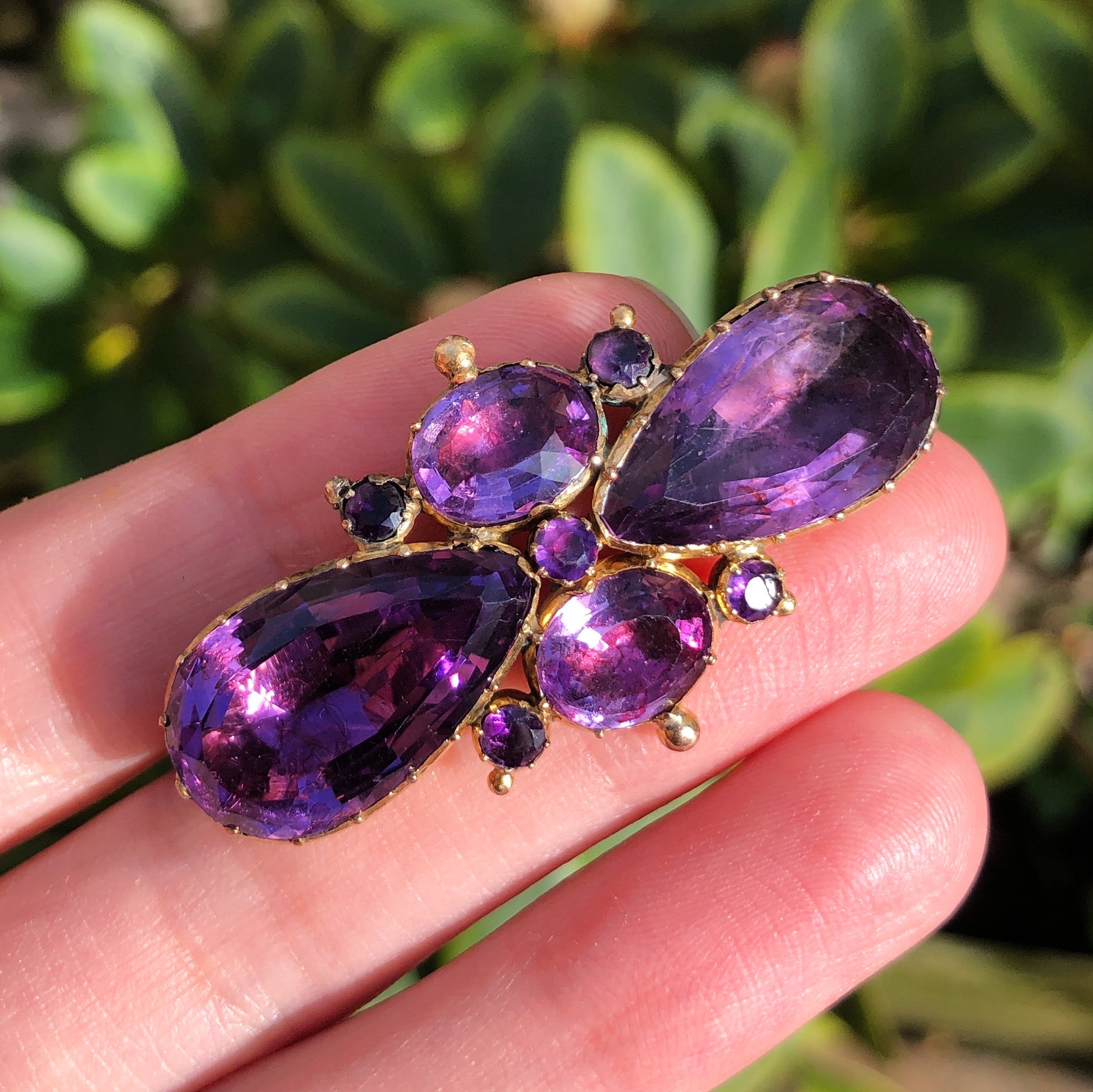 An incredible antique Georgian gold brooch set with beautiful foil backed amethyst stones.