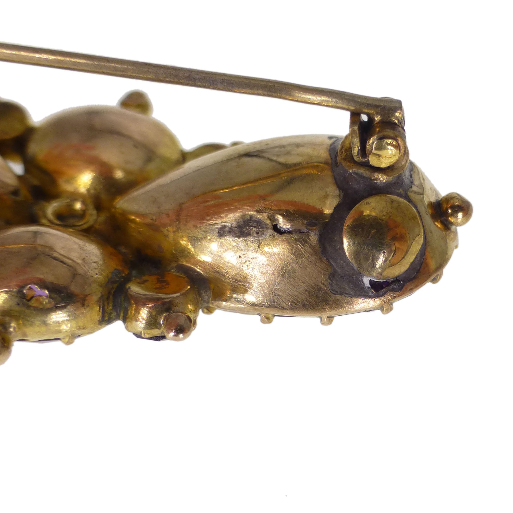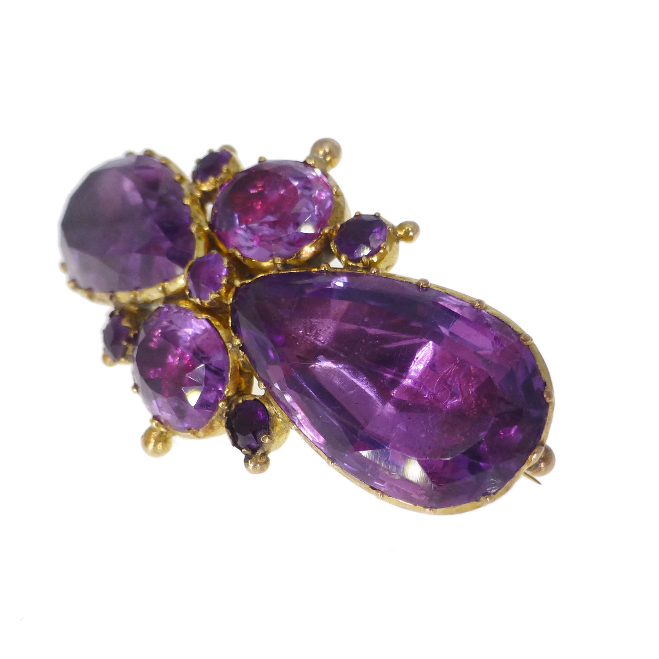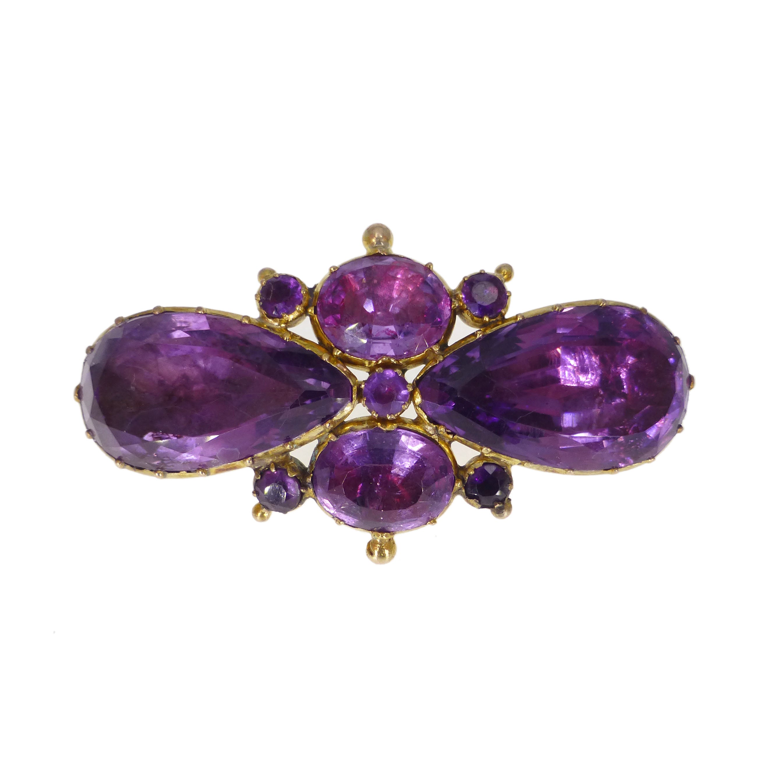 The brooch has been listed 'As Found' as there are some tears to the gold base frame with quite a few patches of soldering. There is also age related wear to the foil base of each amethyst stone.
