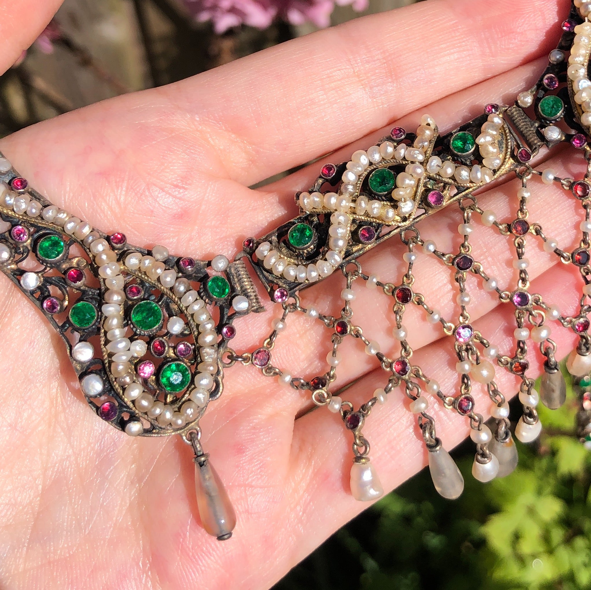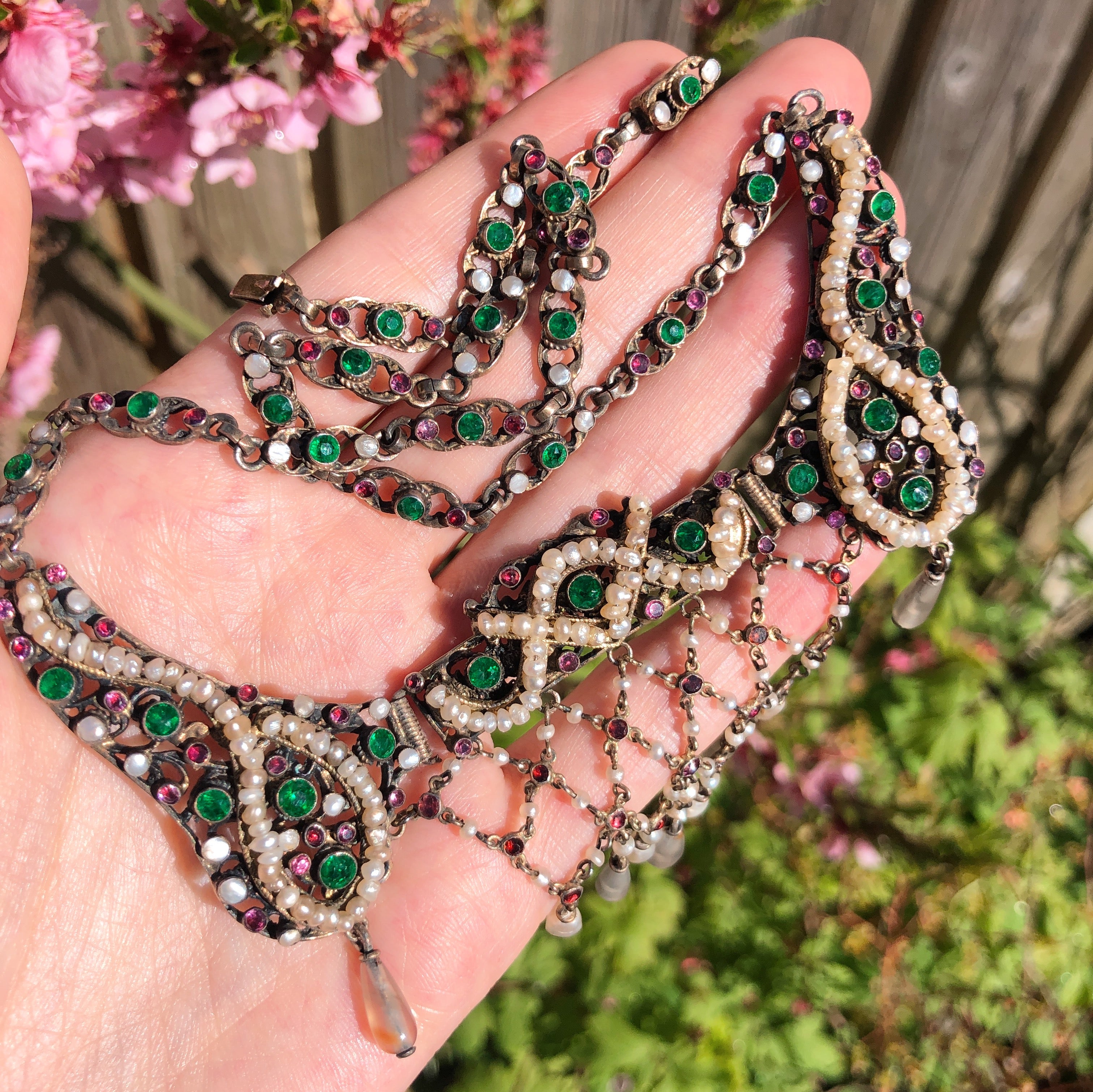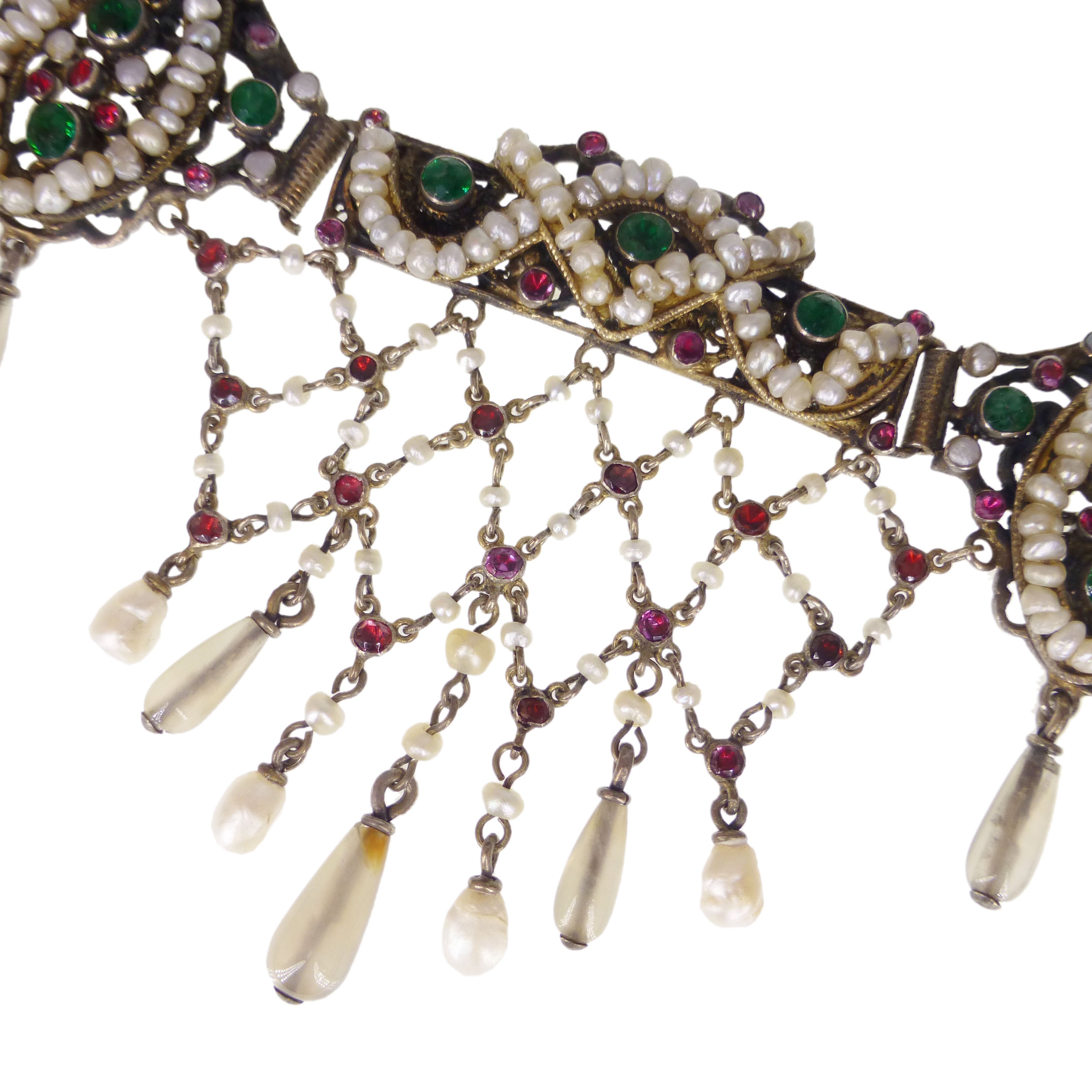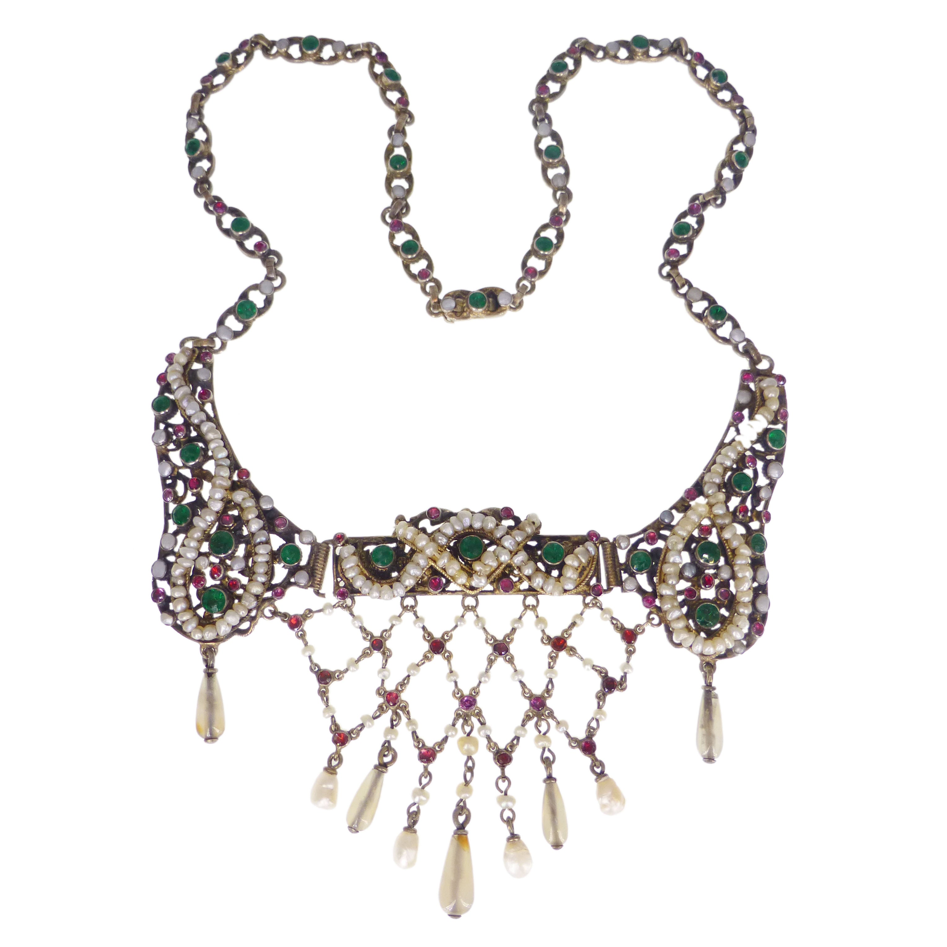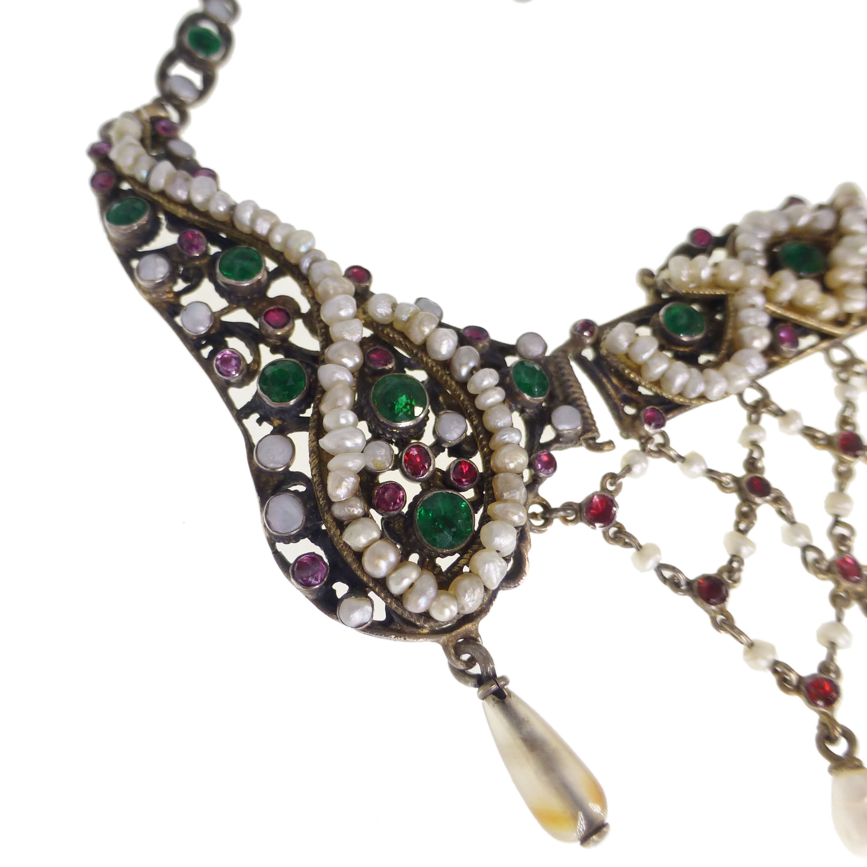 Antique Austro Hungarian Silver Gilt Garnet Pearl & Paste Drop Necklace