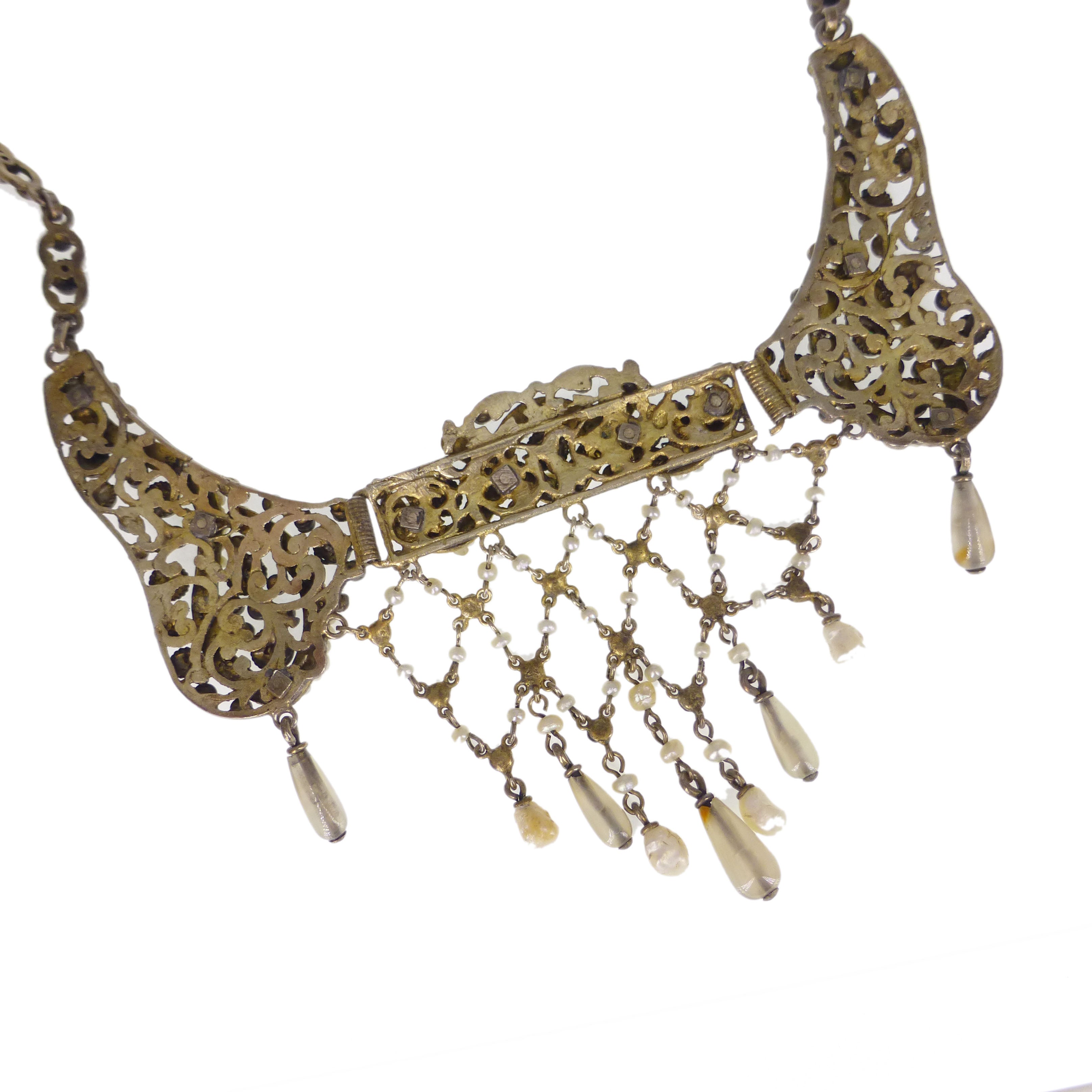 A wonderful antique Austro Hungarian silver gilt necklace featuring an ornate lattice design with beautiful seed pearl detailing.
