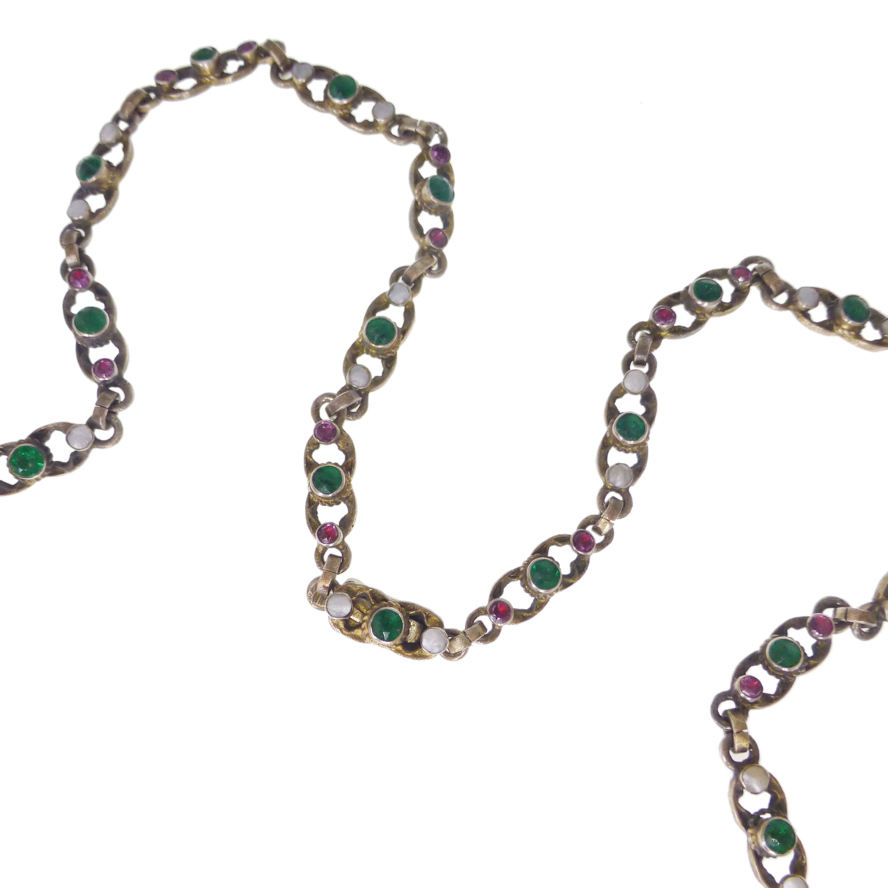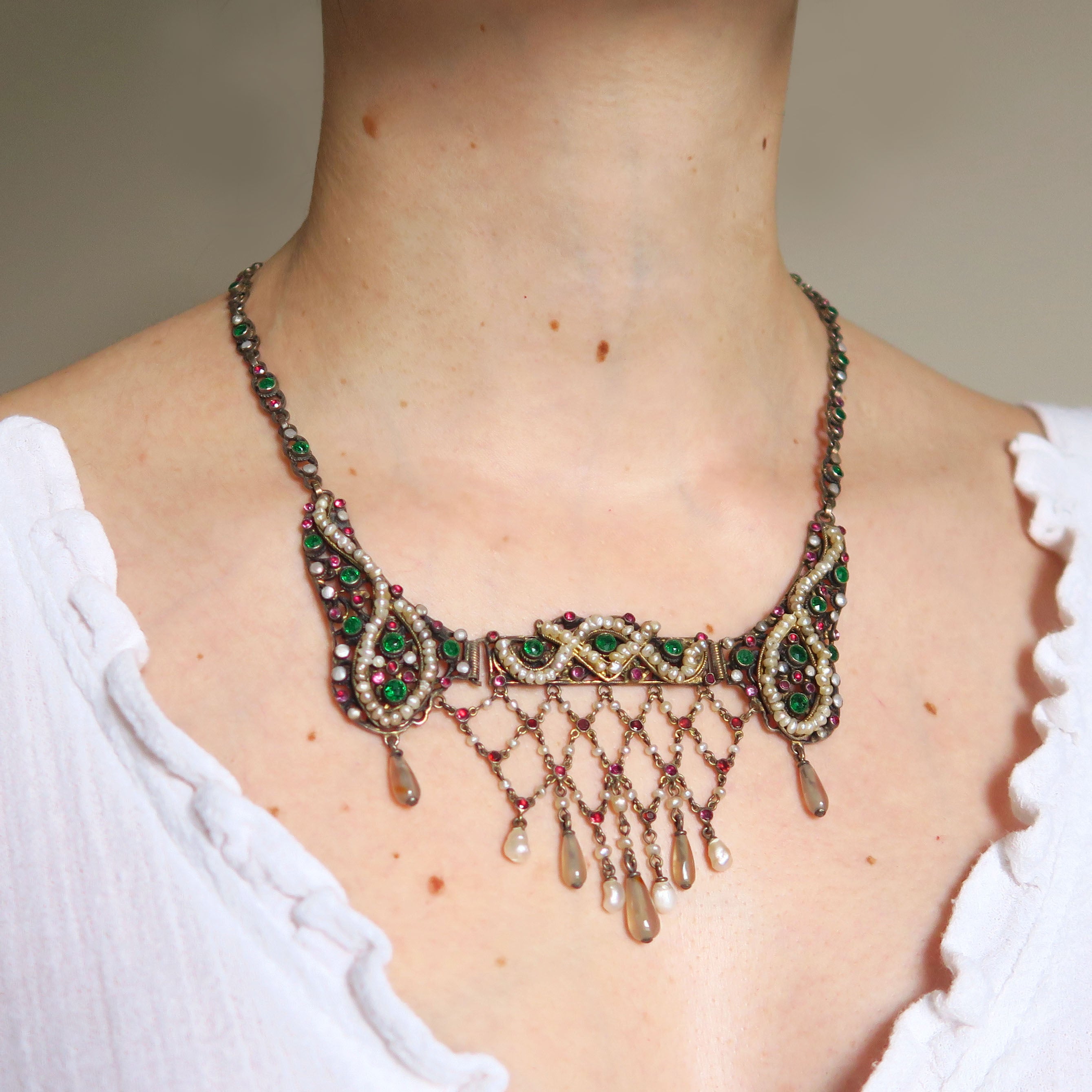 The necklace has been so intricately made, each panel is studded with red flat cut garnets and vibrant green paste stones. Hanging from the base of each panel are little pearl and agate drops.