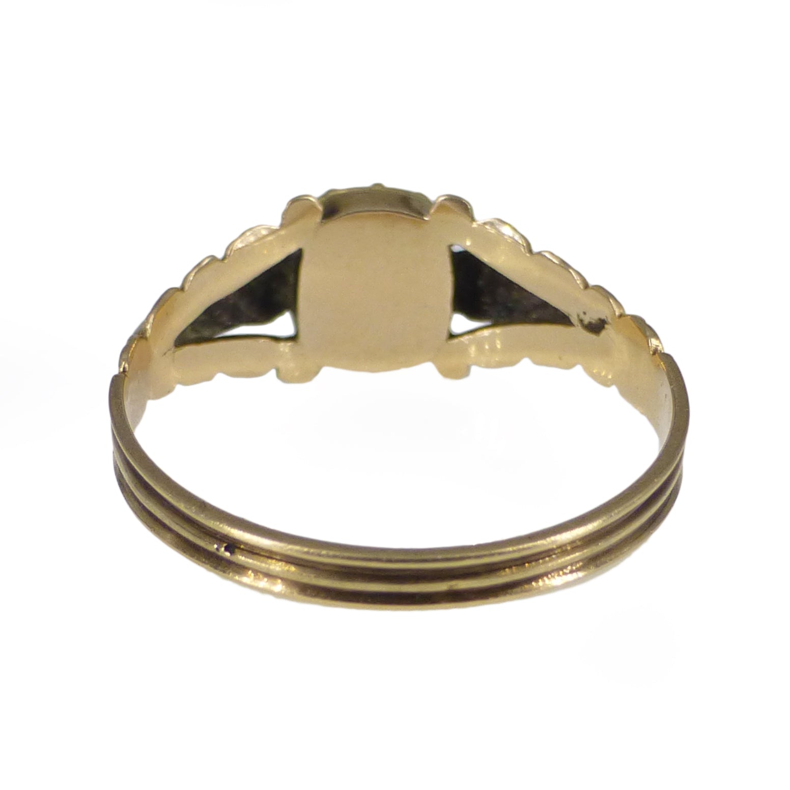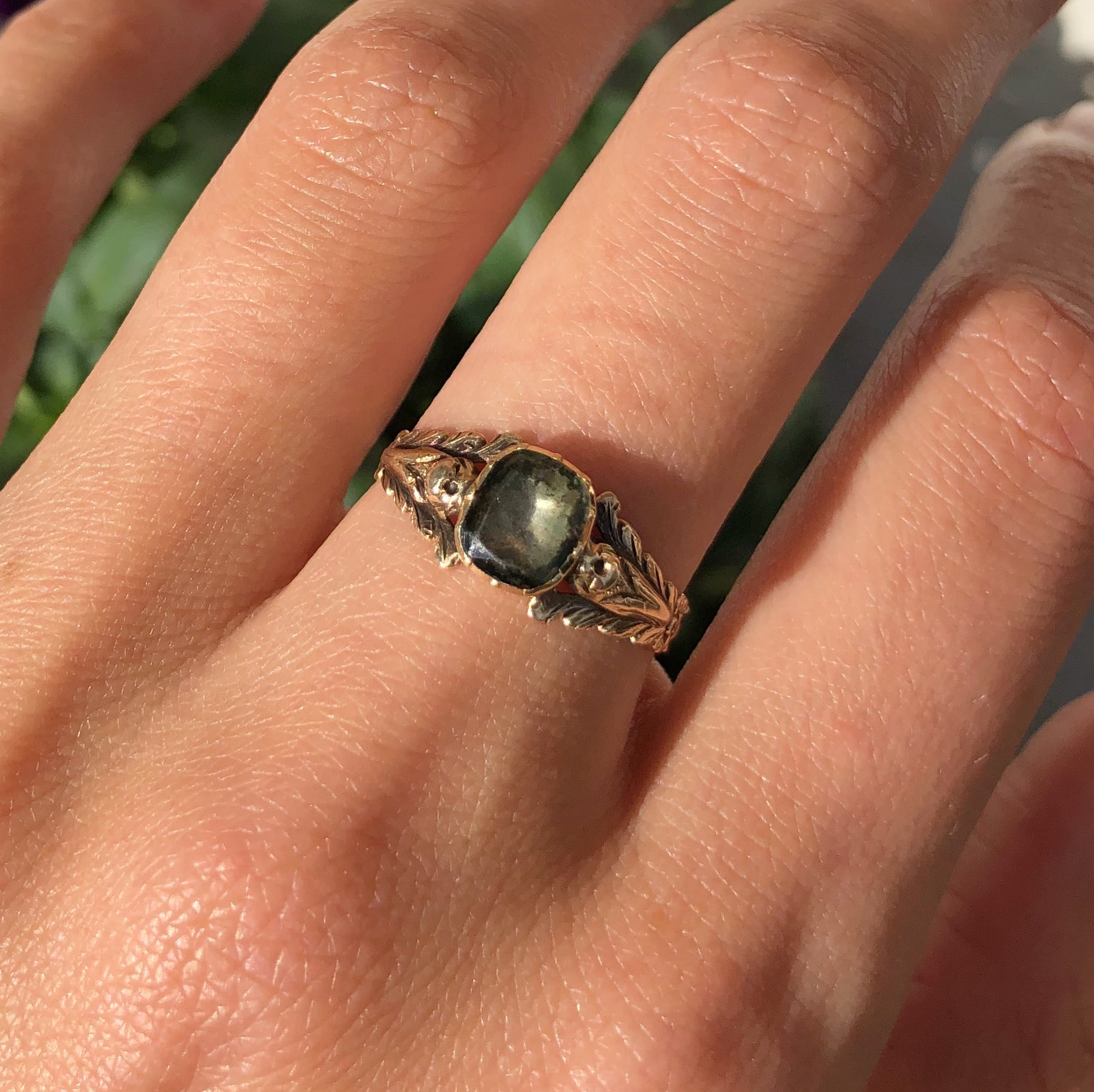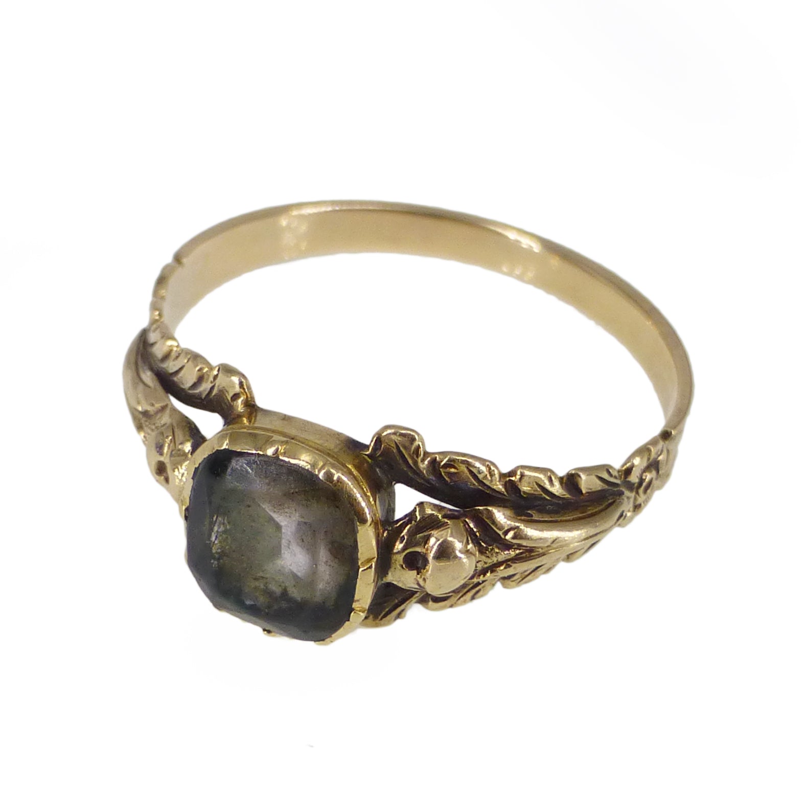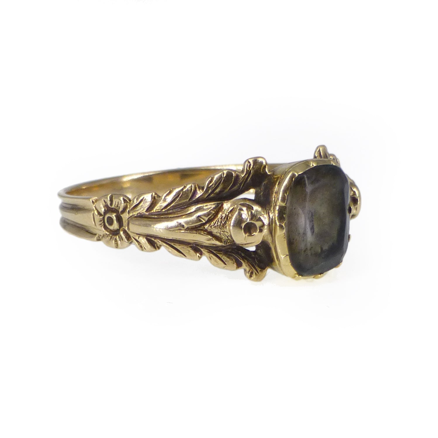 A wonderful early Victorian gold mourning ring. The ring features a mysterious grey stone that I believe to be a type of quartz. The stone is set into an ornate solid gold band with floral detailing and decorative shoulders.