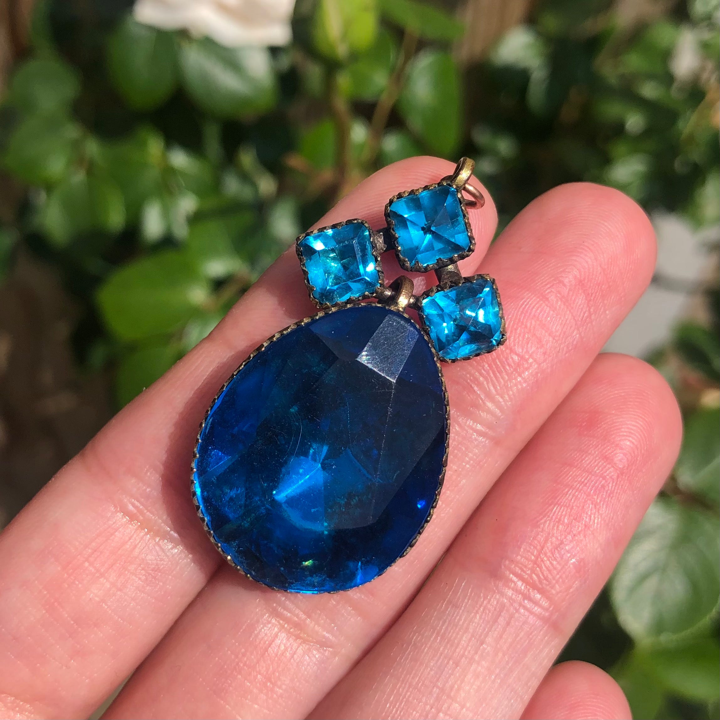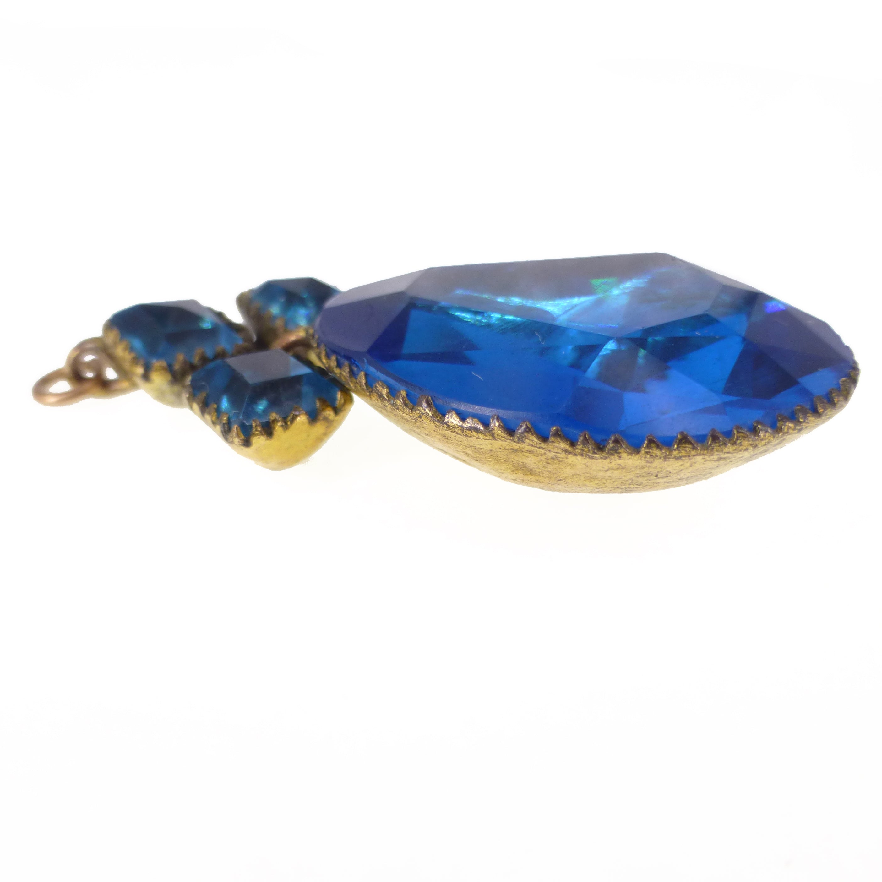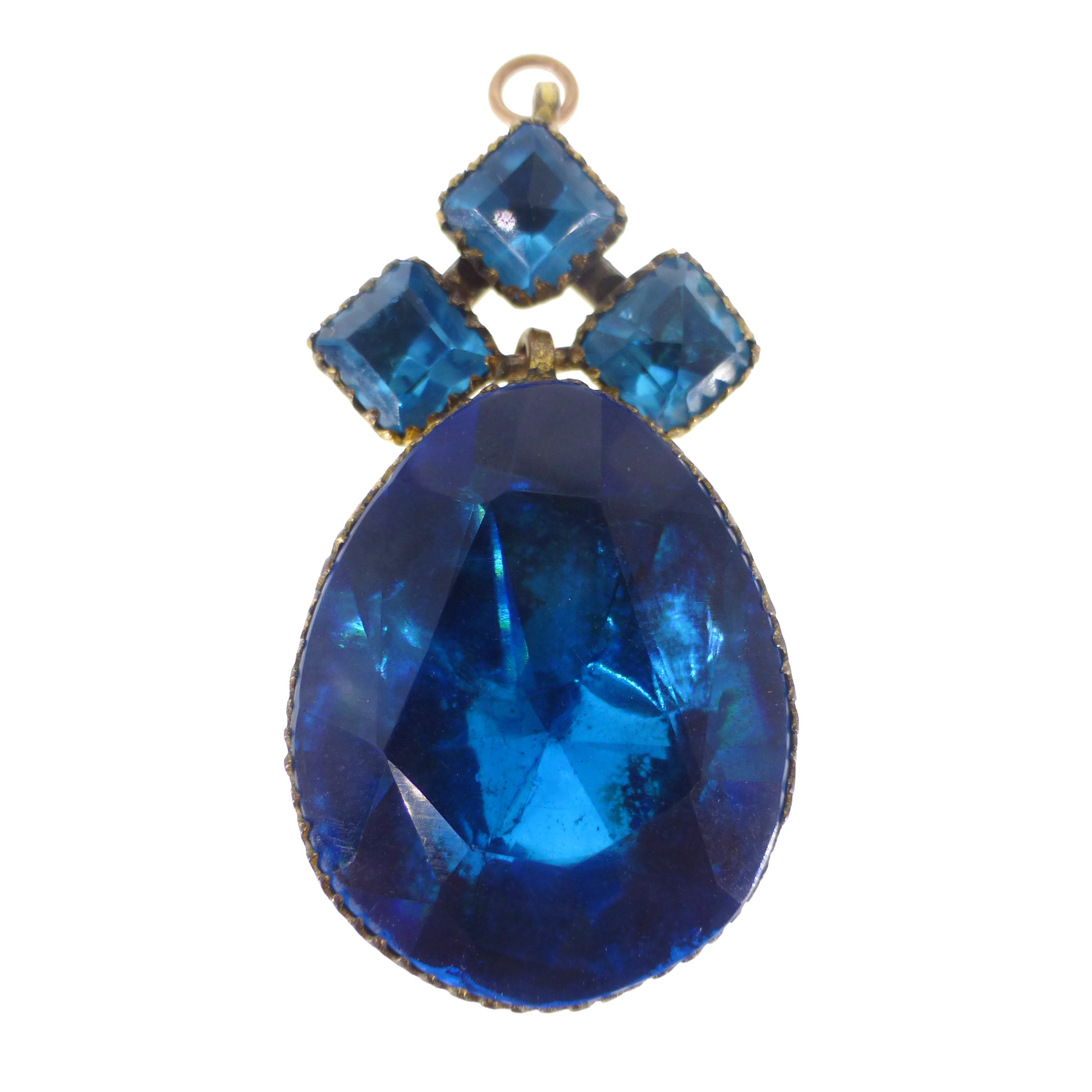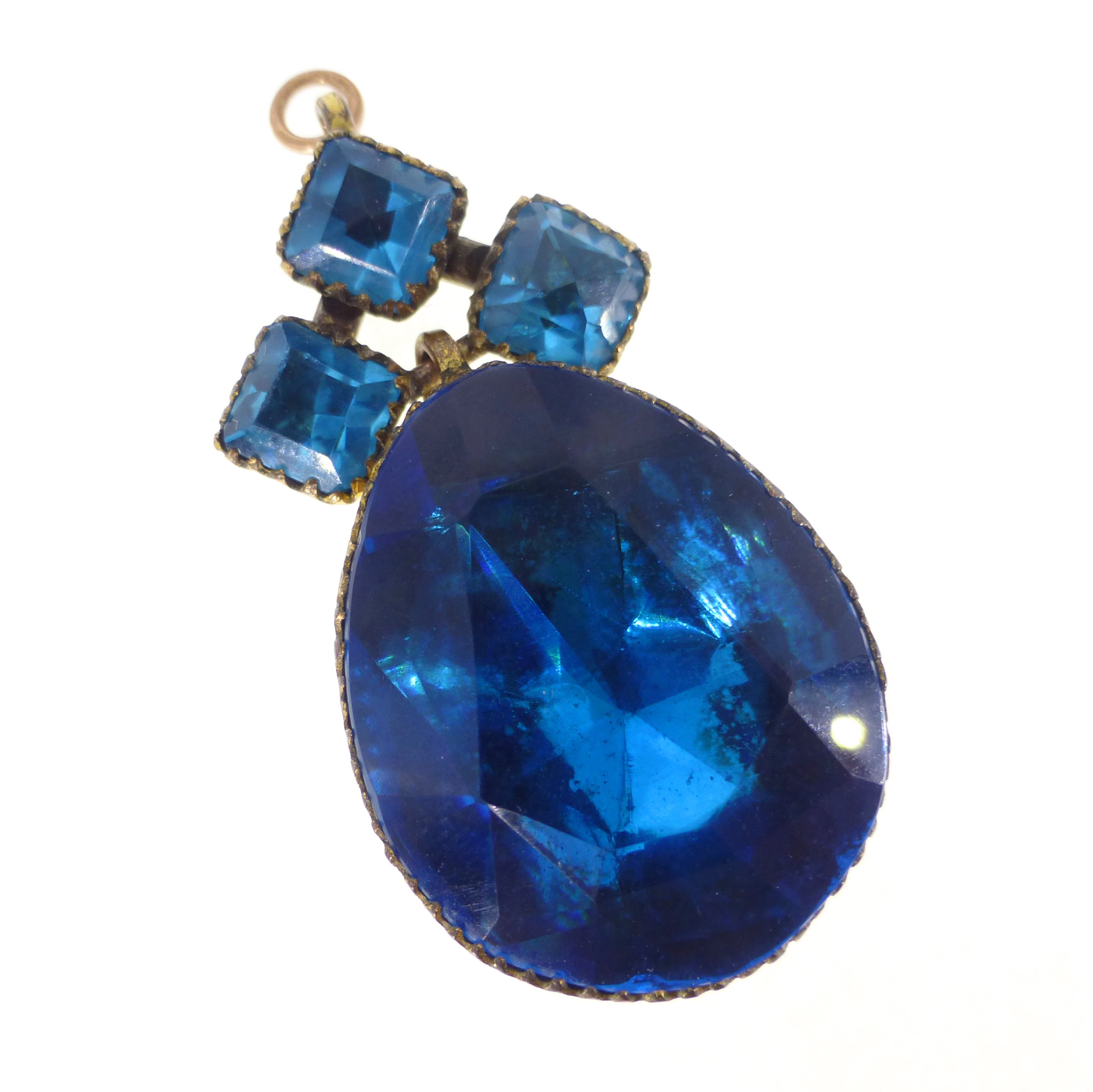 An incredible antique Queen Anne paste pendant dating to the 18th century. The pendant is set with vibrant foil backed teal blue paste stones that reflect light so beautifully. Each stone is set into a crimped frame with a domed gold coloured metal back. The pendant is finished with a hooked top.