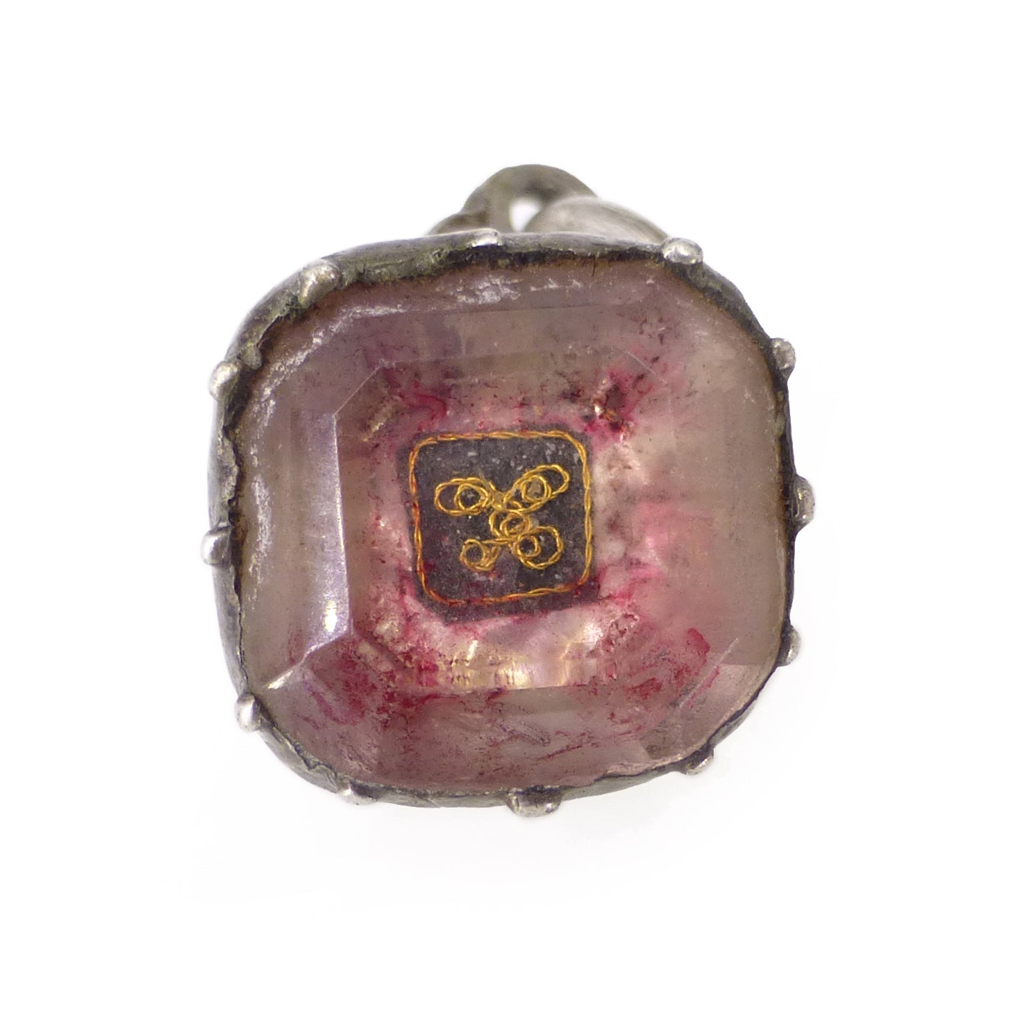 There is some slight mottling to the surface surrounding the gold cipher. There is also some age related wear around the edges of the rock crystal piece. The piece remains in great condition for its age.