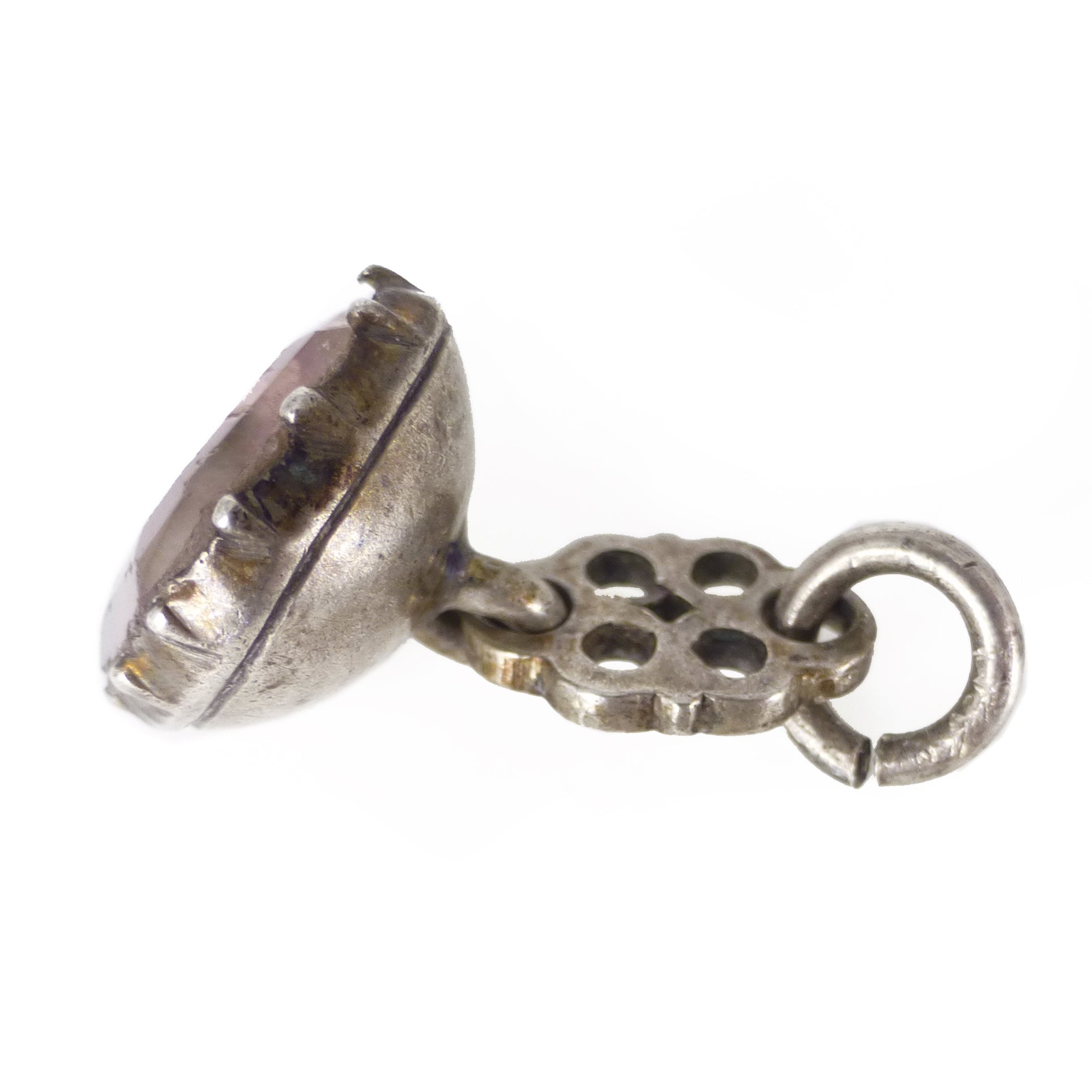 Attached to the drop is a silver panel with seven small holes and a thick silver bolt ring. A tiny piece of history in jewel form.