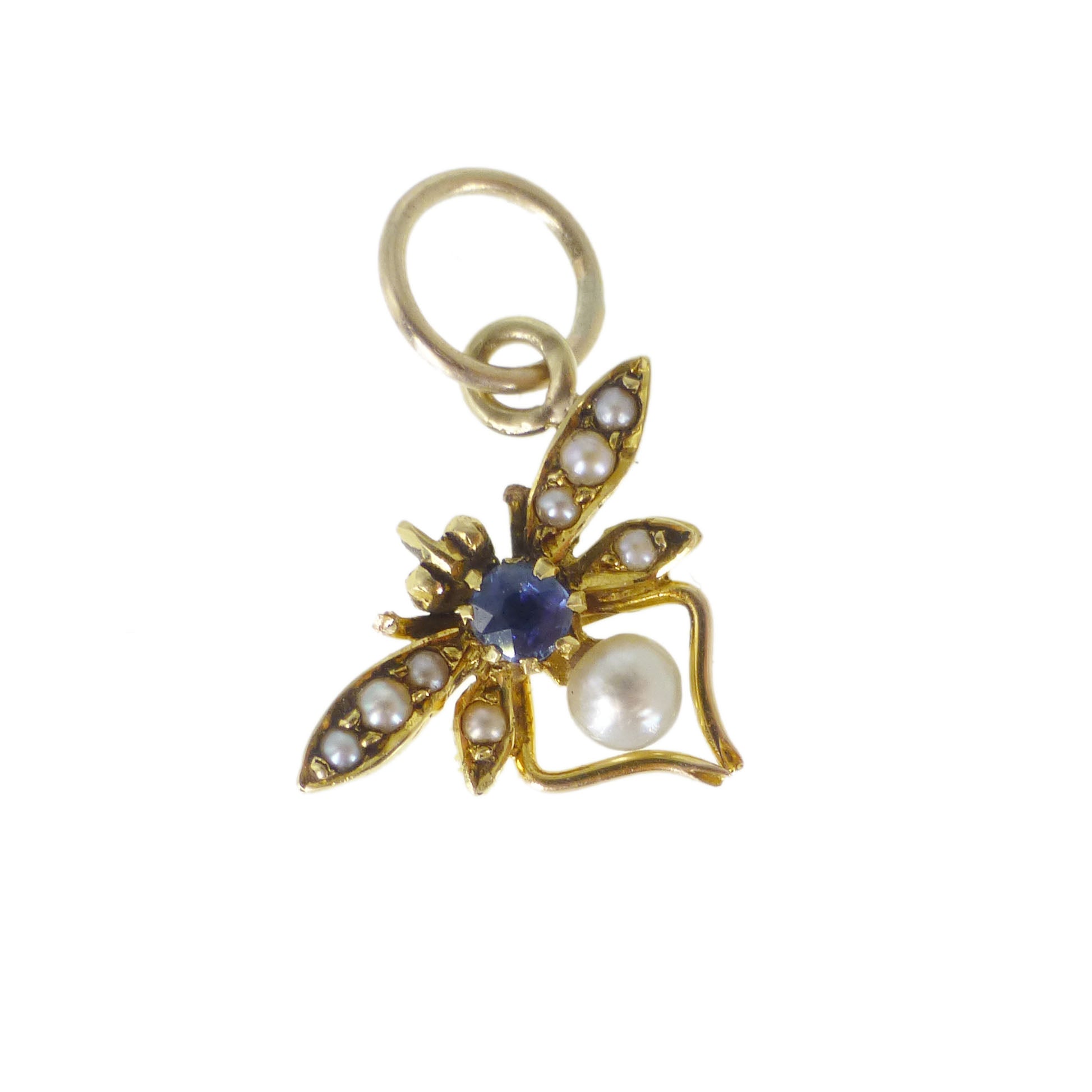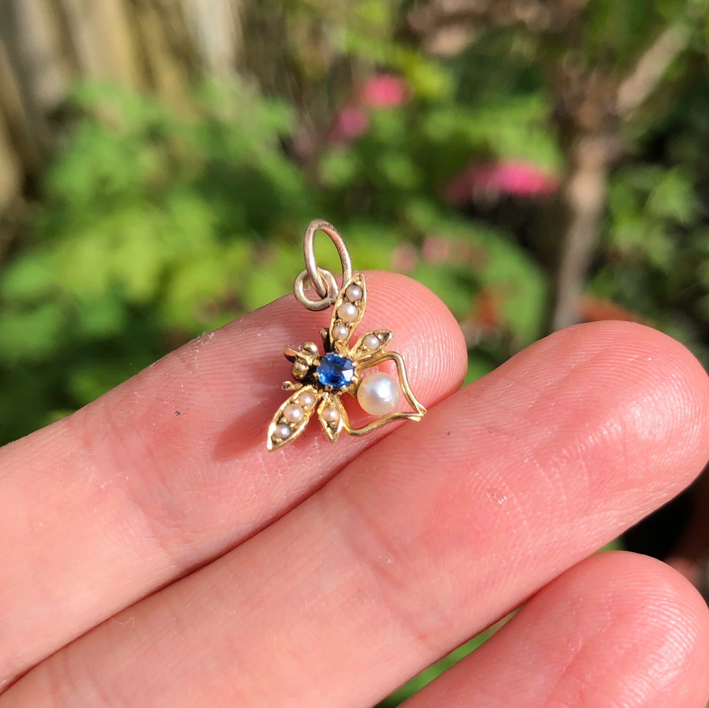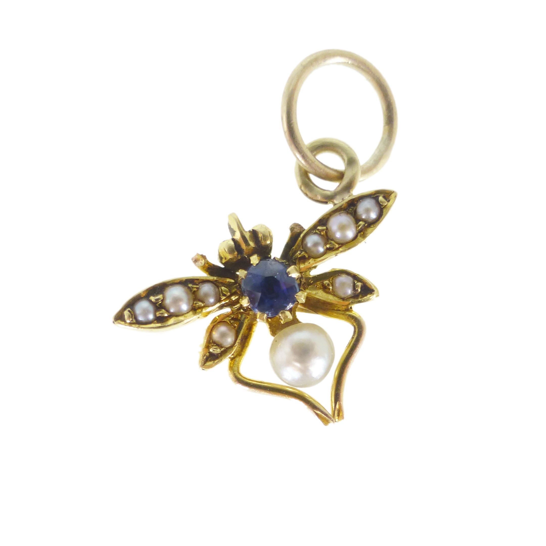 Antique Victorian 18ct Gold Blue Sapphire Pearl Insect Charm