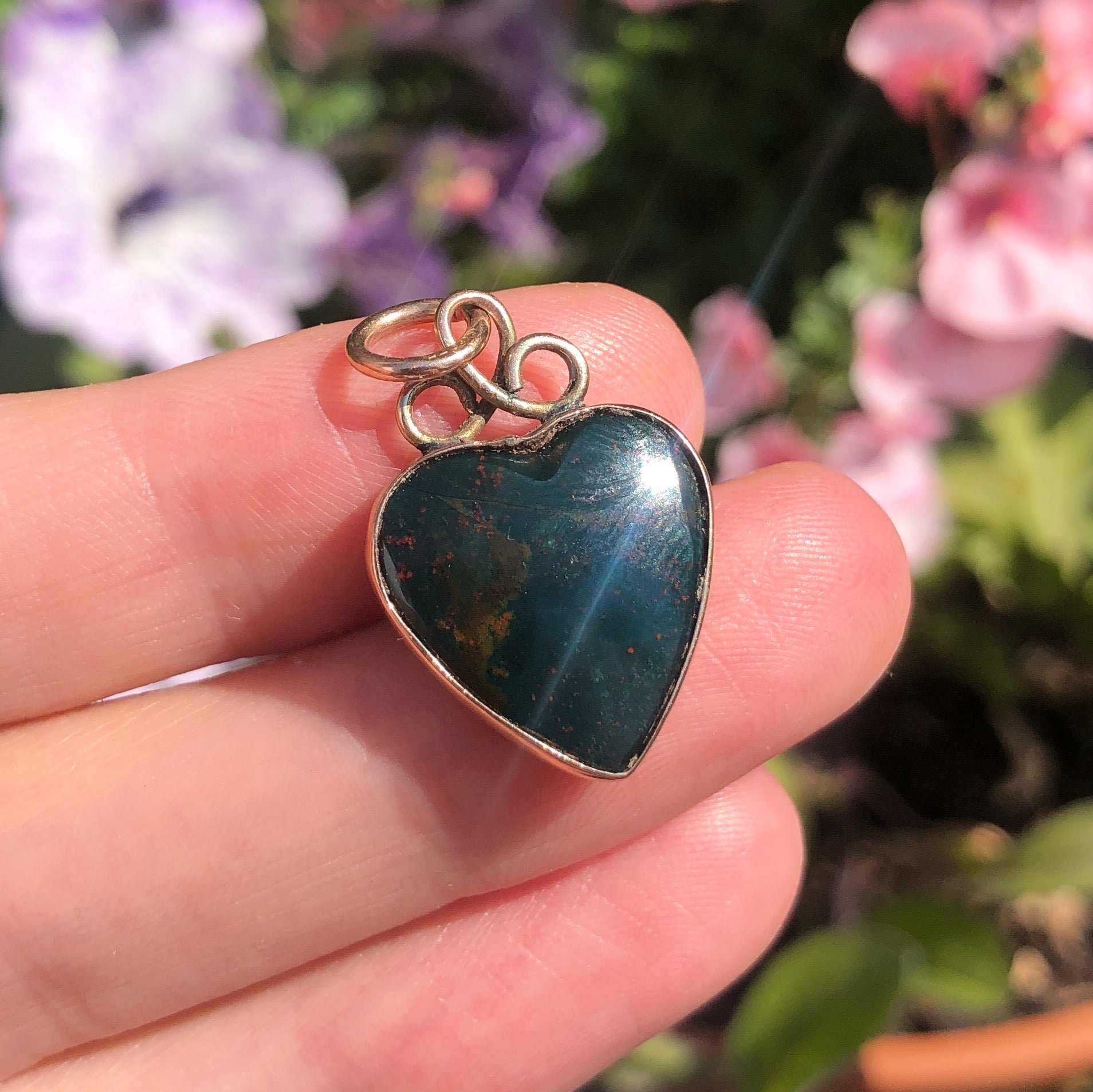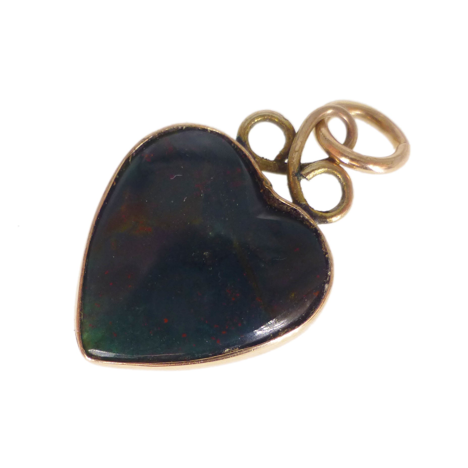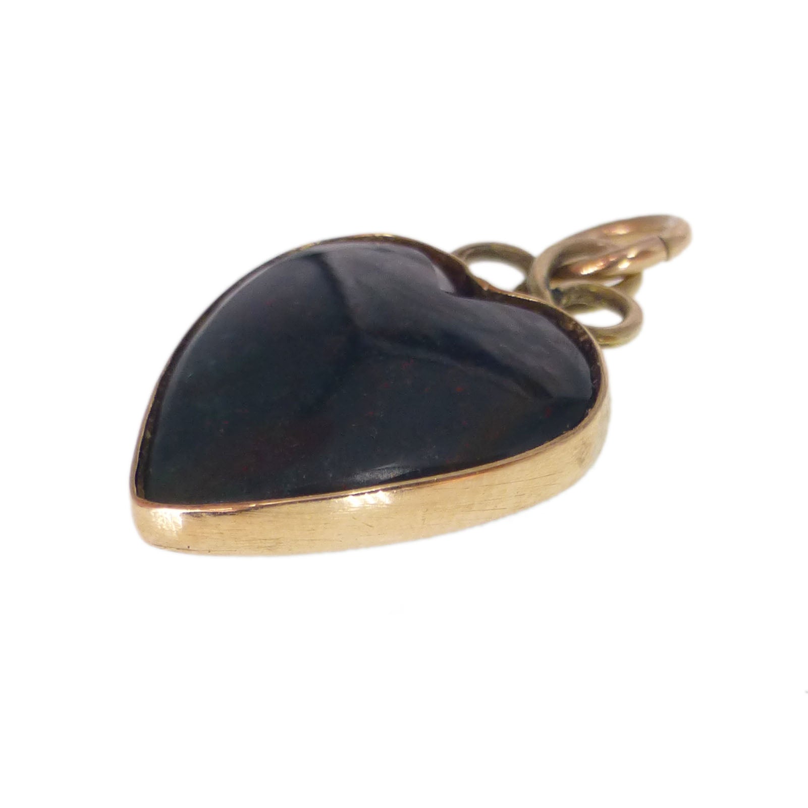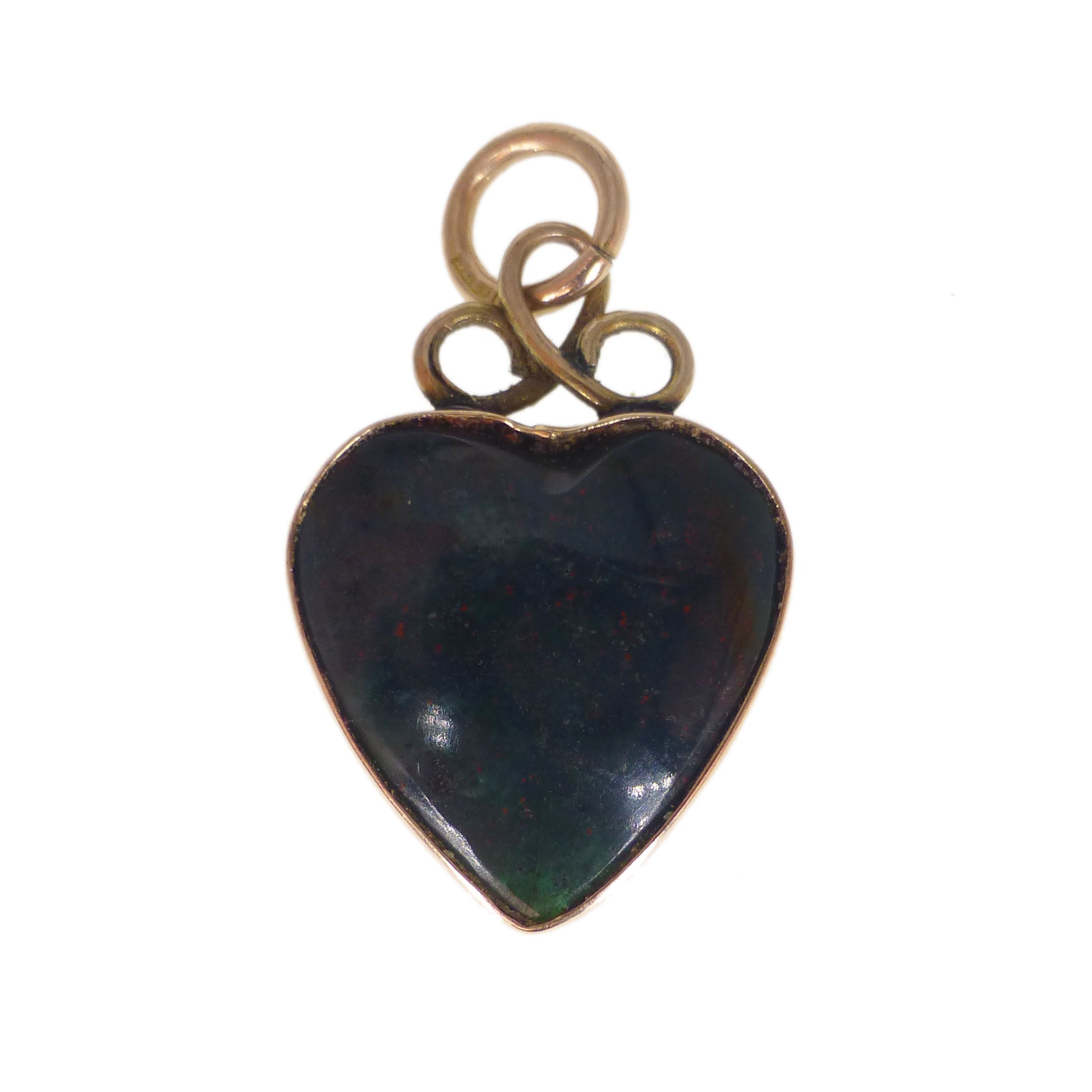 A beautiful antique charm featuring a carved bloodstone heart encased in a 9ct gold frame with a lovers knot top.