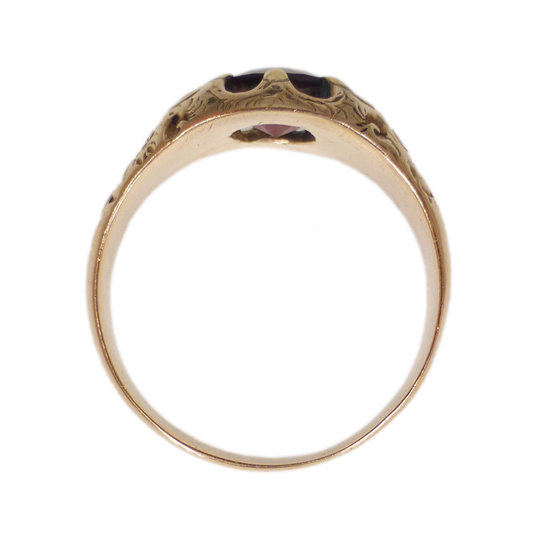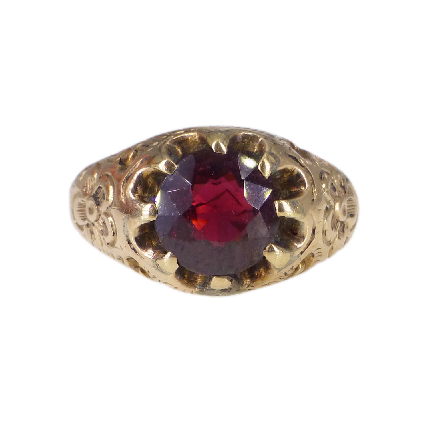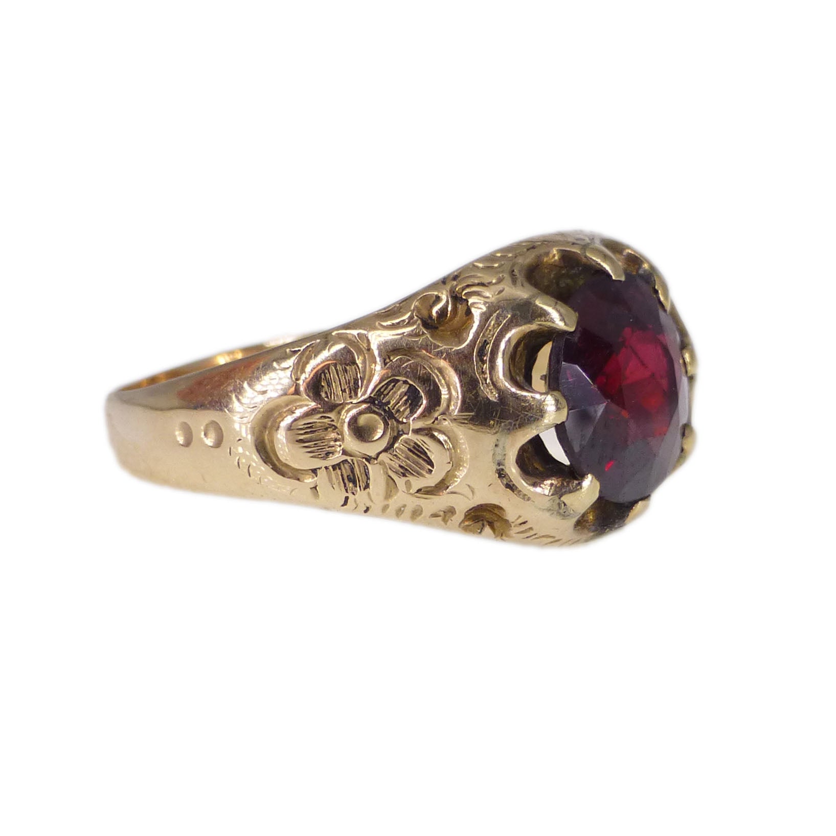 A beautiful antique gold posy ring dating to the Victorian period. The ring features a large flat cut garnet encased in an ornately engraved floral frame.