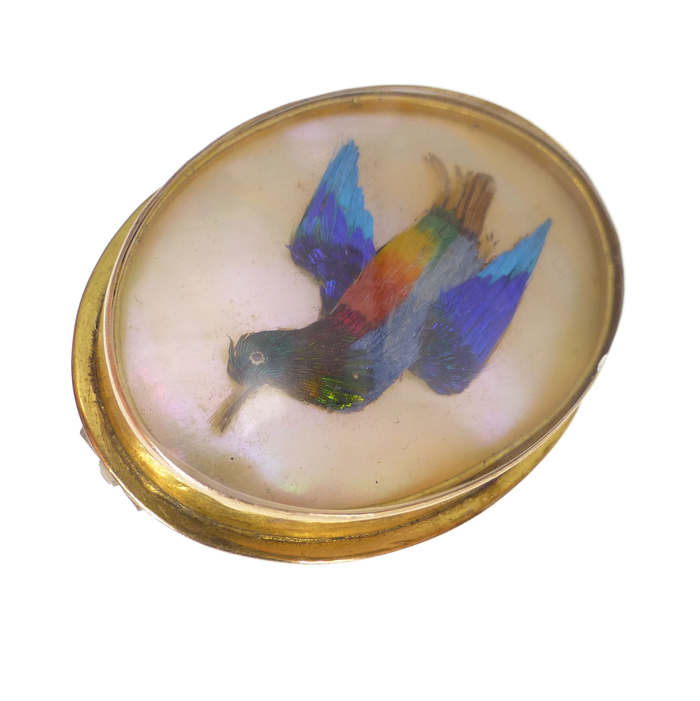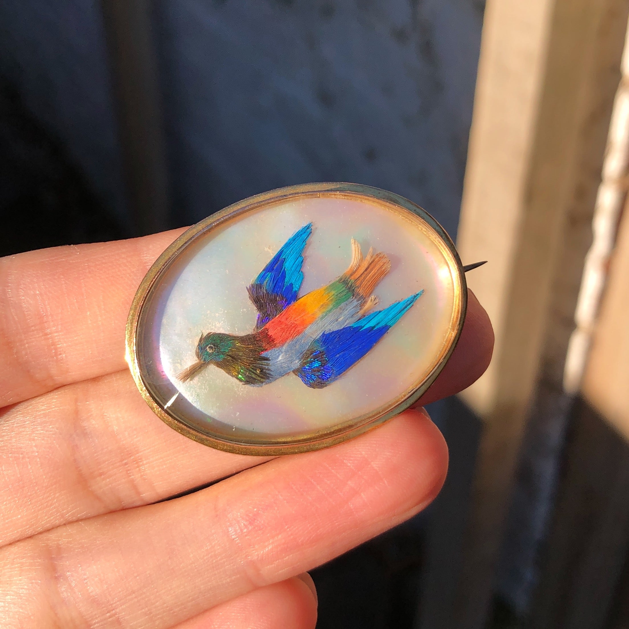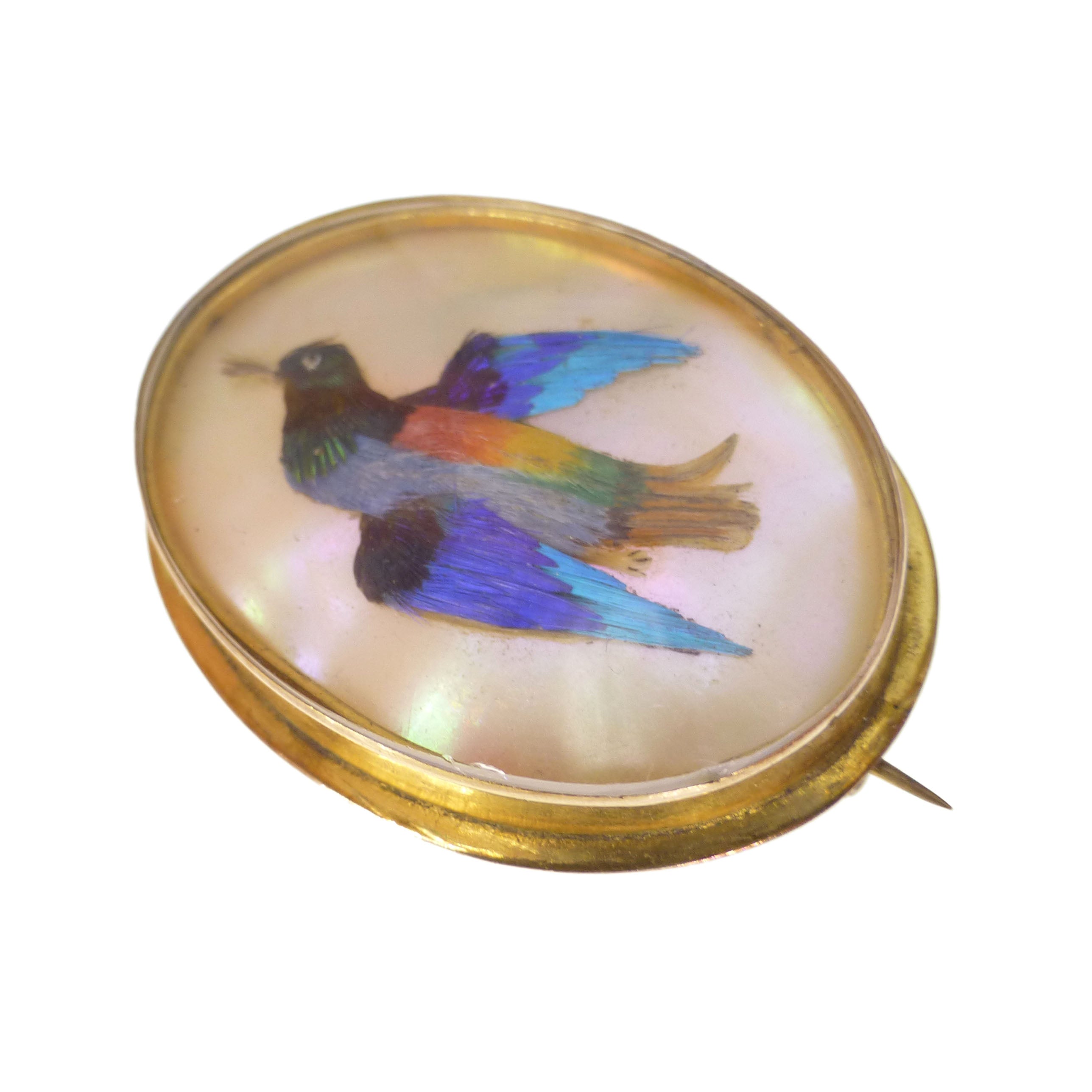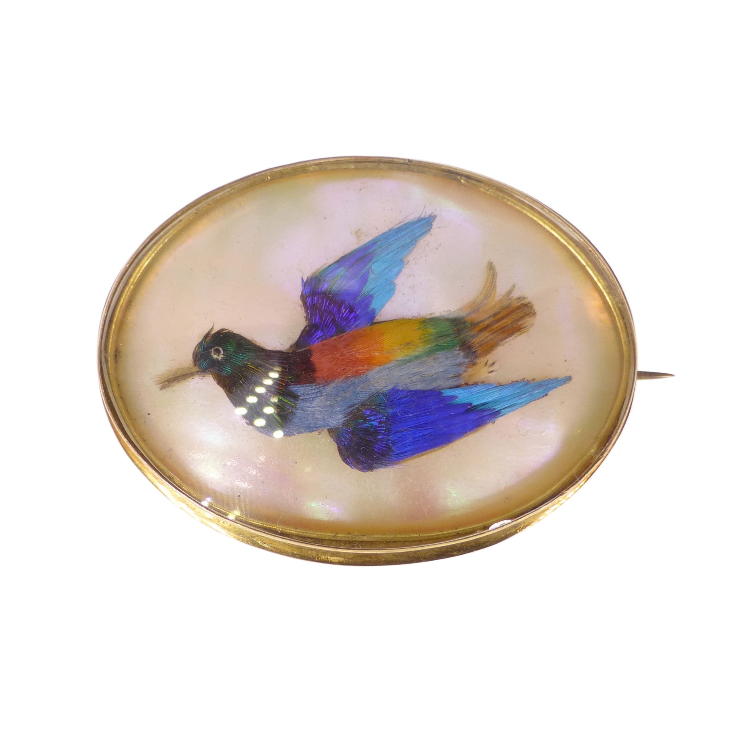 An incredible early Victorian brooch featuring a detailed bird in flight made from fine iridescent fibres of exotic bird feathers. The bird sits on a mother of pearl bade set into a 15 carat gold frame.