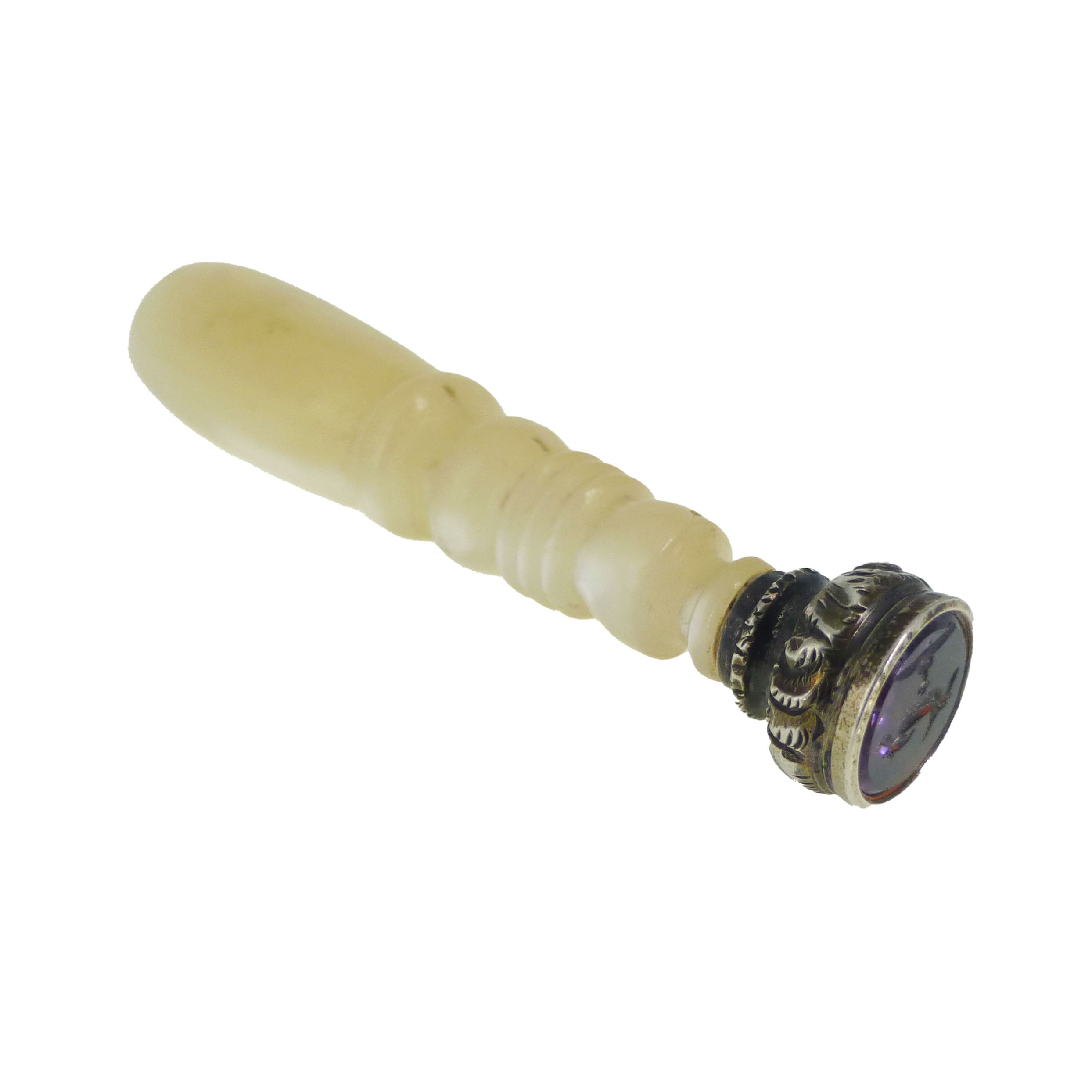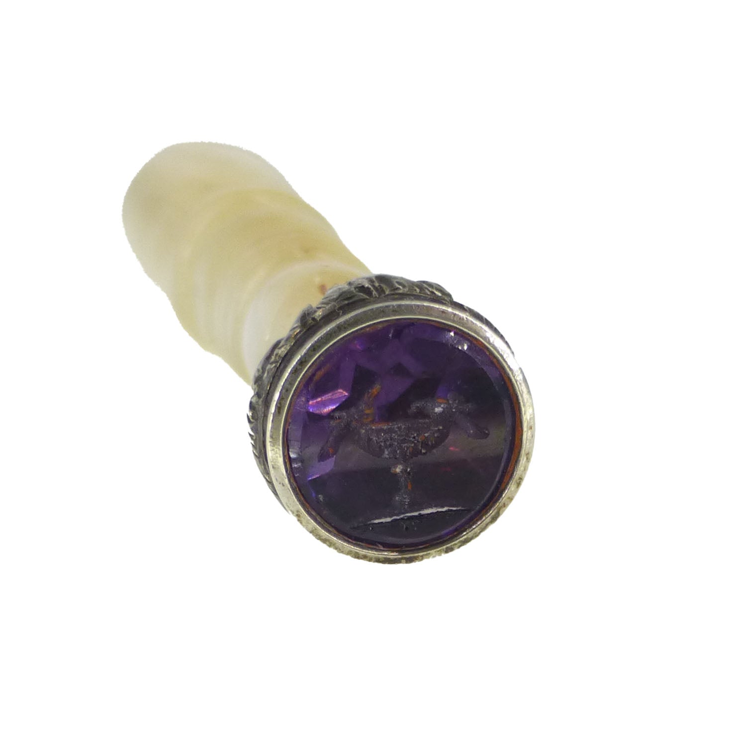 A lovely antique mother of pearl desk seal featuring a tiny purple glass intaglio carved with two birds perched on a chalice.