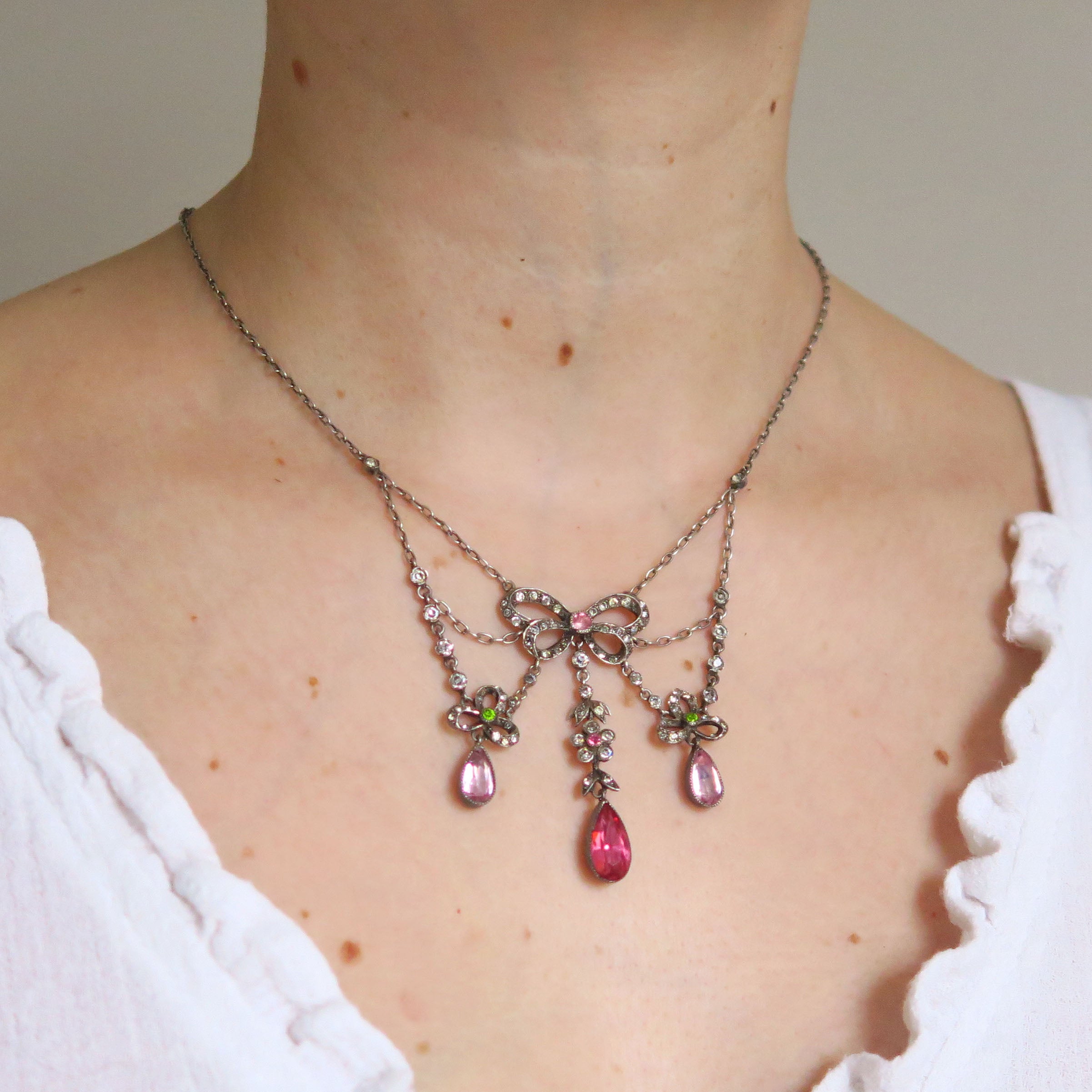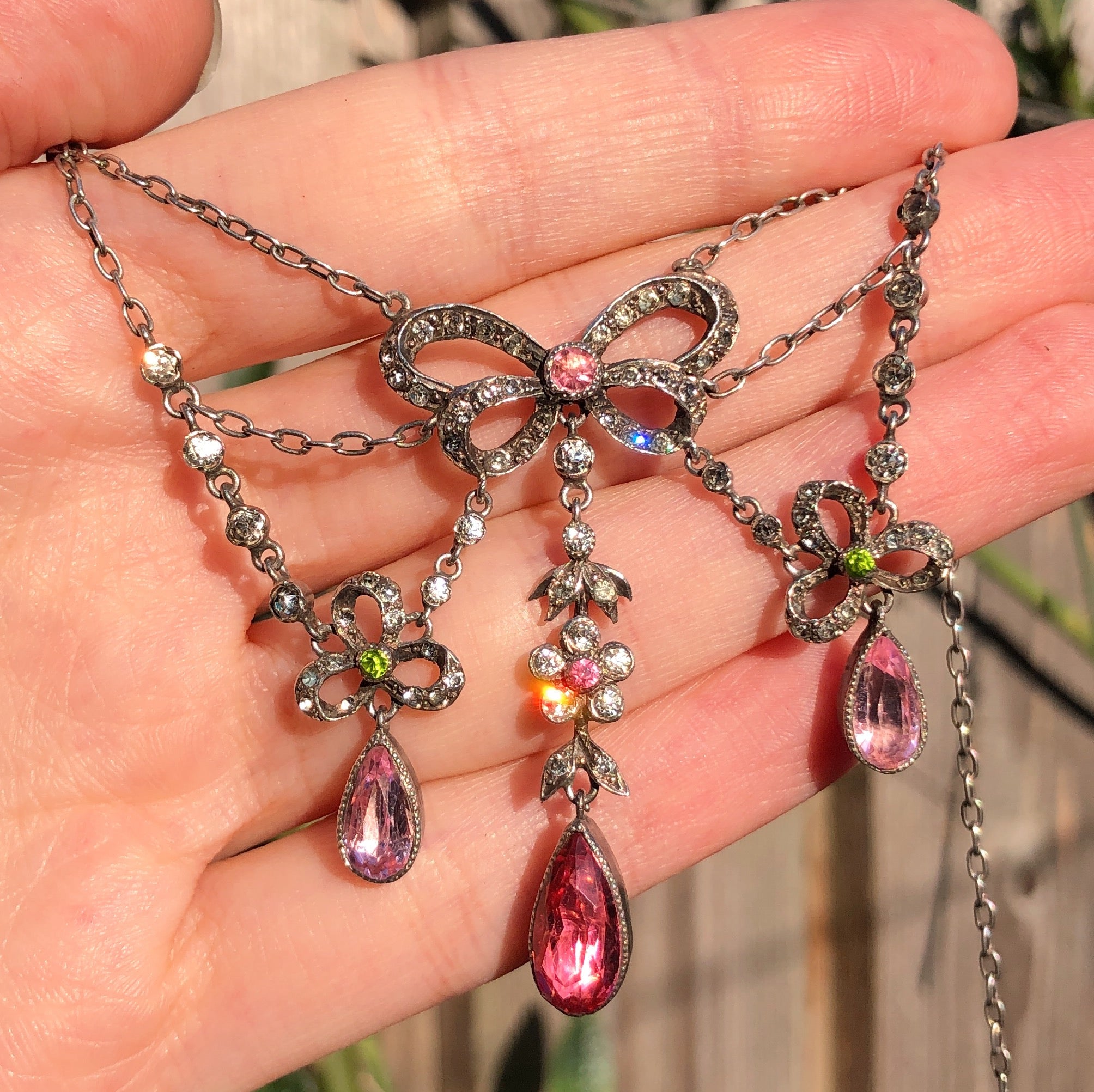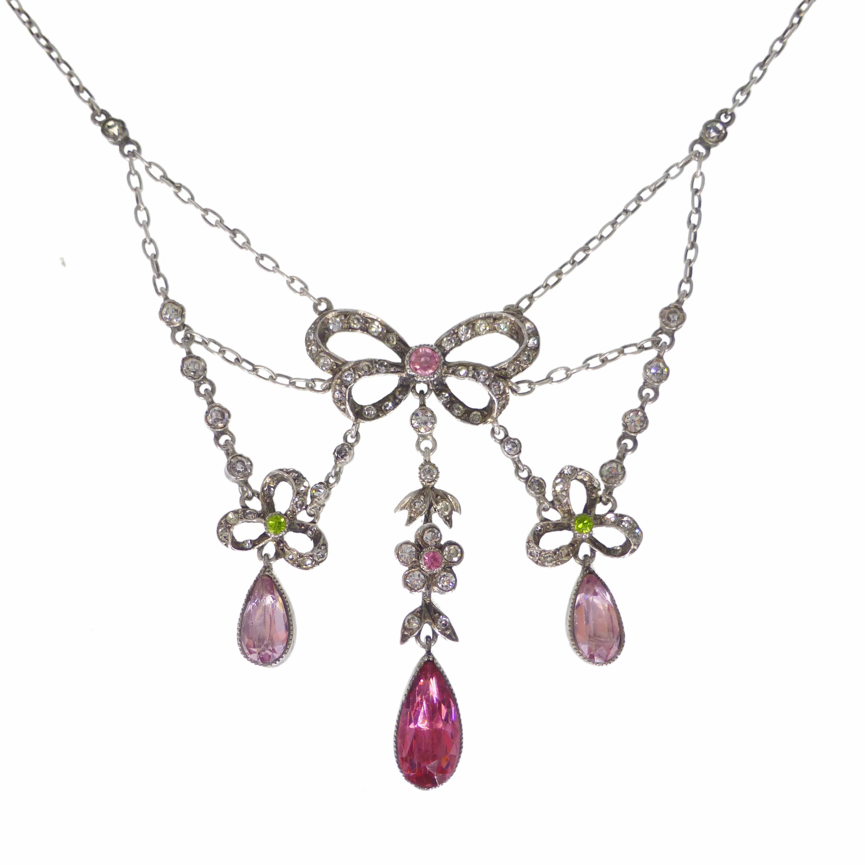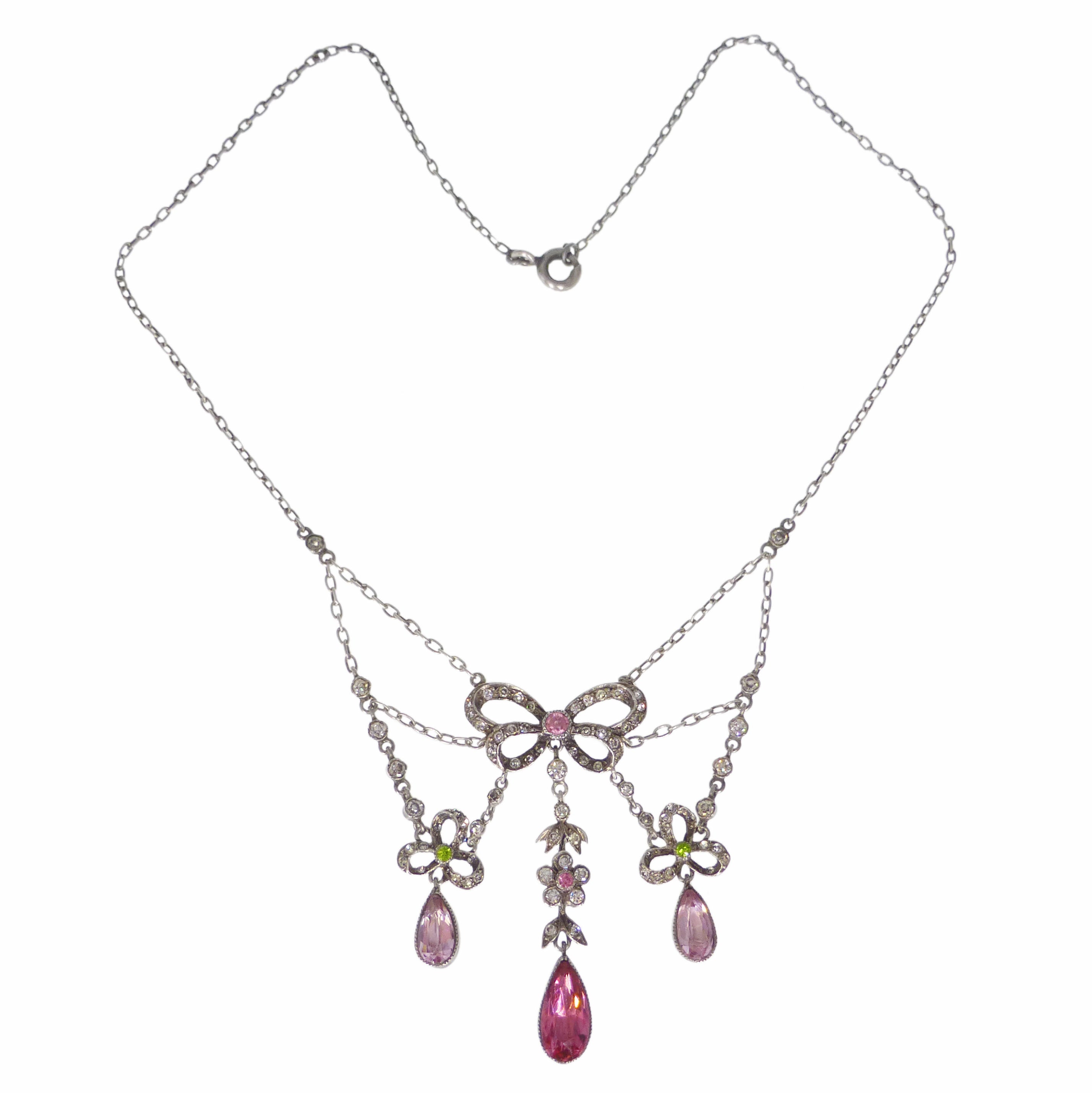Antique Edwardian Silver Green & Pink Paste Bow Necklace