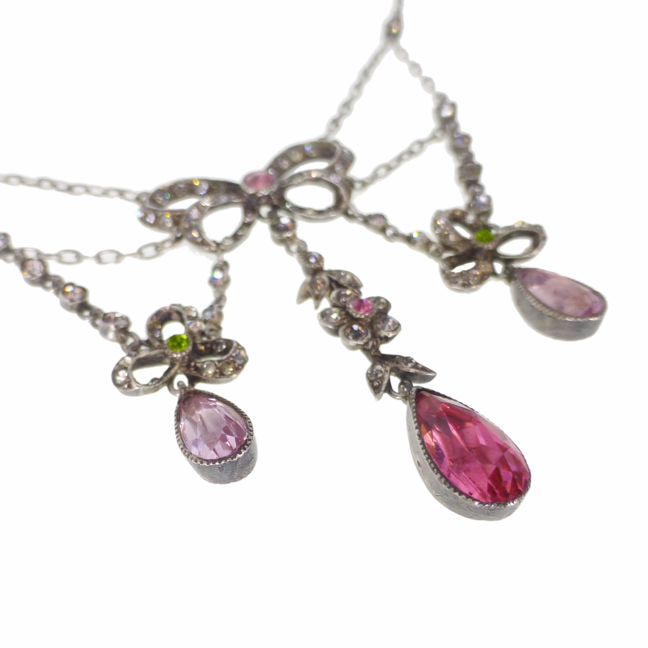 A wonderful antique Edwardian silver paste necklace featuring a delicate bow motif with graduated pink and green glass drops.