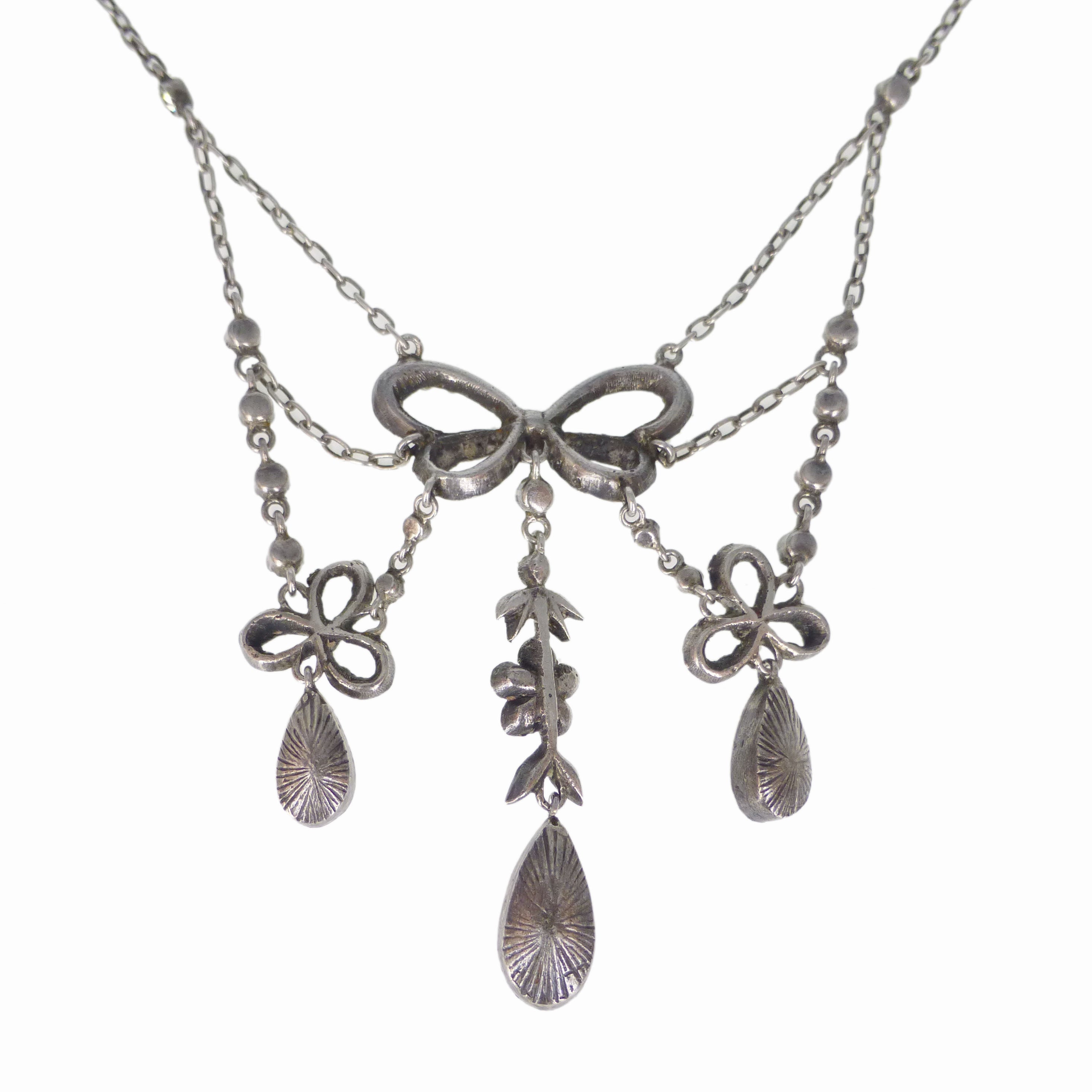 The necklace is not hallmarked but tests as silver and is most likely English in origin.