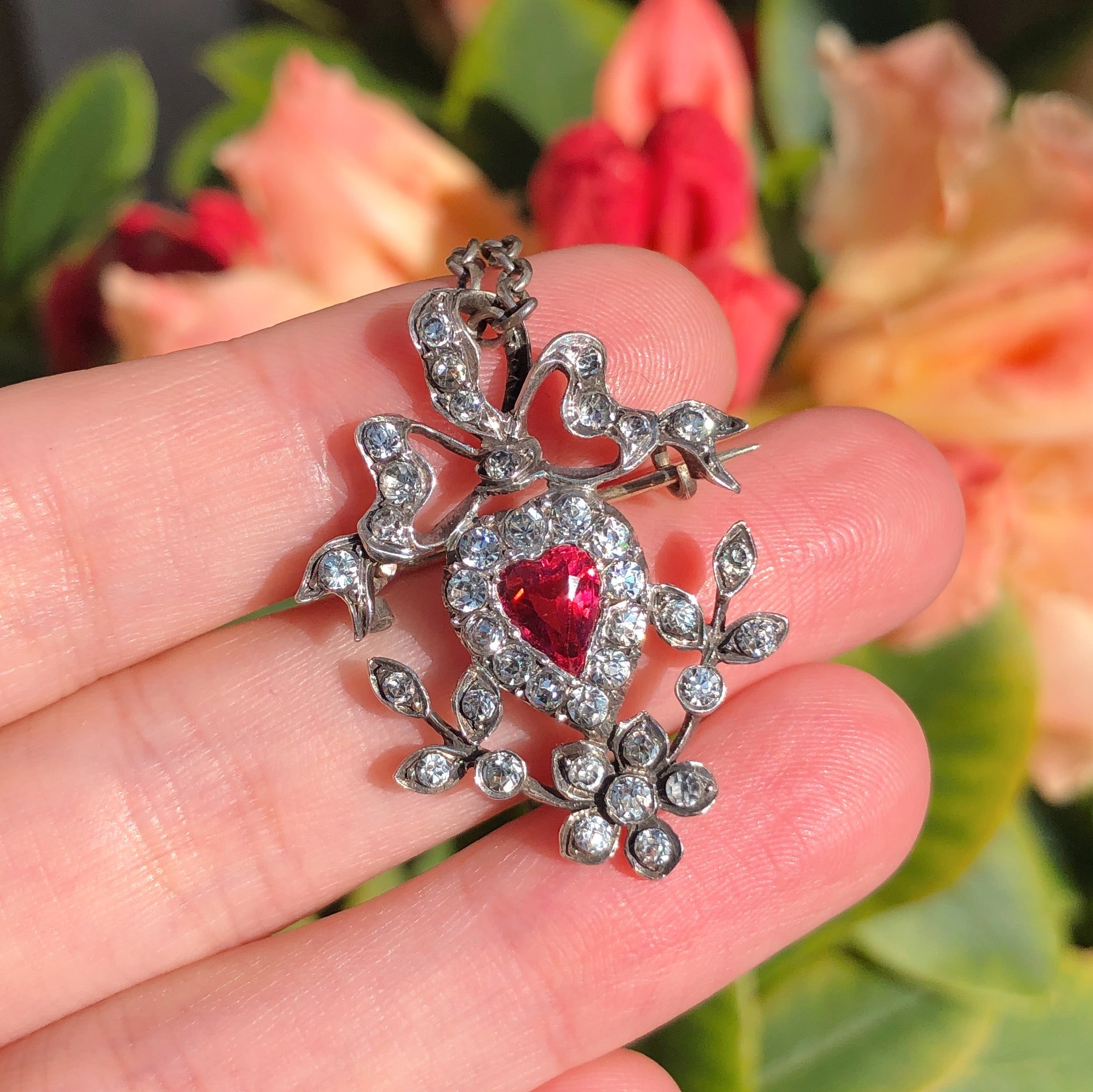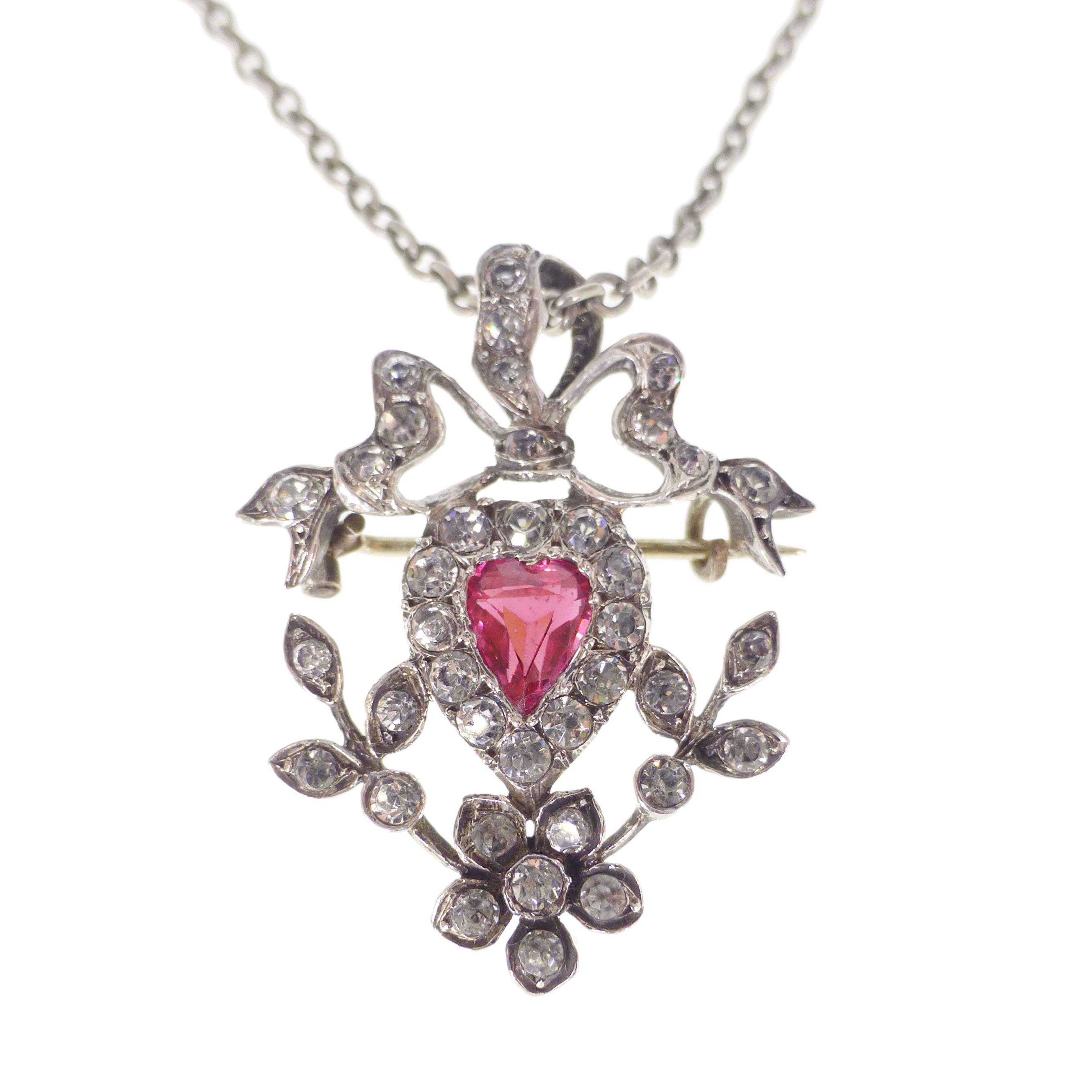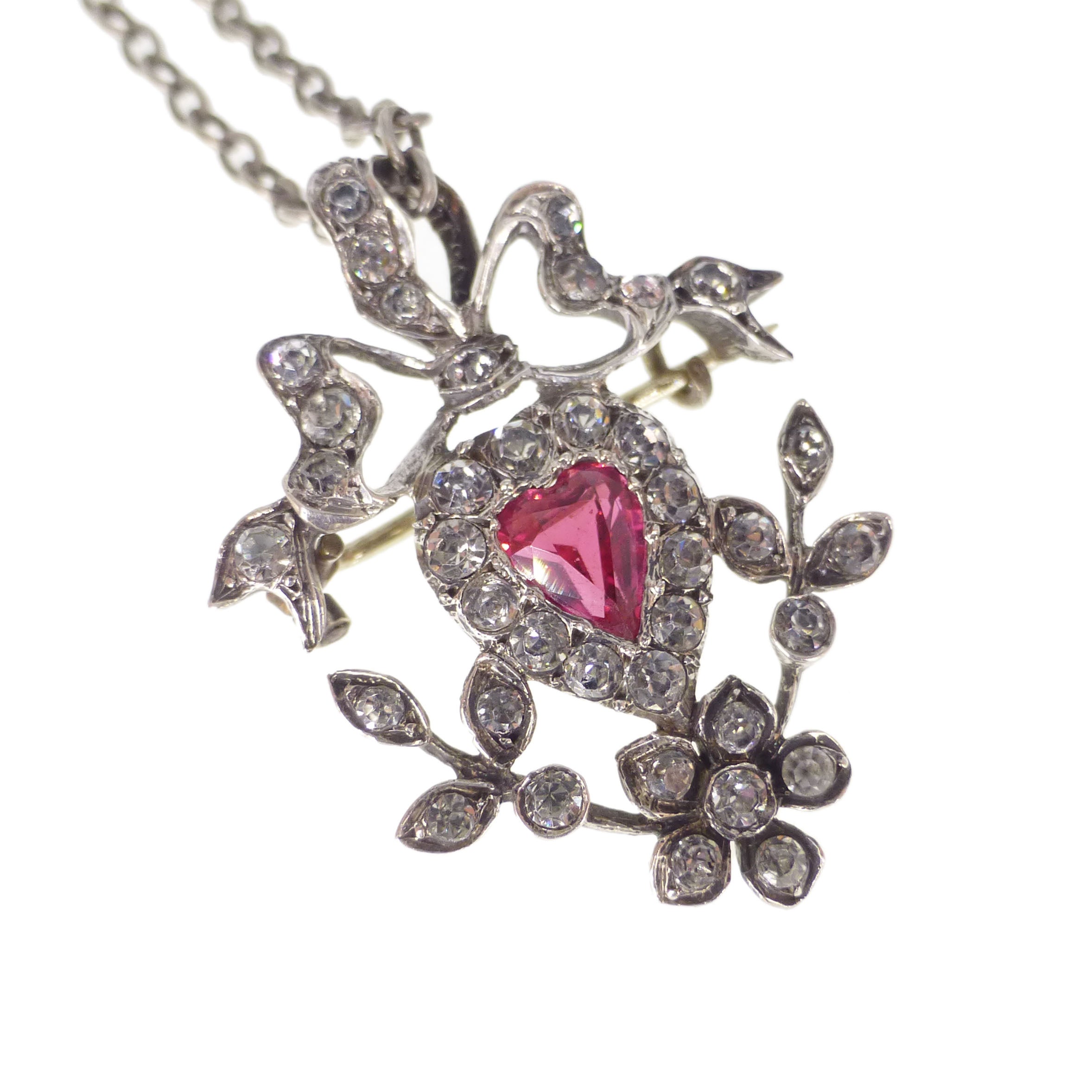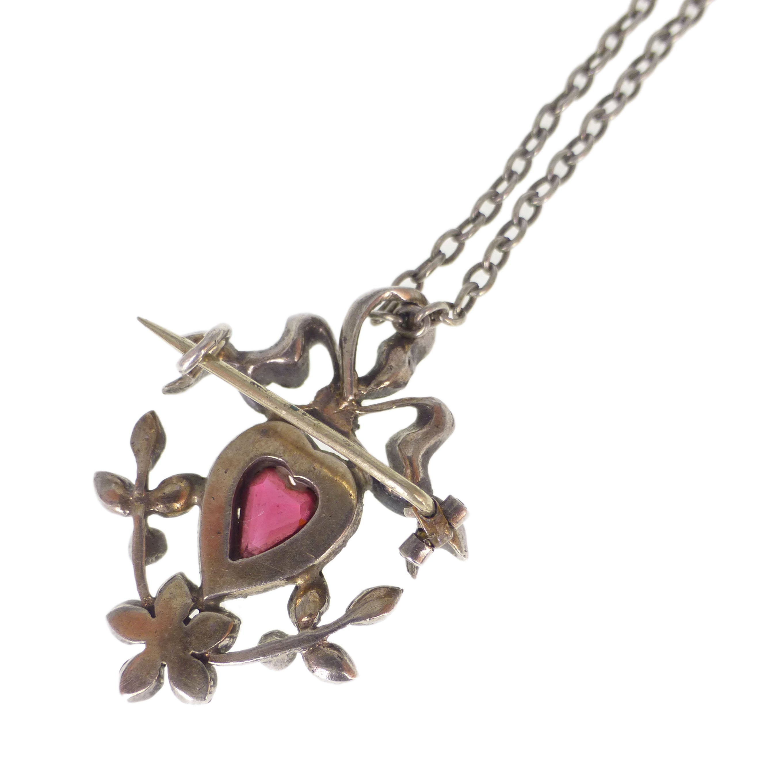 Antique Edwardian Silver Paste Pink Heart Pendant Brooch