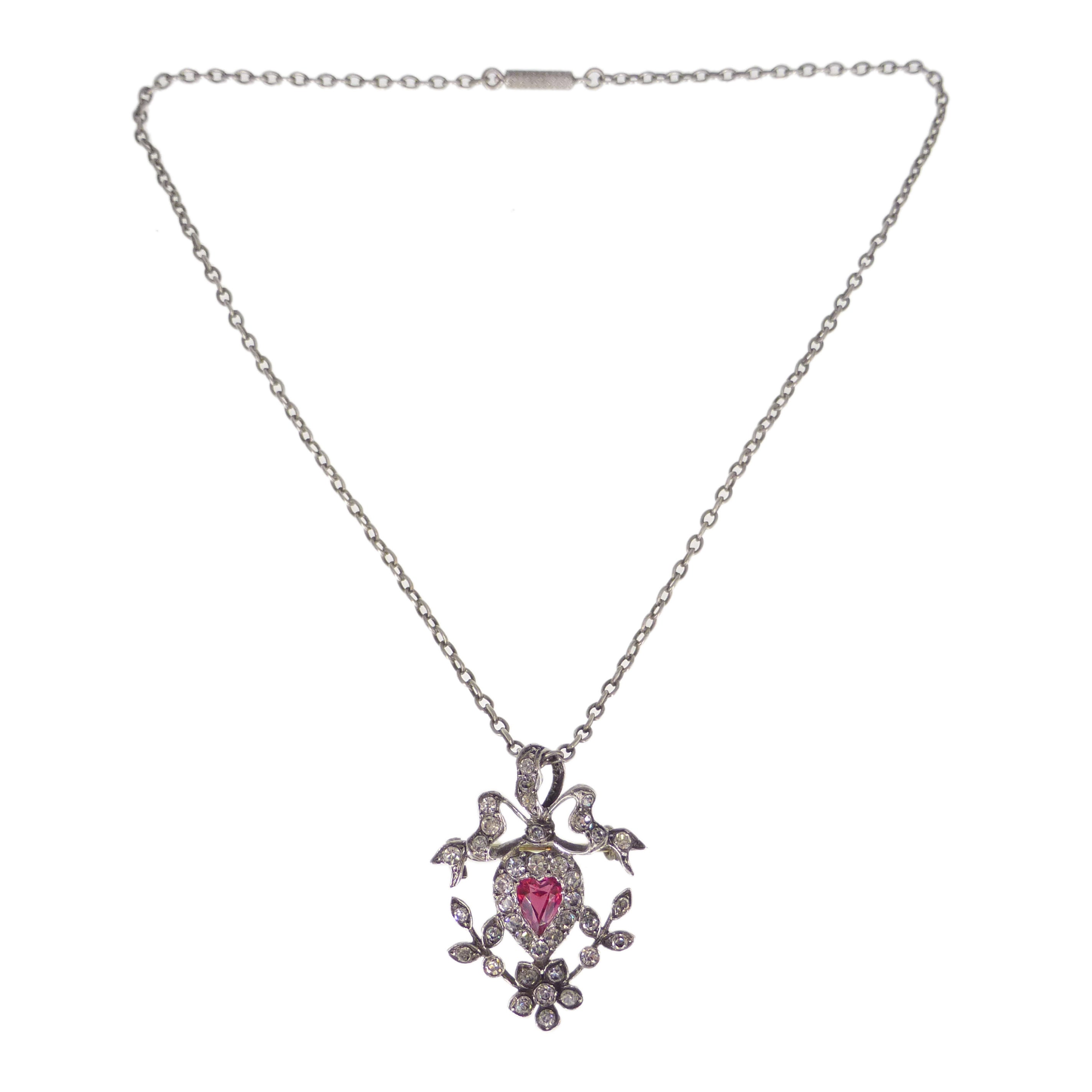 The pendant features a vibrant pink heart shaped stone at its centre with a bow top and floral design studded with clear paste stones.