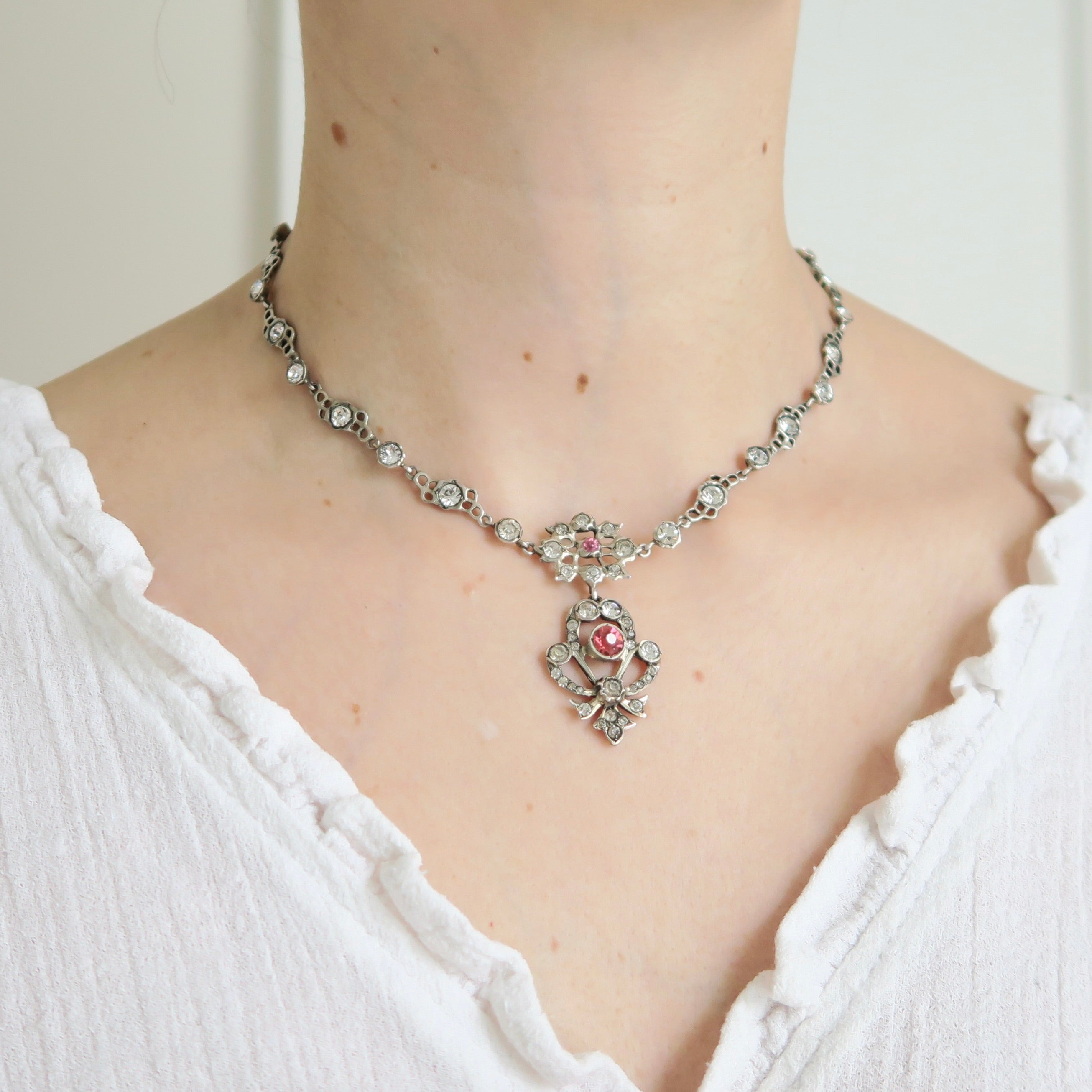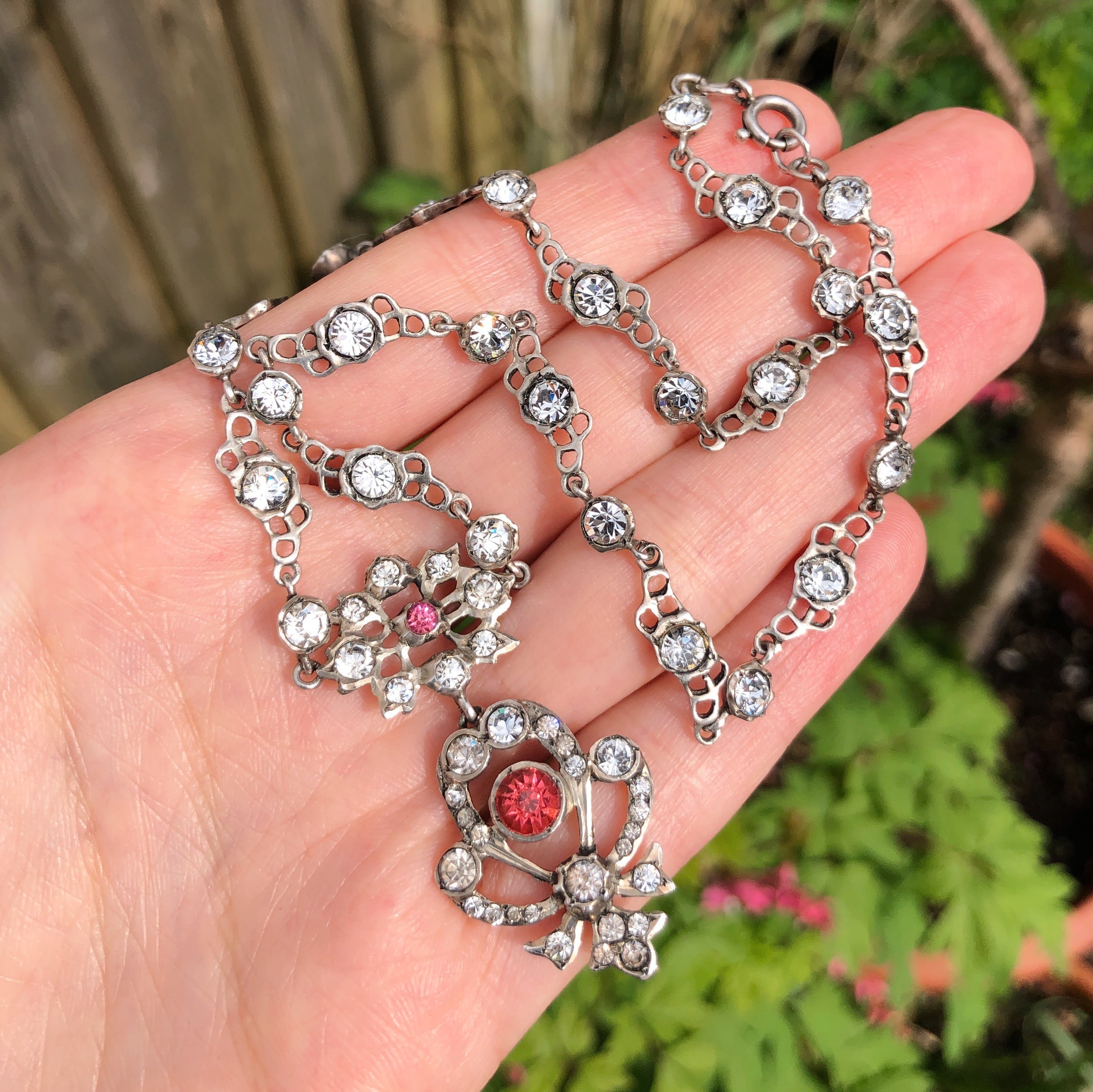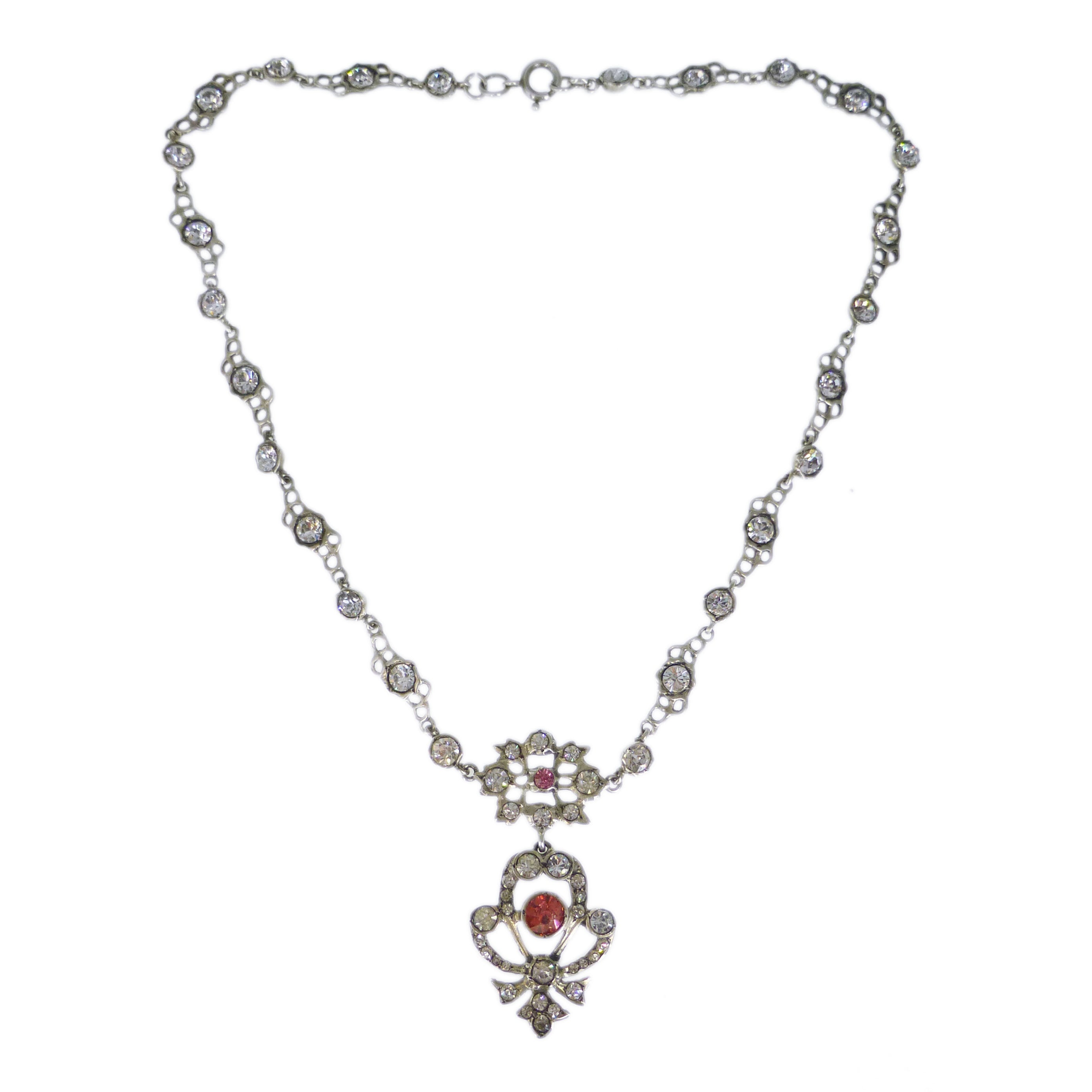 A lovely antique silver necklace dating to the Victorian period. The necklace features interlinked silver panels set with sparkling clear paste stones with an ornate drop featuring pink accent stones.