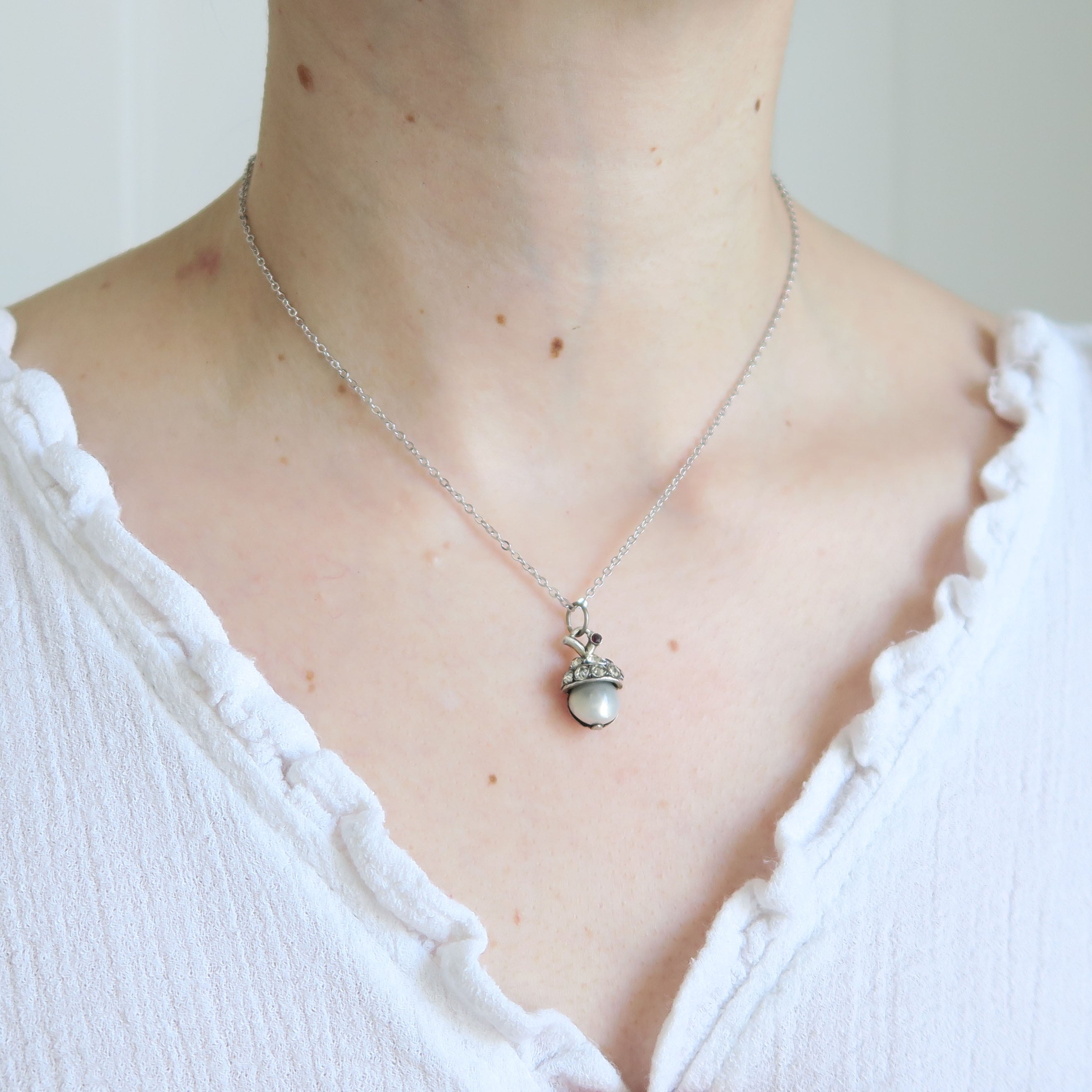 A sweet little antique silver acorn charm set with a lovely glass pearl stone with a paste top.