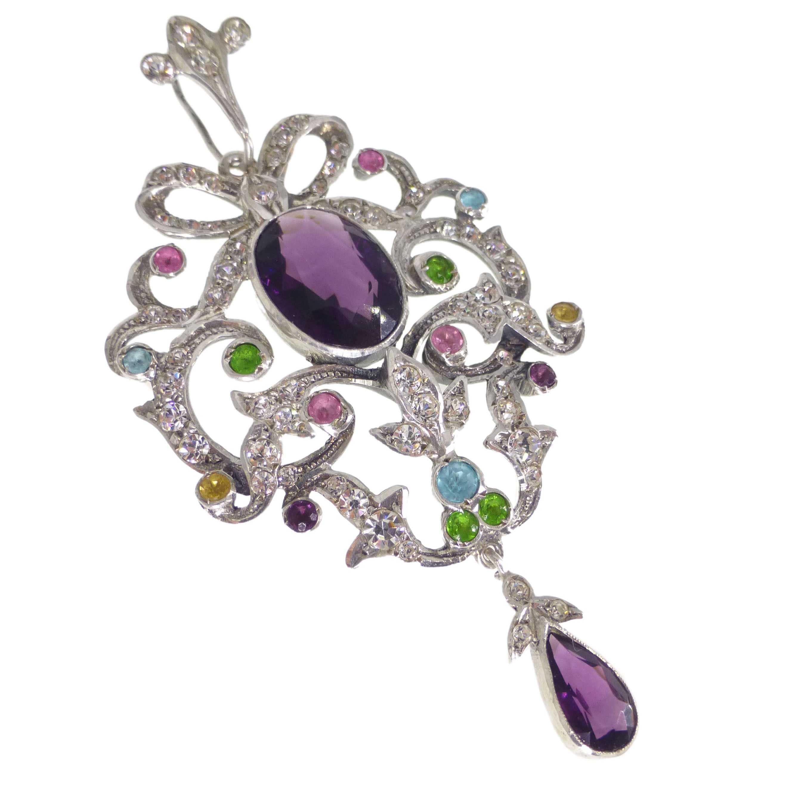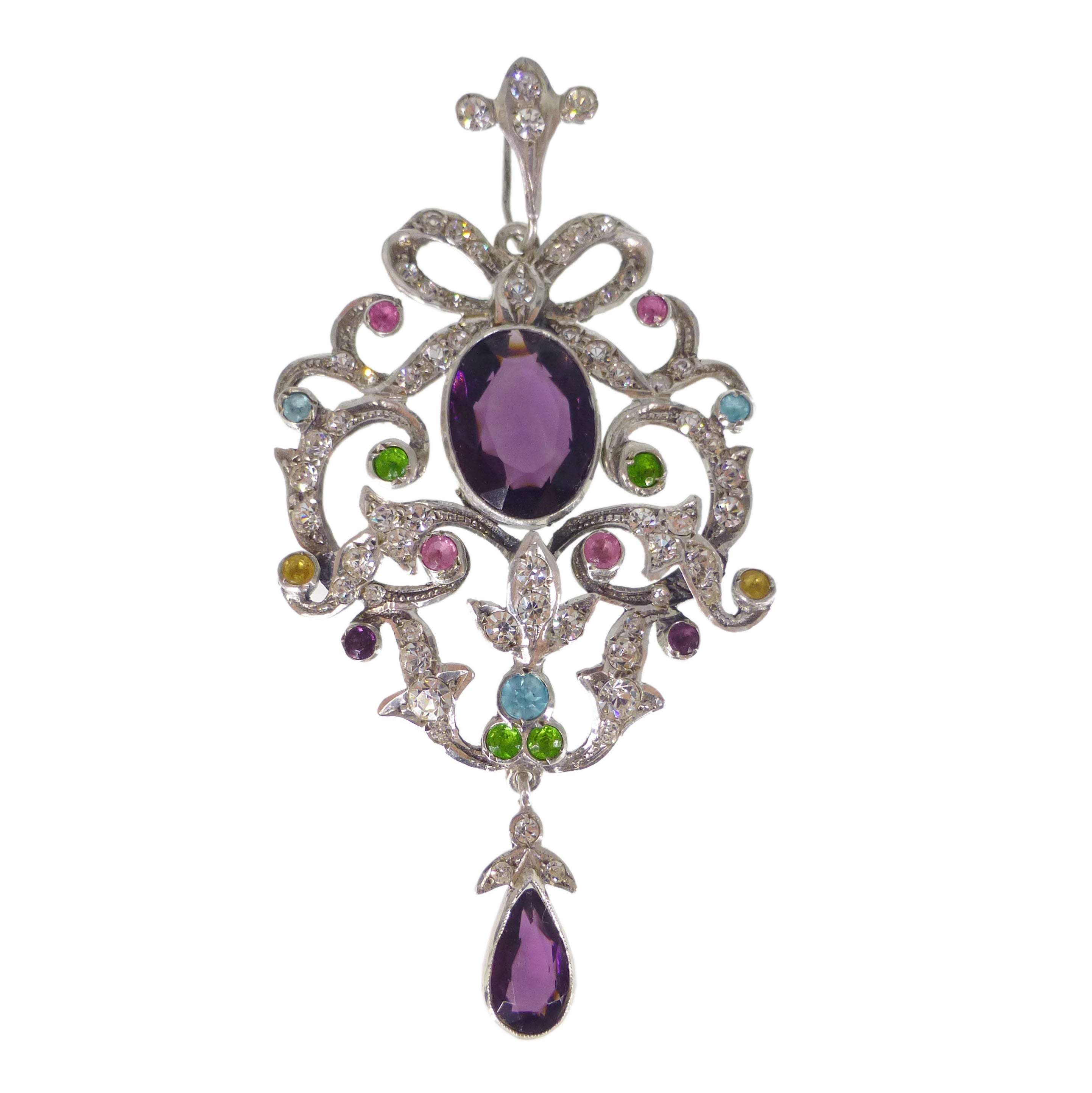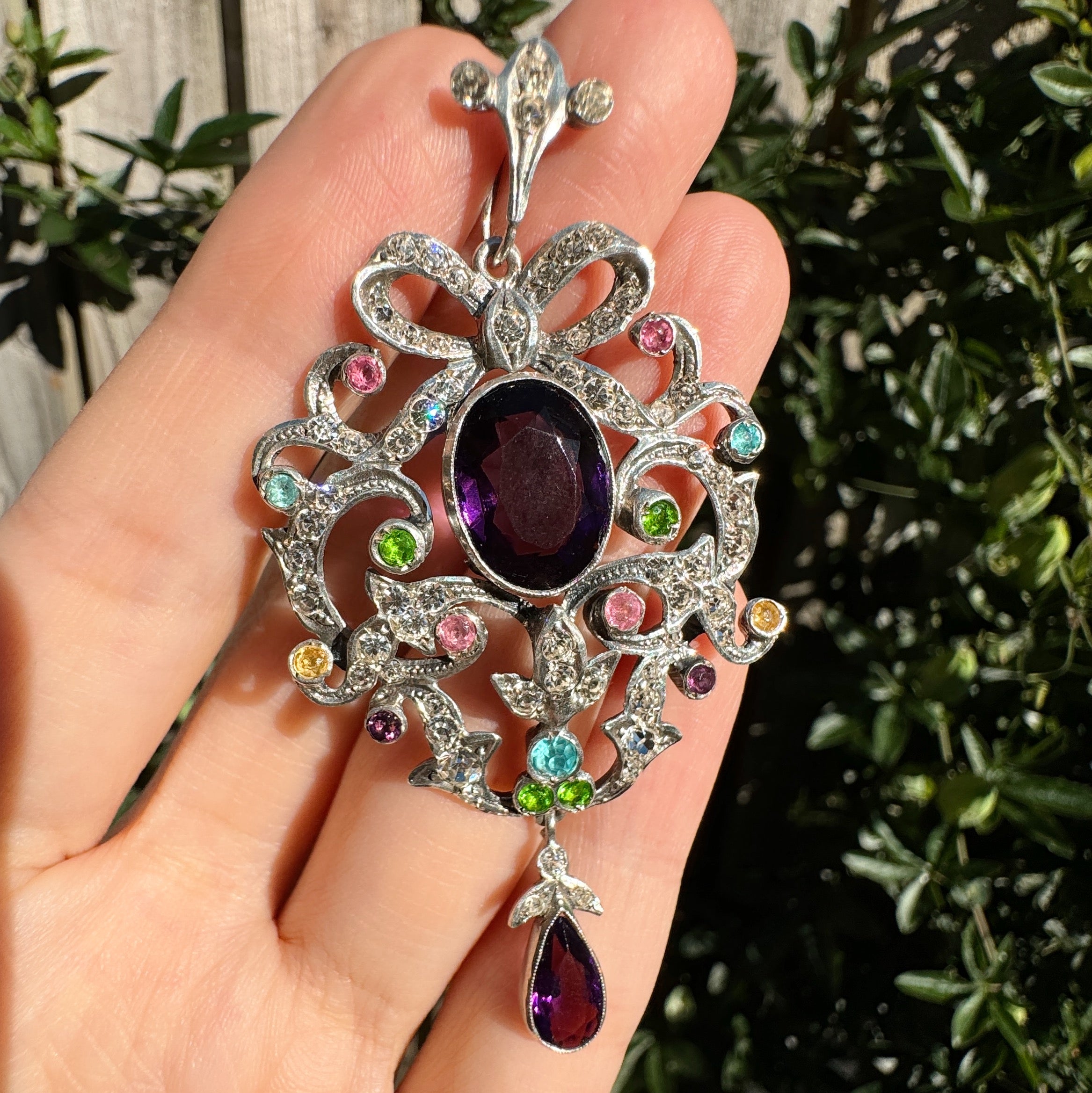 A truly exceptional antique silver pendant featuring a large faceted purple stone framed by colourful paste accents. The pendant features lovely bow detailing with a matching paste top.