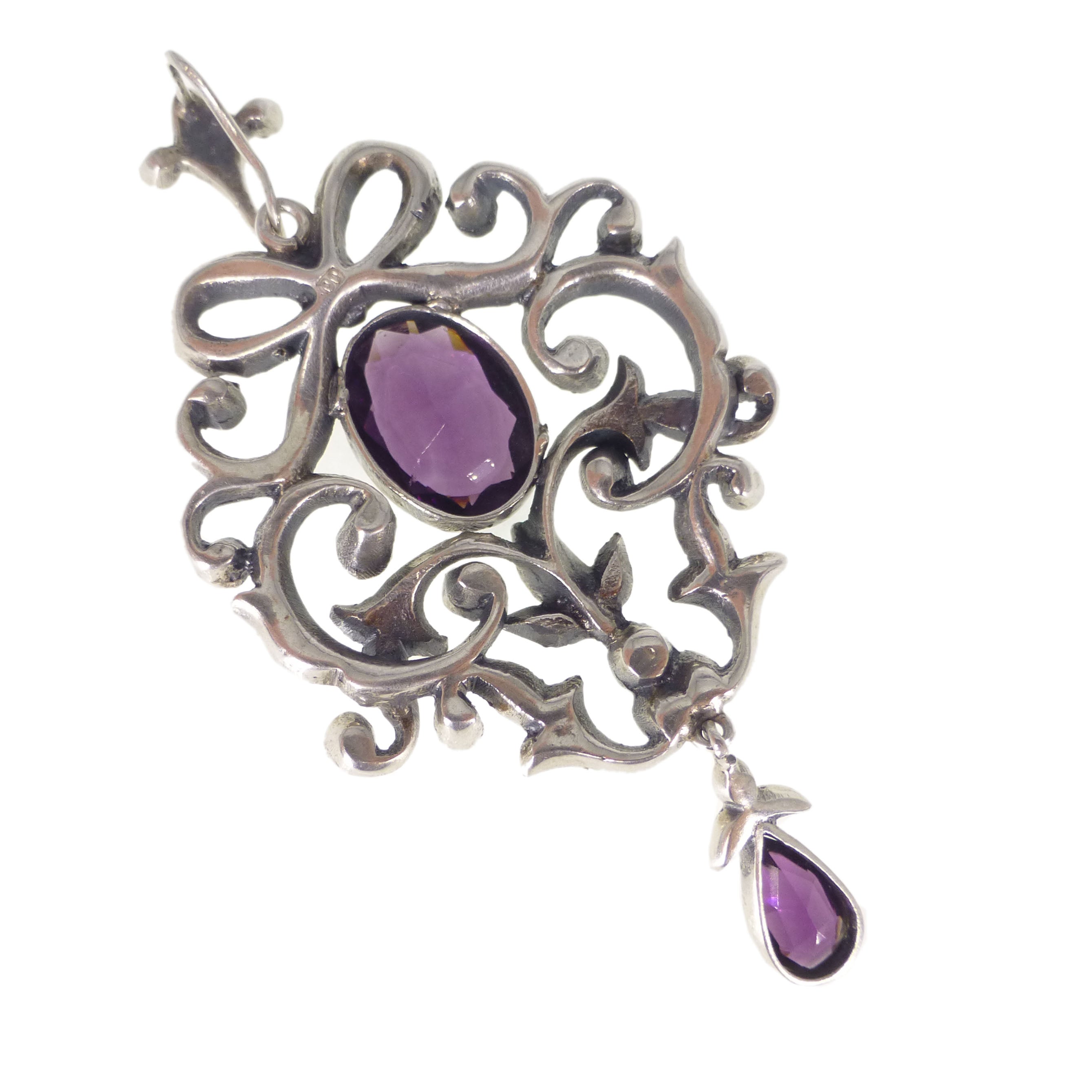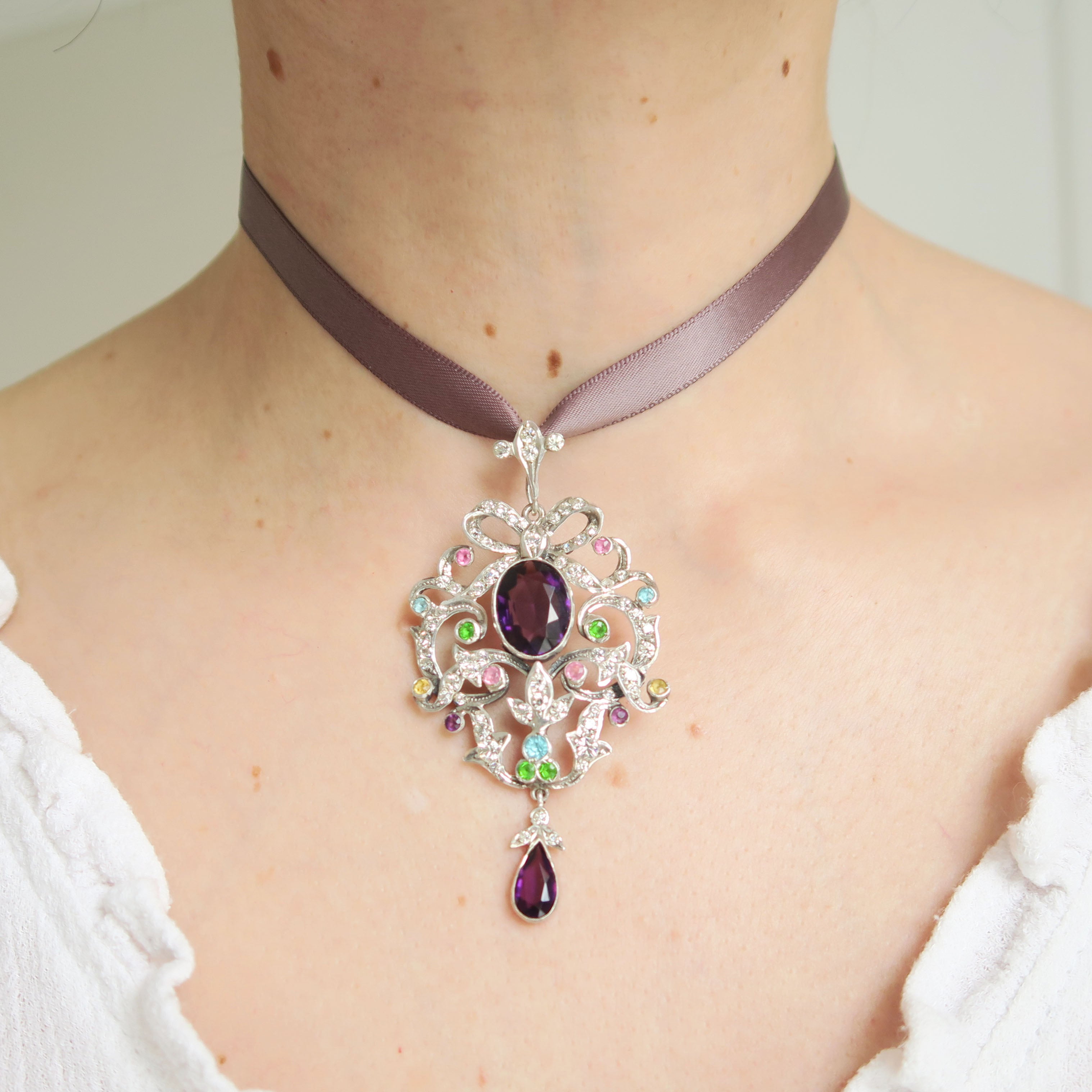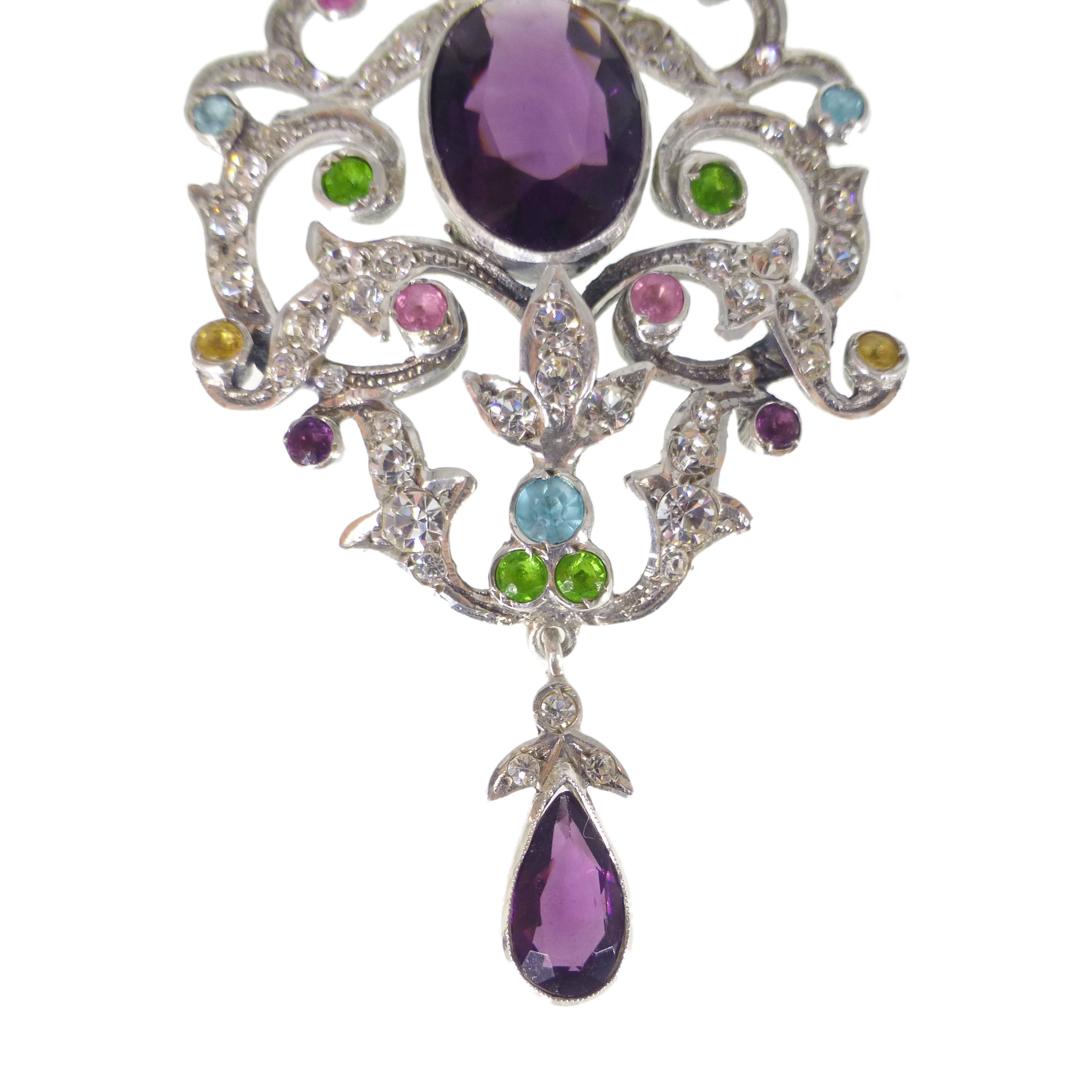 A truly exceptional antique silver pendant featuring a large faceted purple stone framed by colourful paste accents. The pendant features lovely bow detailing with a matching paste top.