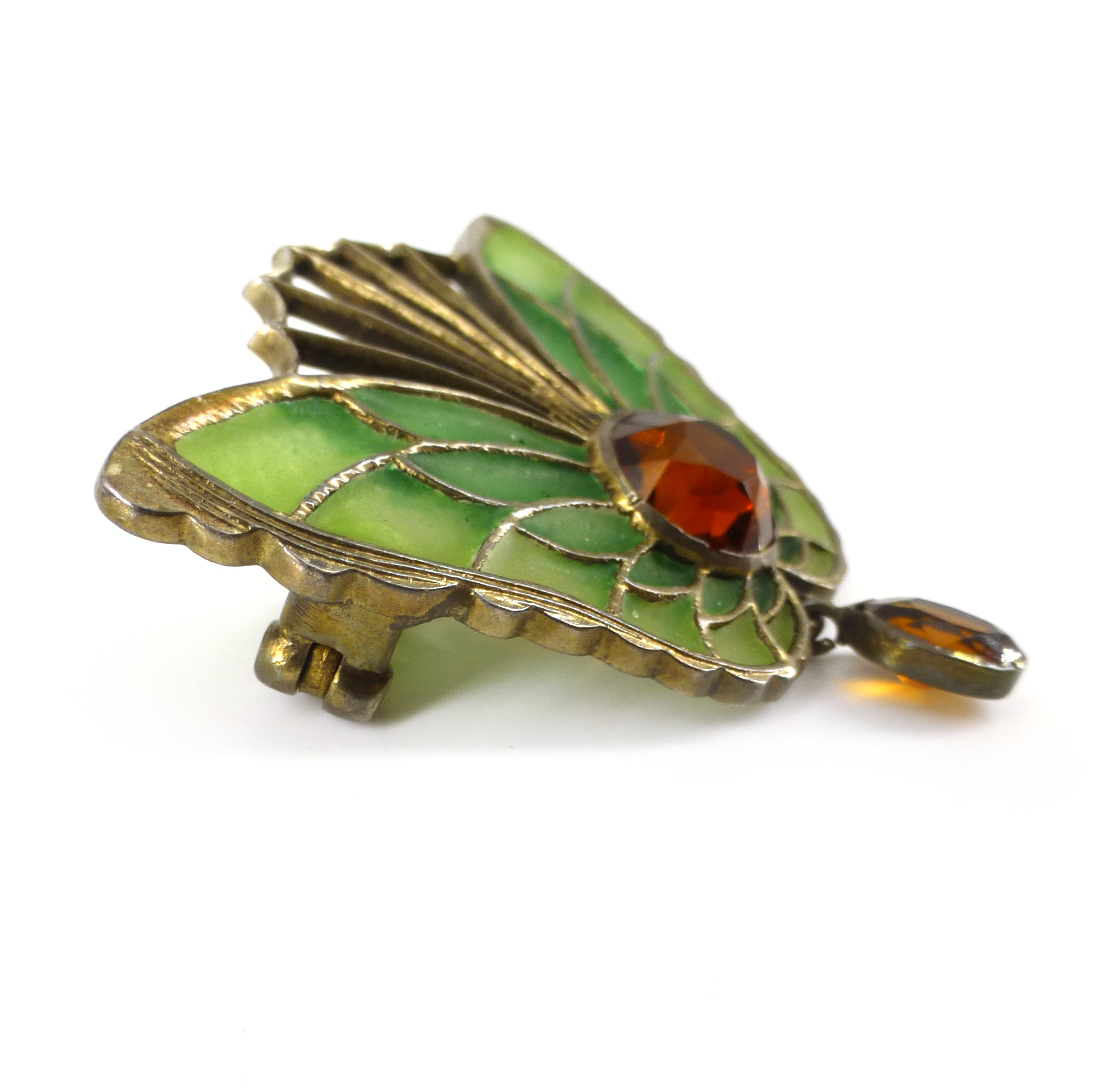The butterfly features green plique-à-Jour glass wings that have a lovely gradient to them with a large faceted amber glass centre stone and matching drop.