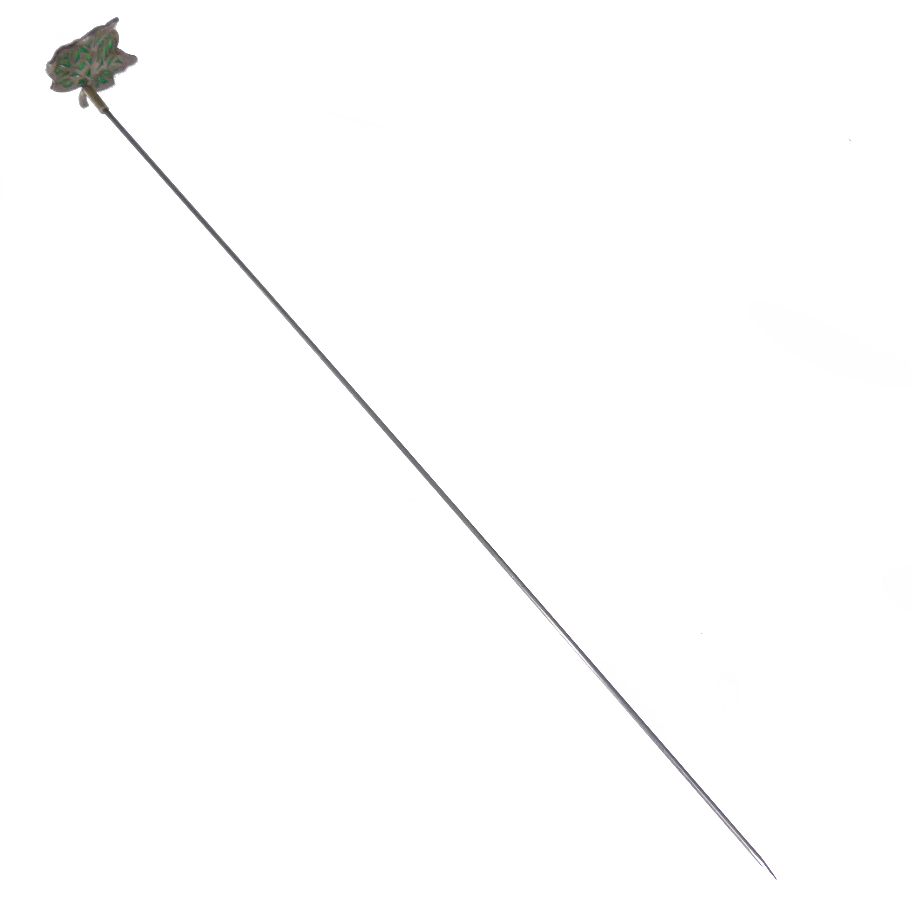 A wonderful antique hat pin, most likely German in origin. The pin features a detailed plique a jour ivy panel in vibrant green tones.