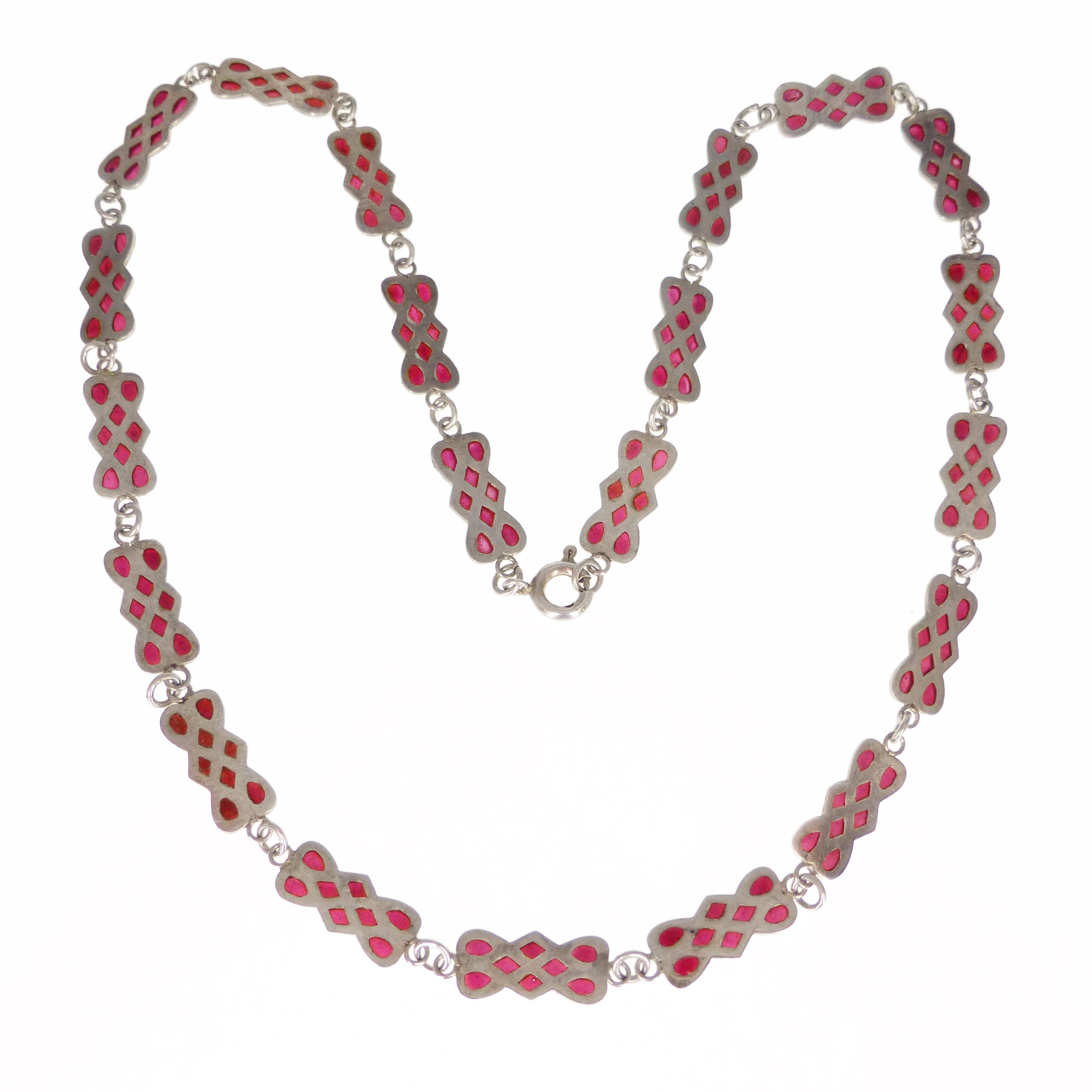 An wonderful antique silver panel necklace set with plique á jour glass detailing in a beautiful cranberry red colour.
