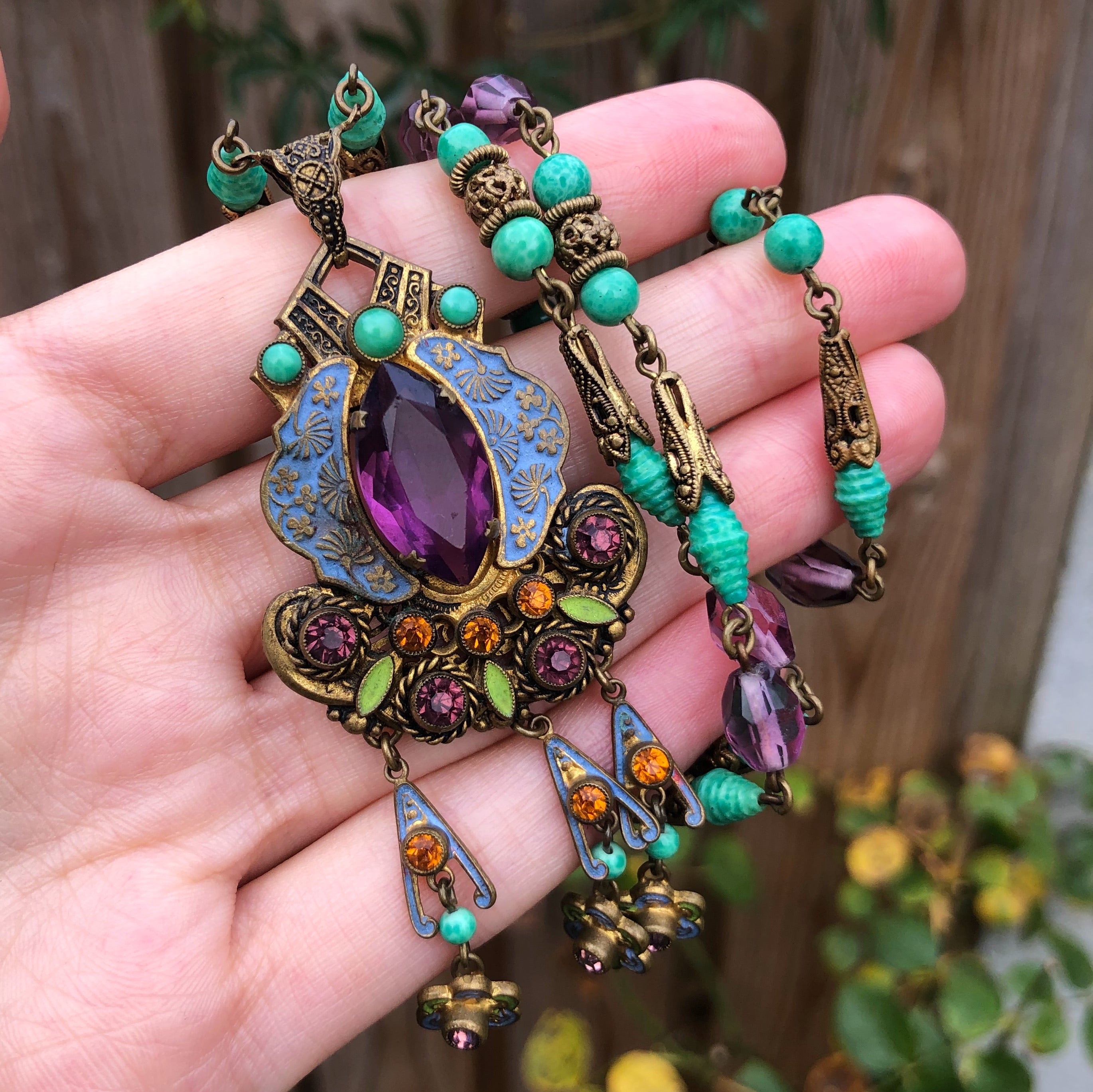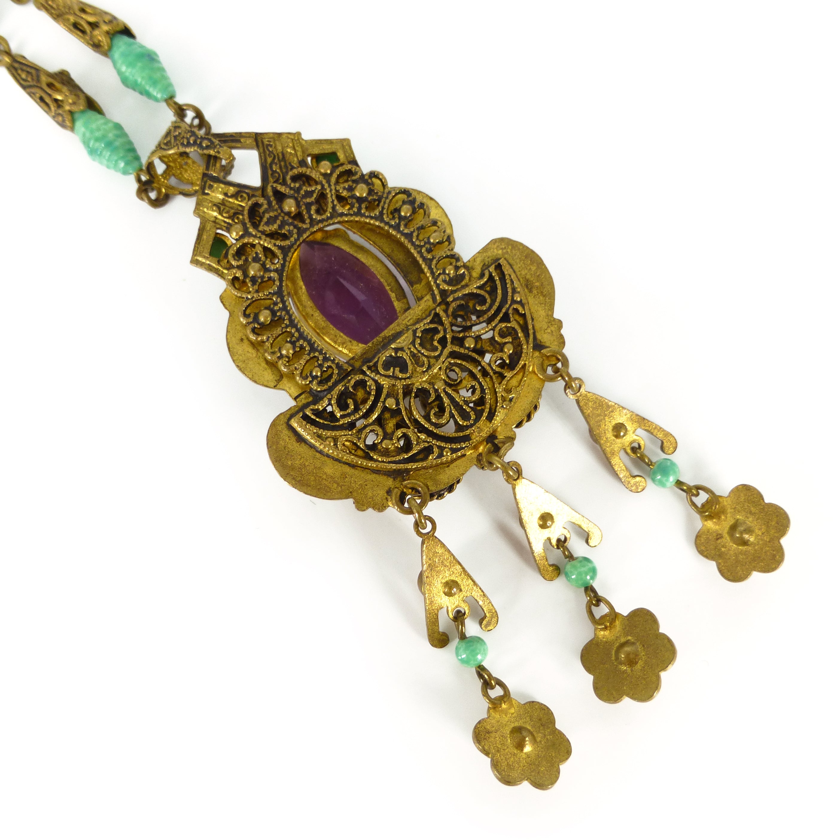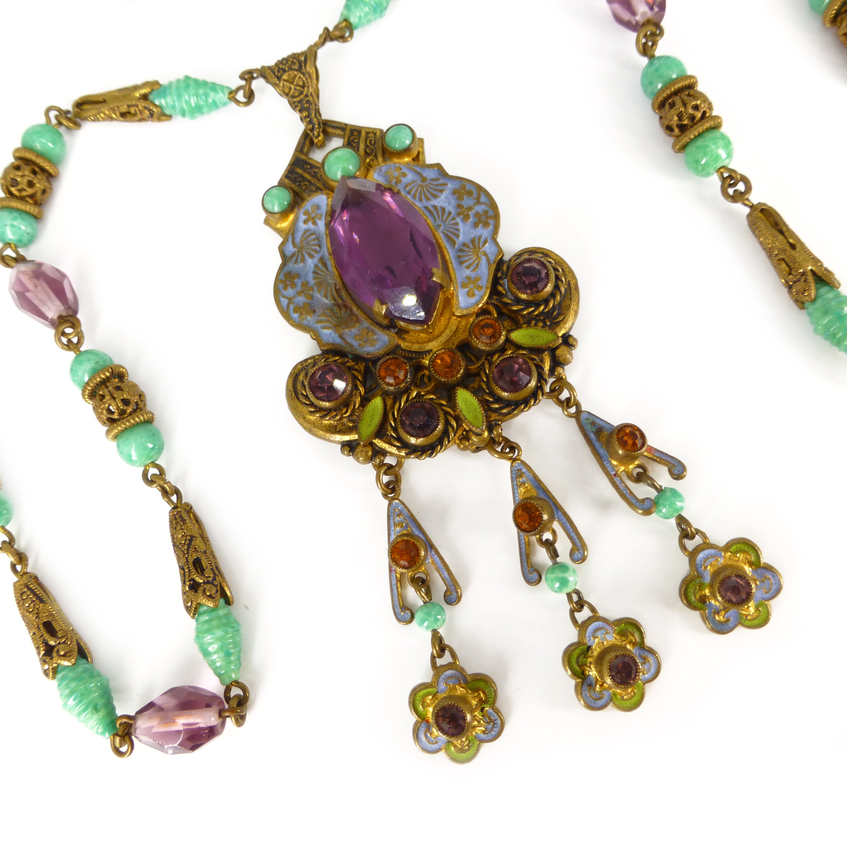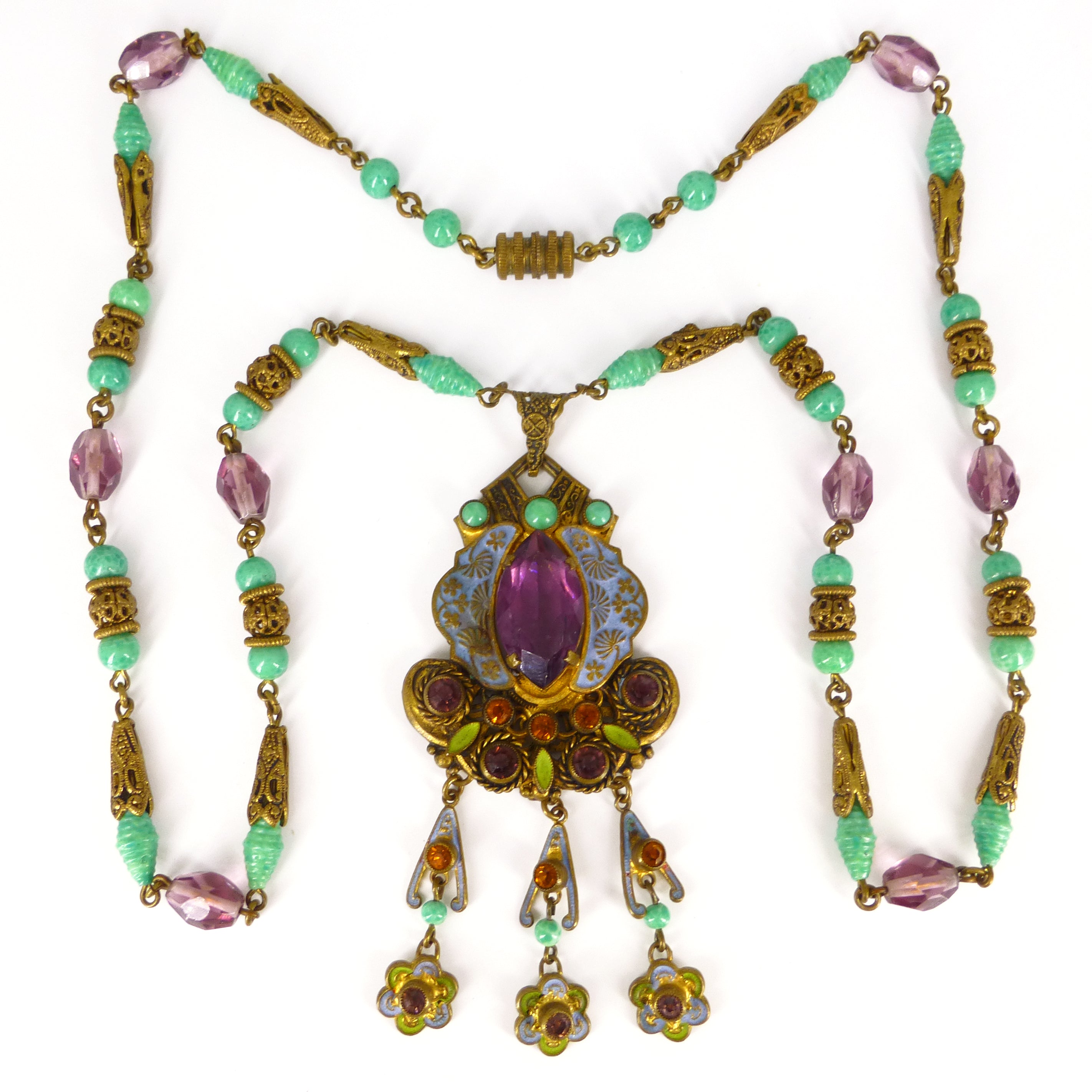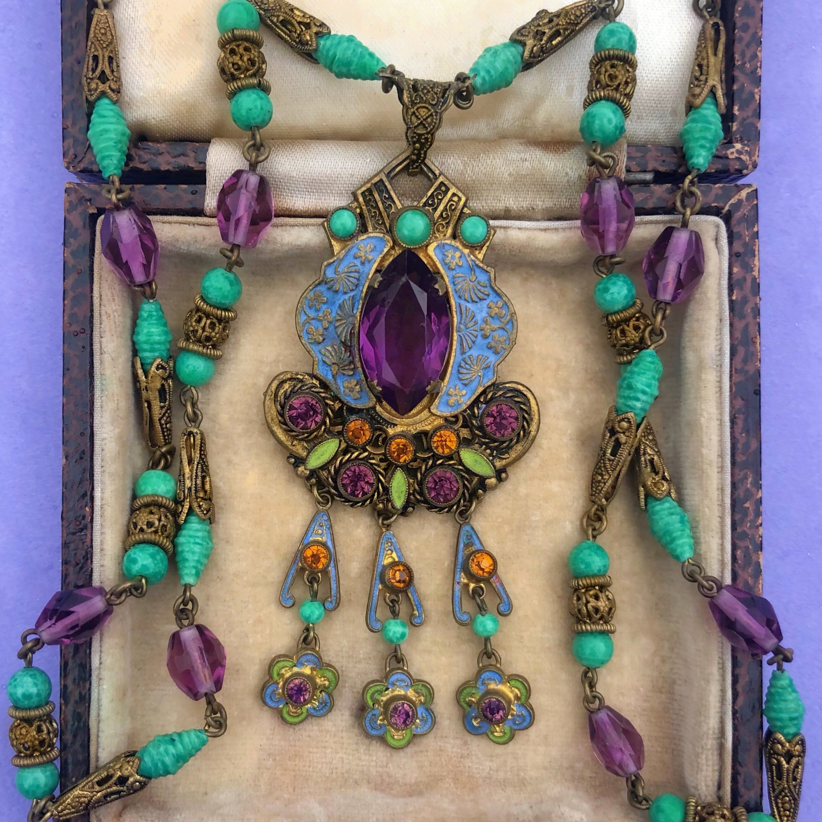 An incredible antique Czech necklace with a slight Oriental influence to the design. The necklace features an ornate enamelled centrepiece with three matching floral drops and a large faceted purple glass stone. The central panel is attached to a green and purple beaded chain that leads to a secure screw barrel clasp.