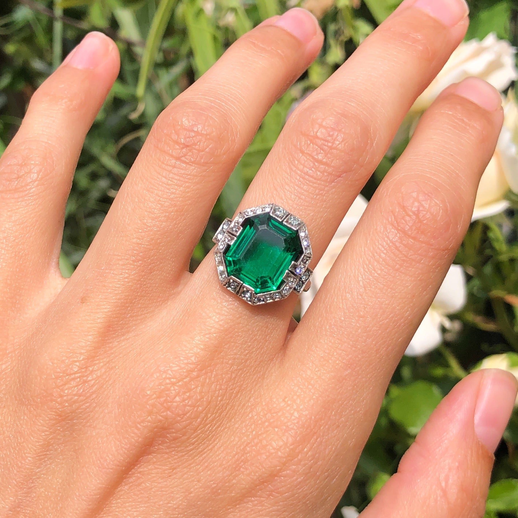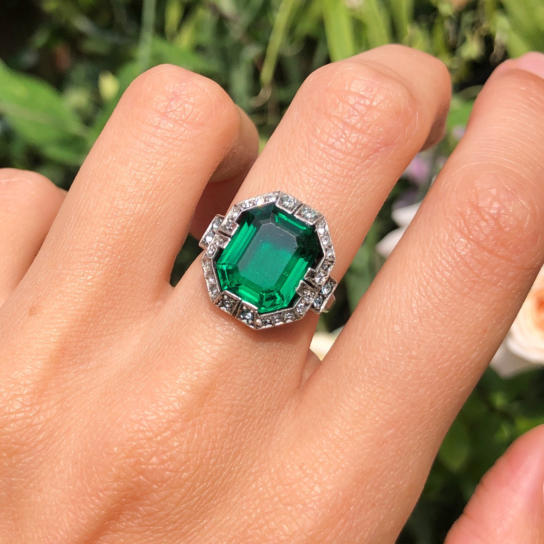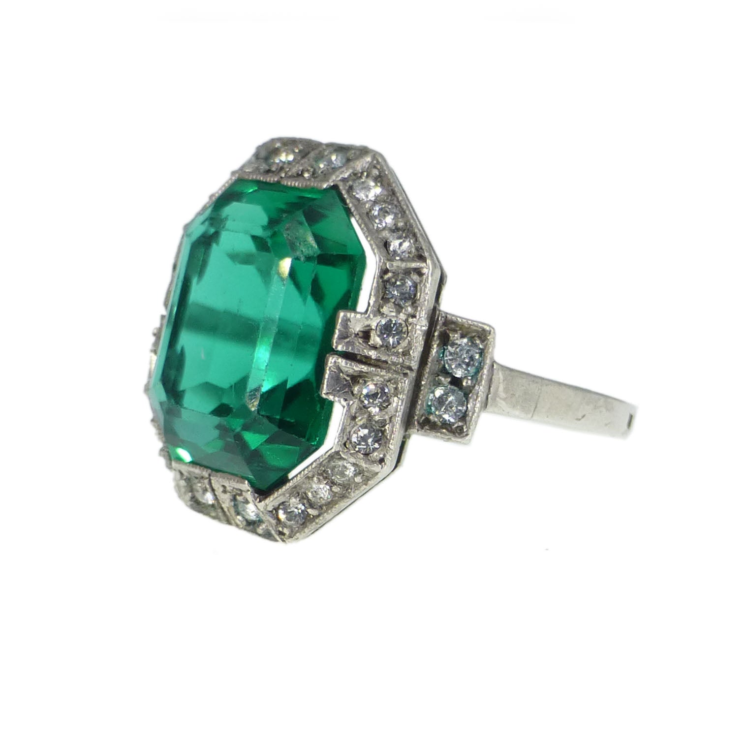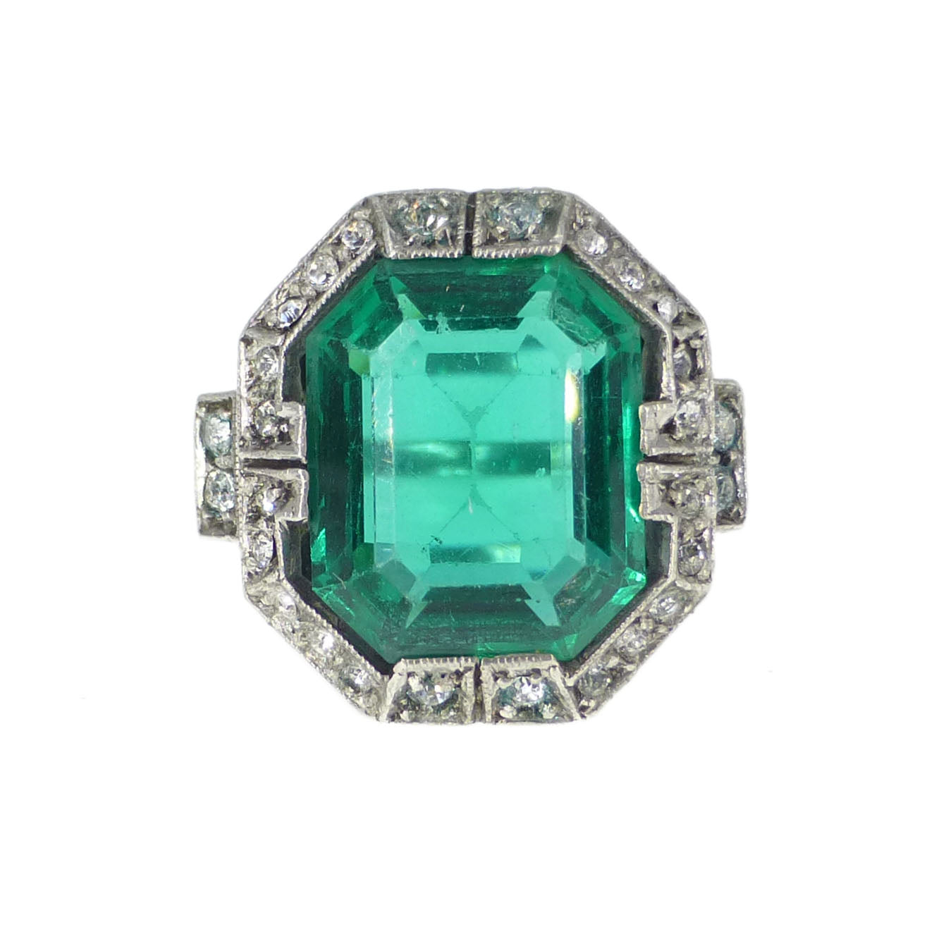 The ring features a large faceted green glass stone set into an ornate clear paste studded frame.