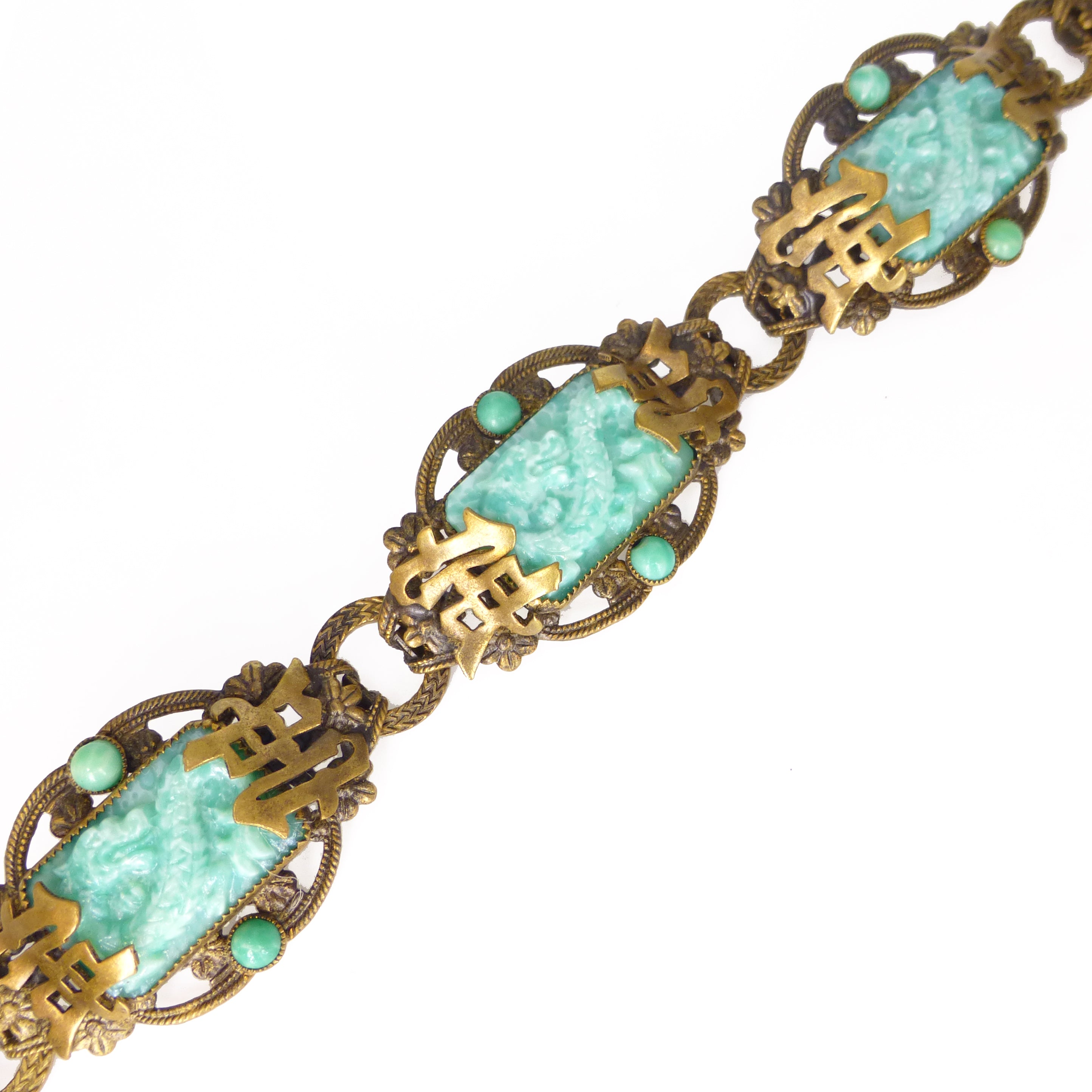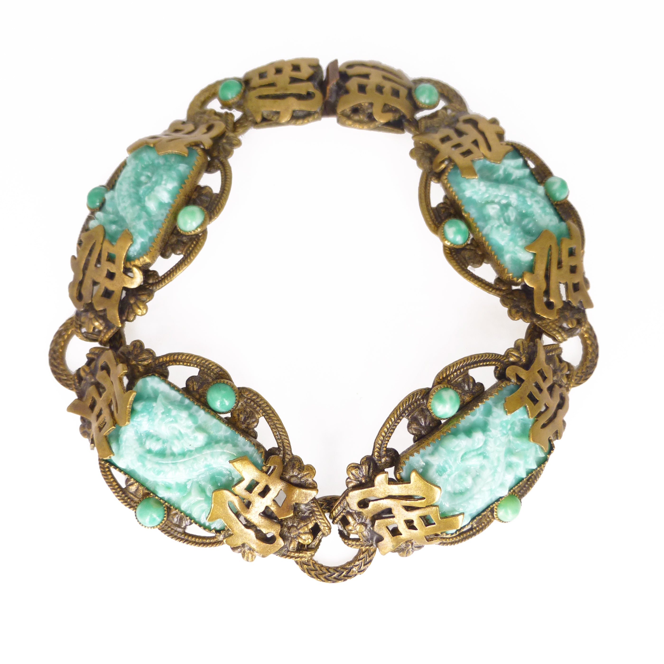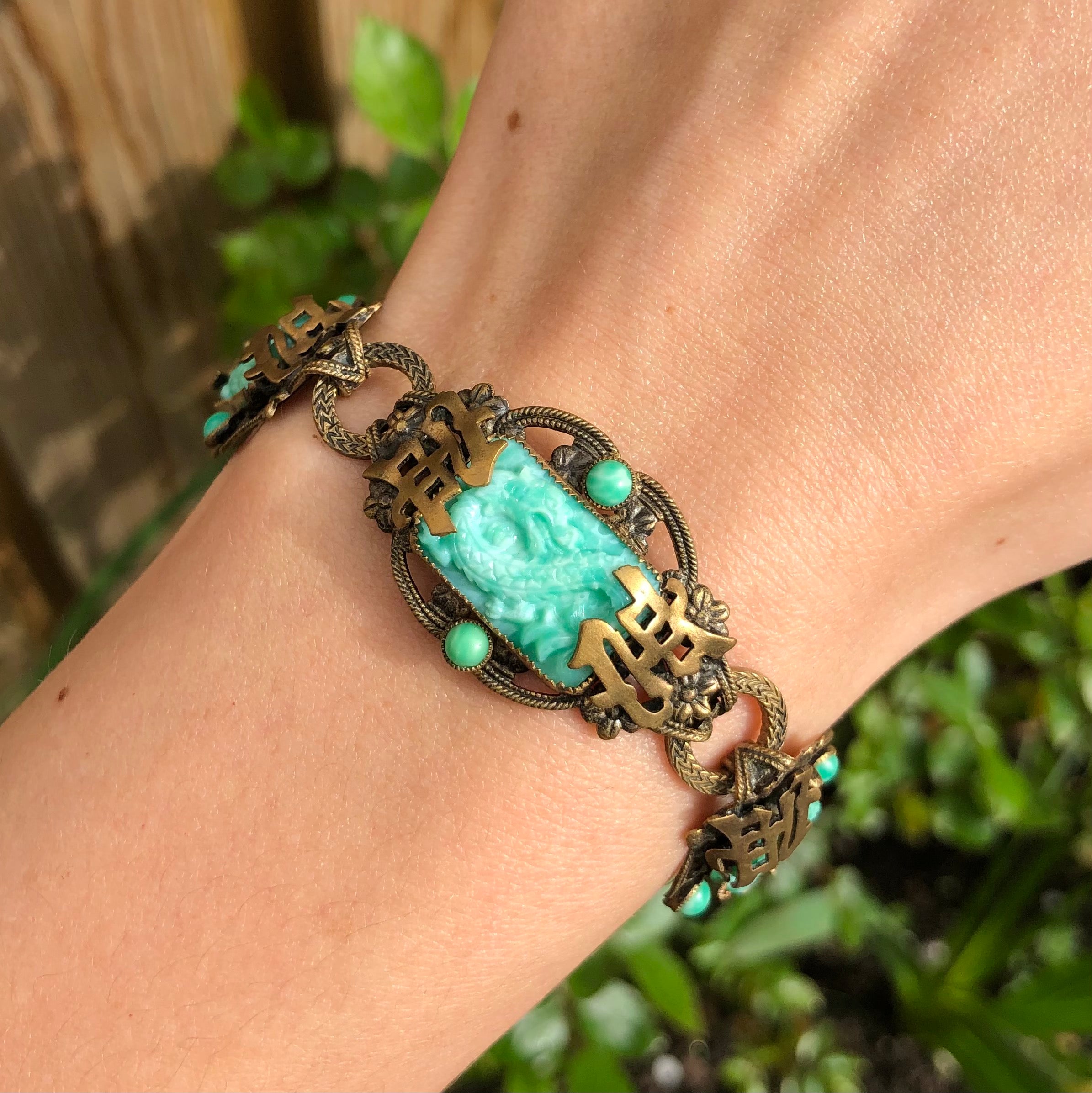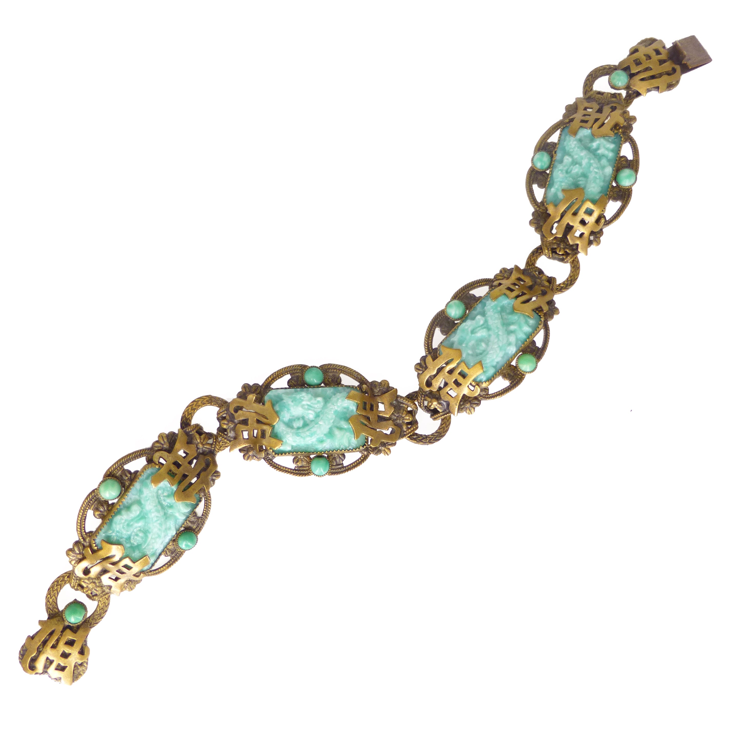 Antique Art Deco Neiger Brothers Oriental Inspired Dragon Glass Panel Bracelet
