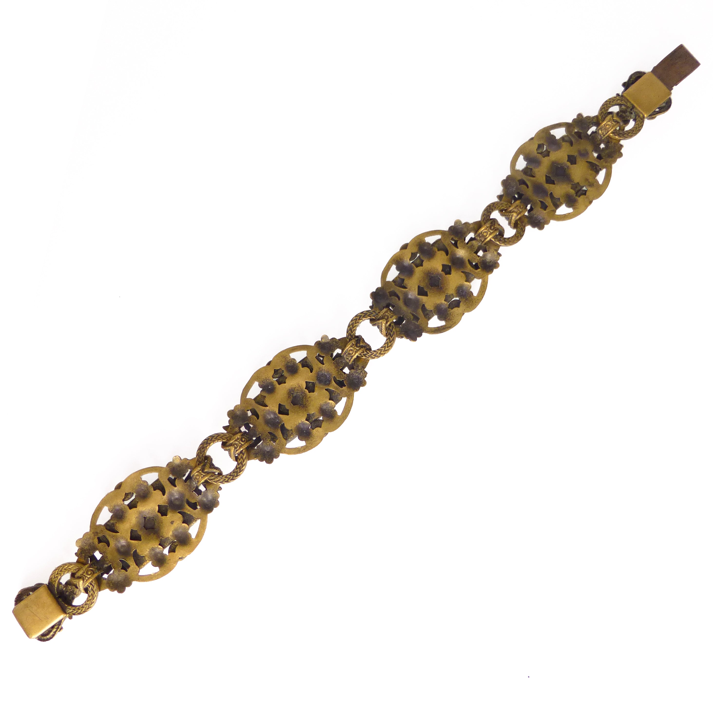 There is a tiny chip to one small glass cabochon. The bracelet is in good antique condition overall.