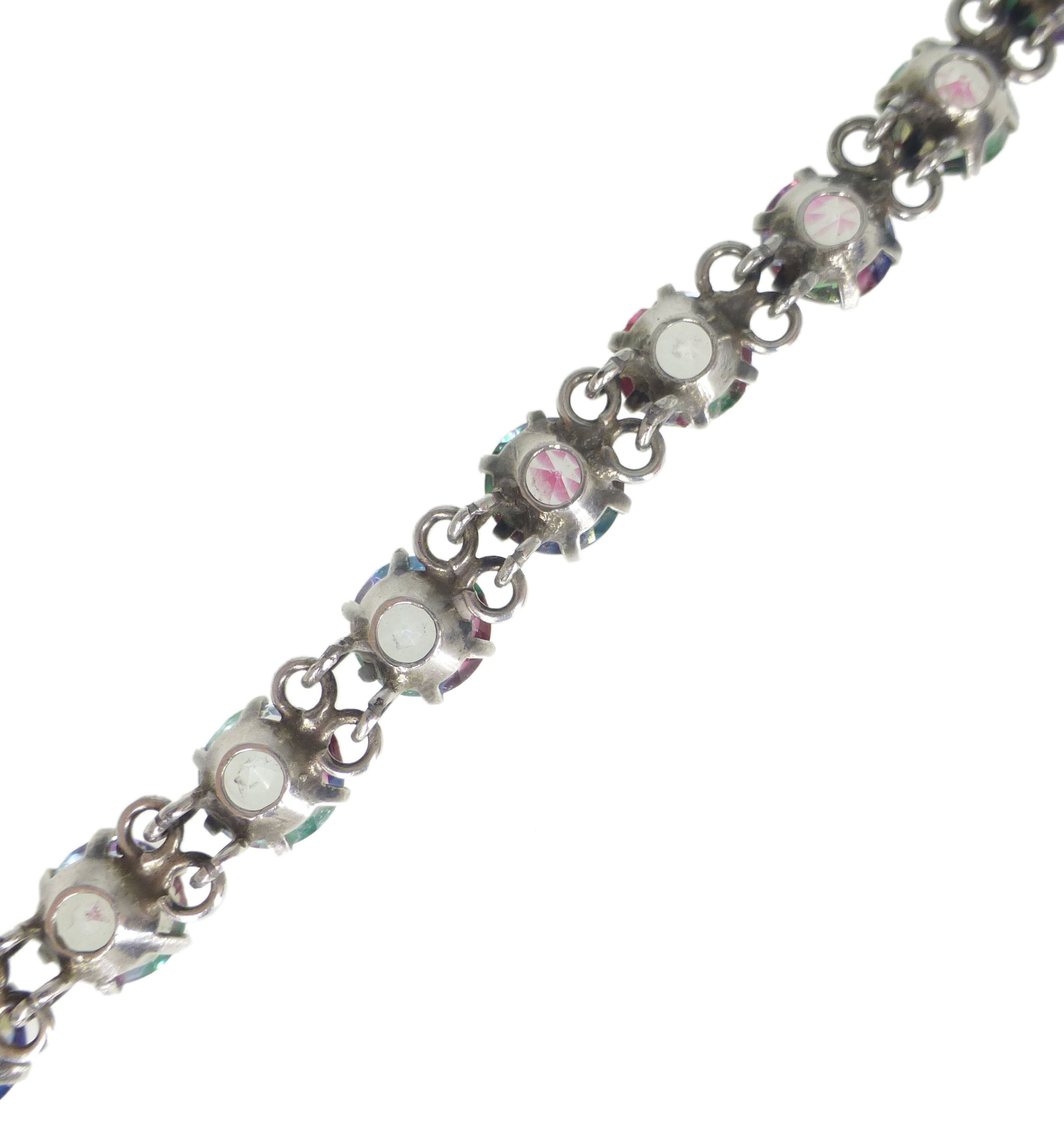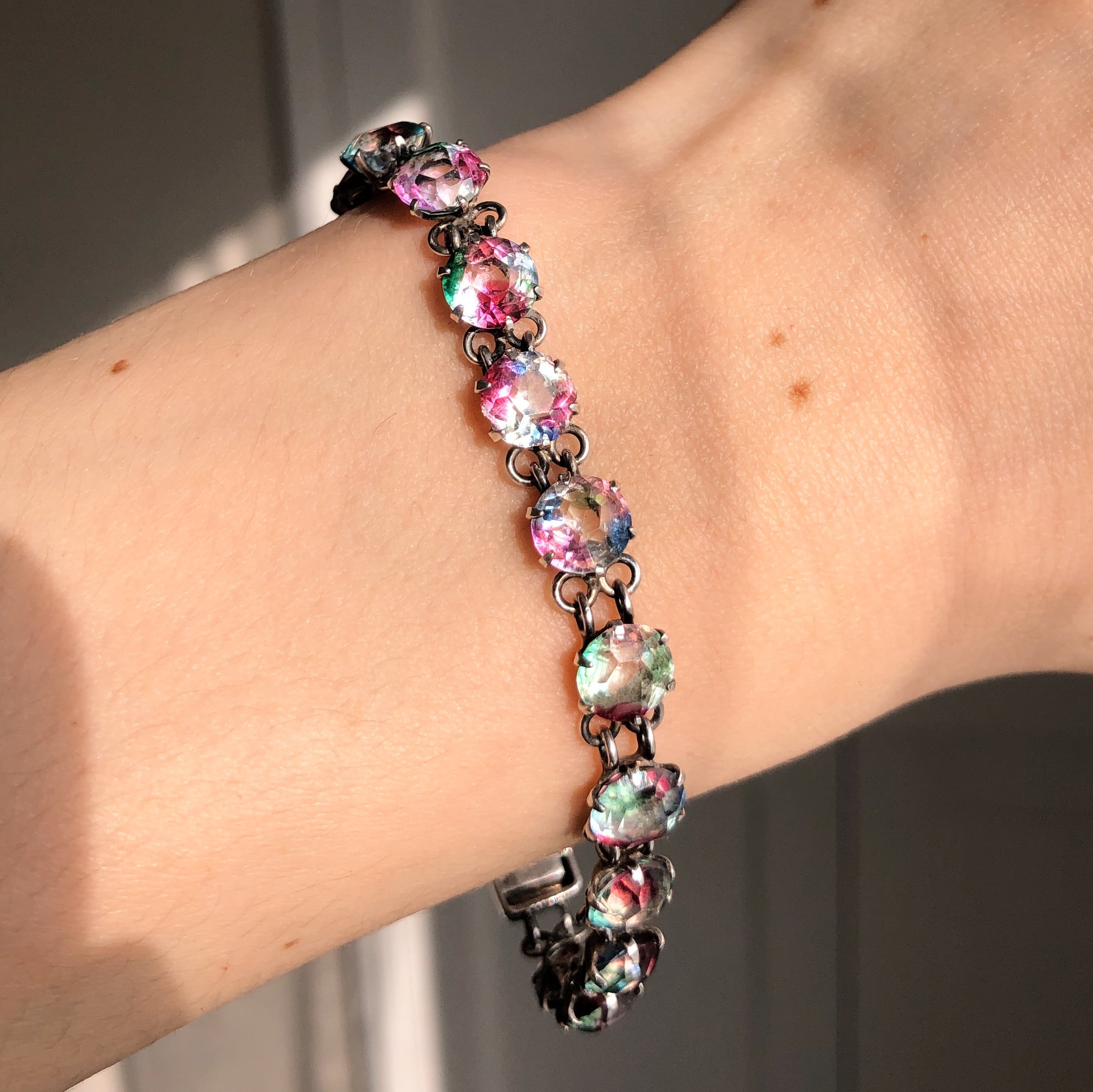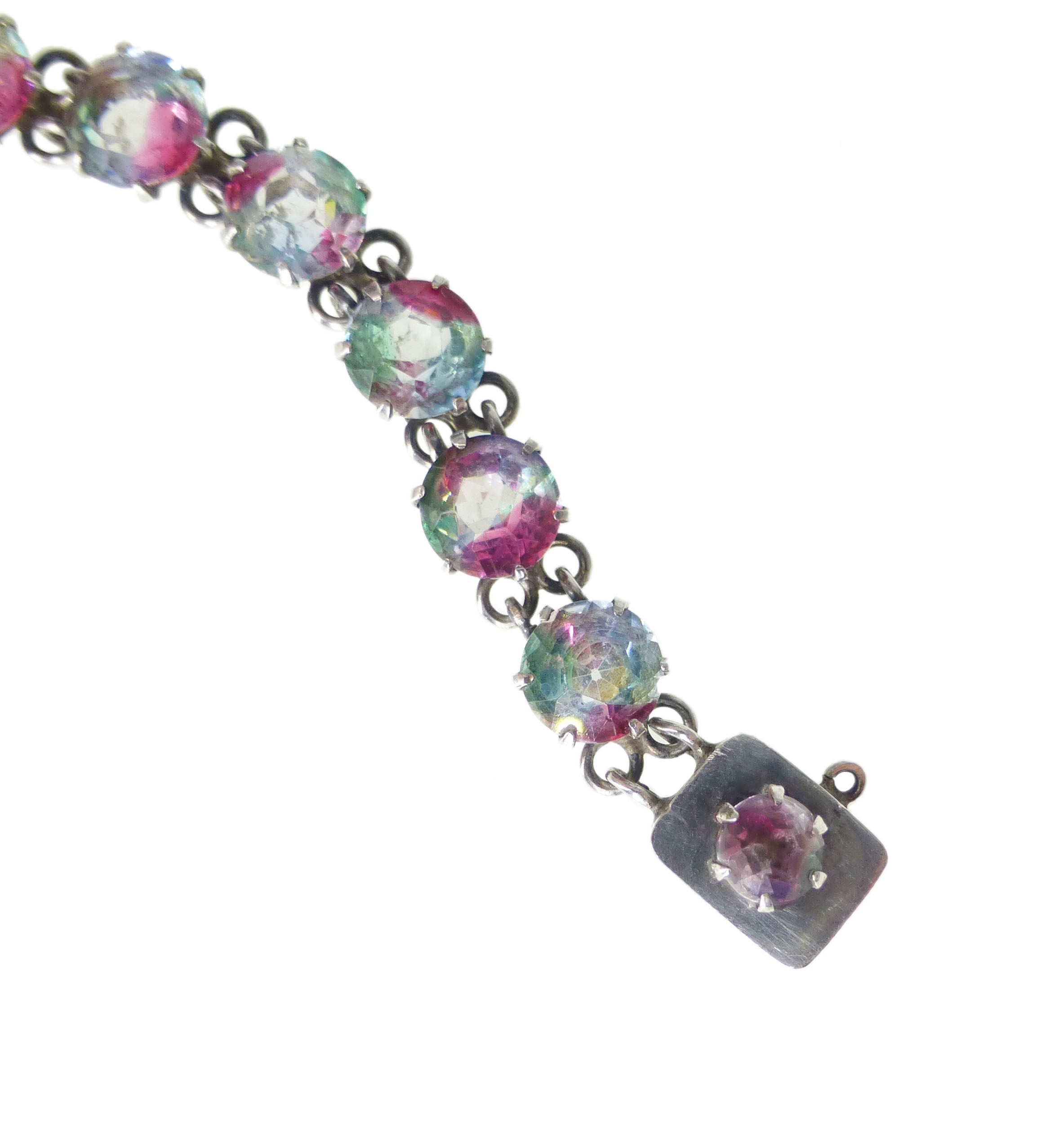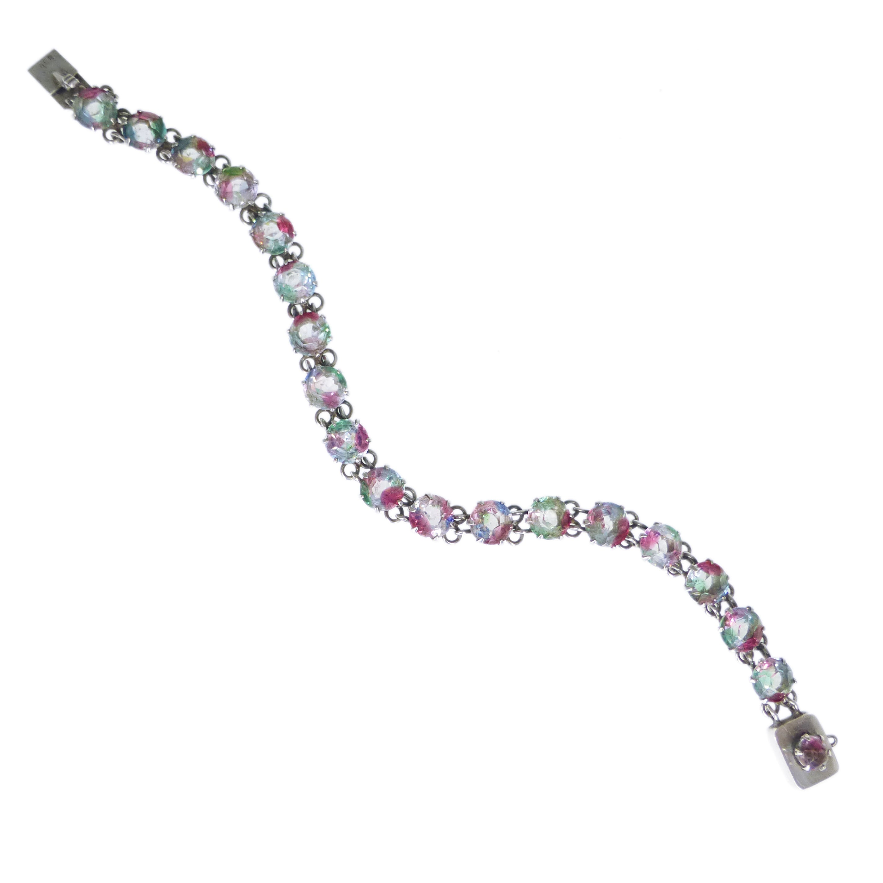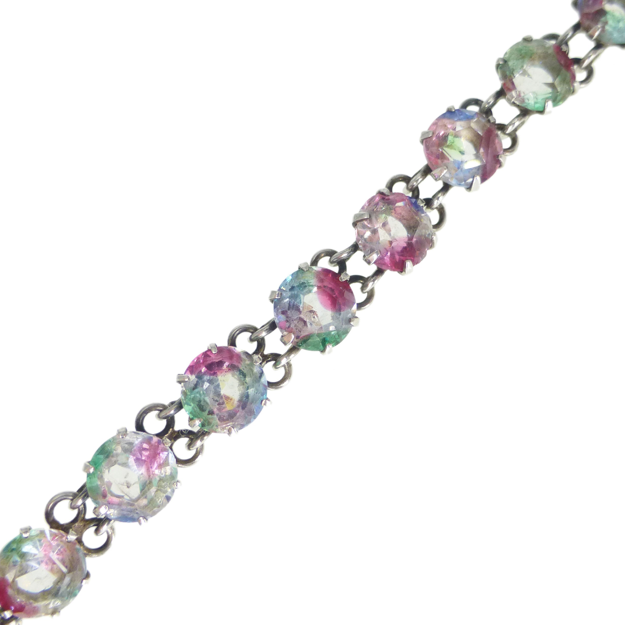 A beautiful silver bracelet dating to the late Art Deco period. The bracelet features linked open backed iris glass stones with a lovely solid silver clasp set with a matching stone.