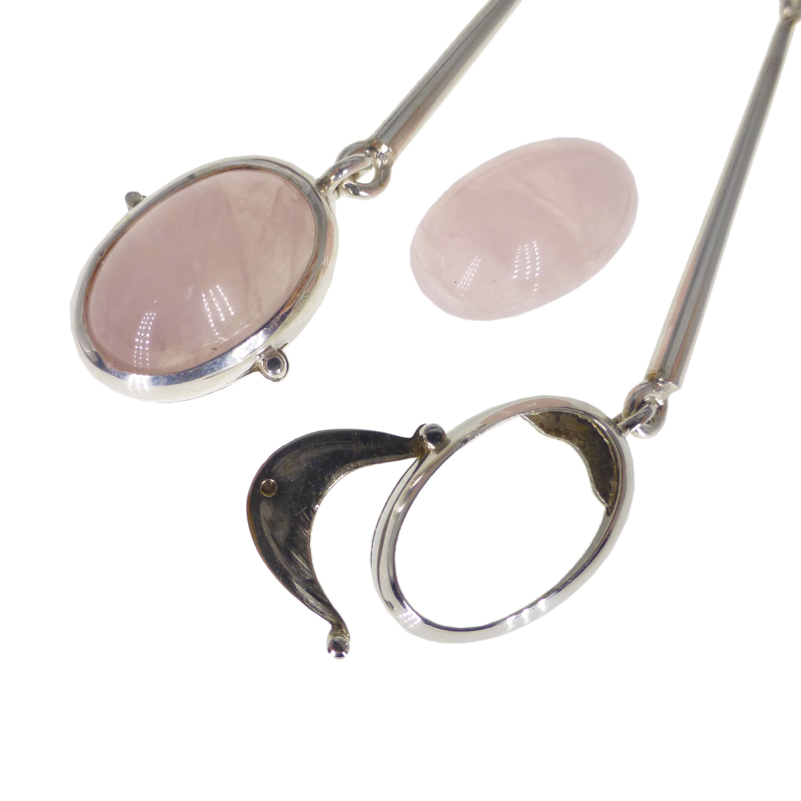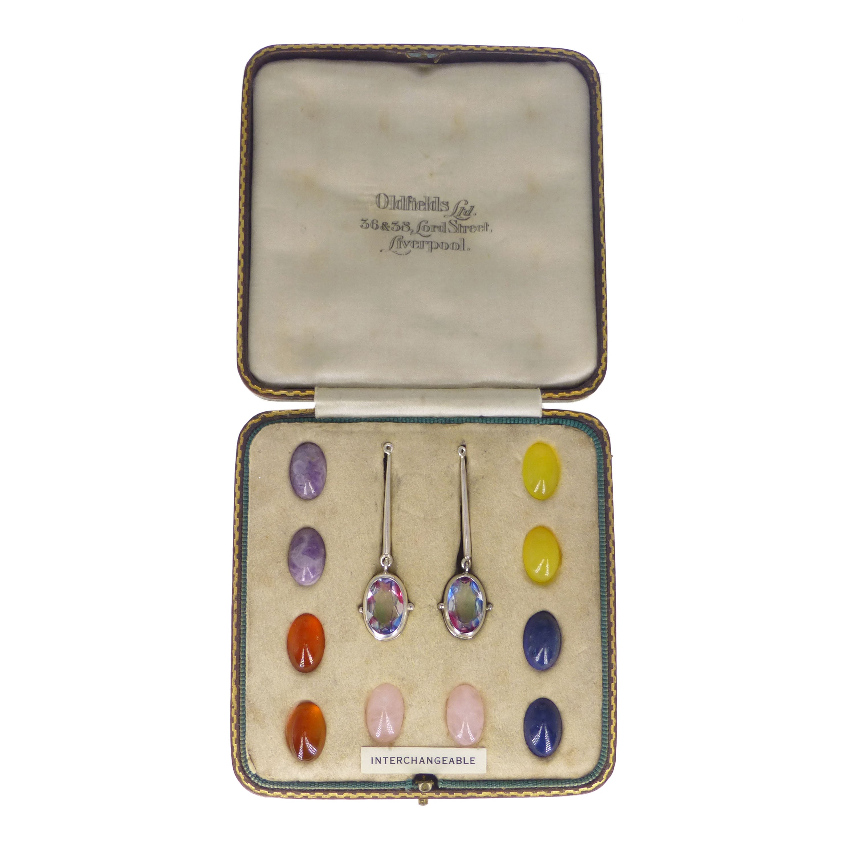 An amazing pair of boxed vintage silver earrings that come with a range of stones that can be placed into the drops to be worn. Stones include lapis, amethyst, rose quartz, carnelian and a pair of faceted iris glass stones.
