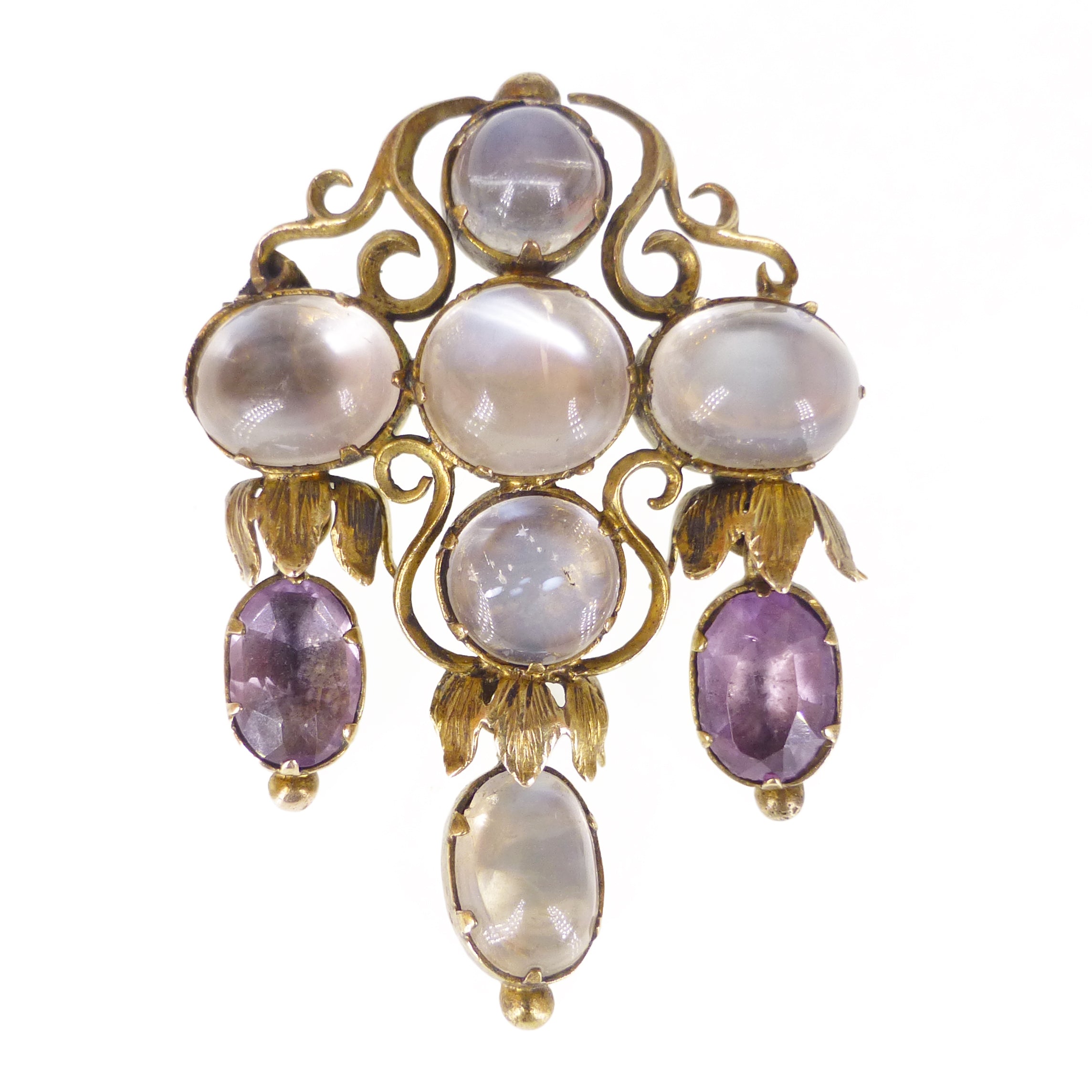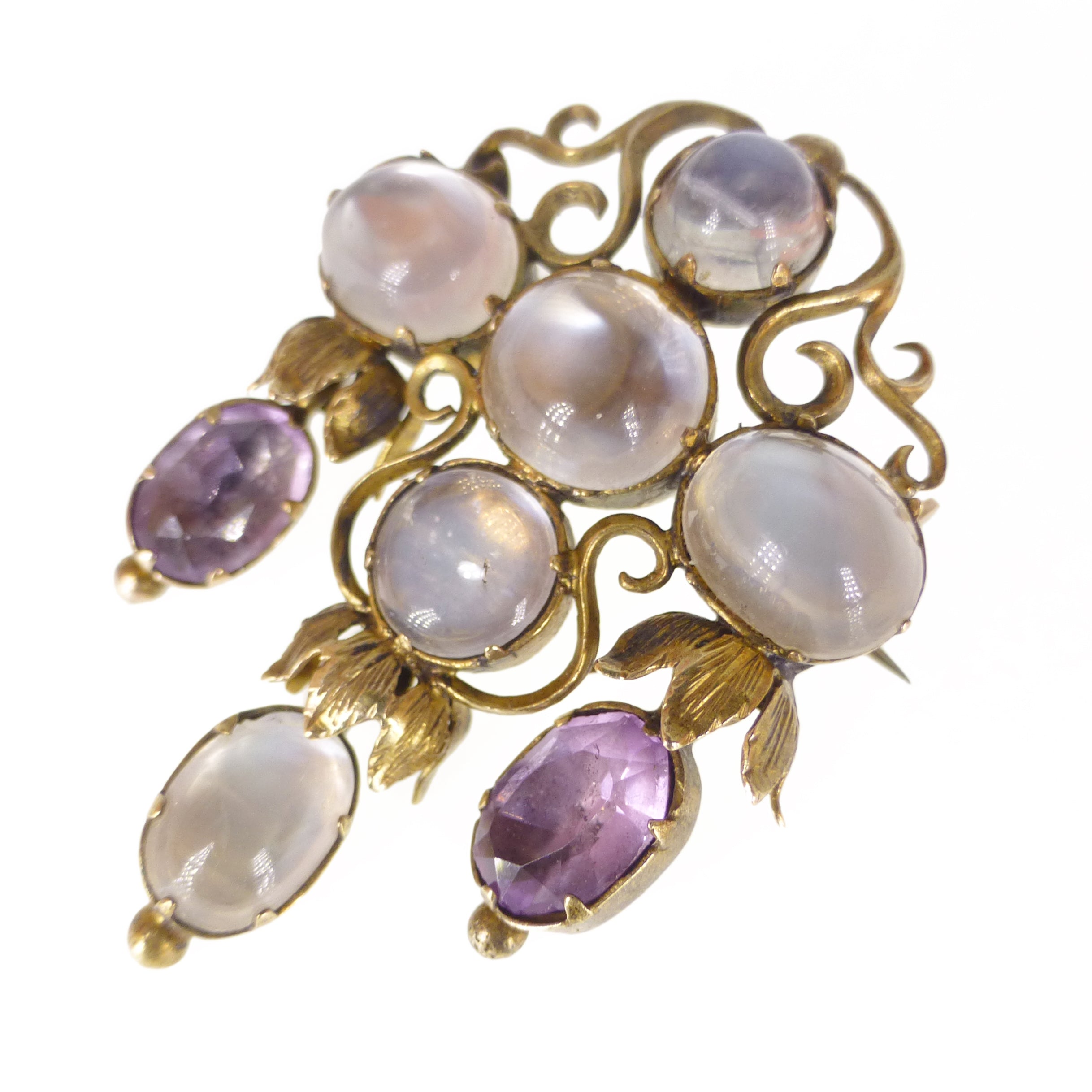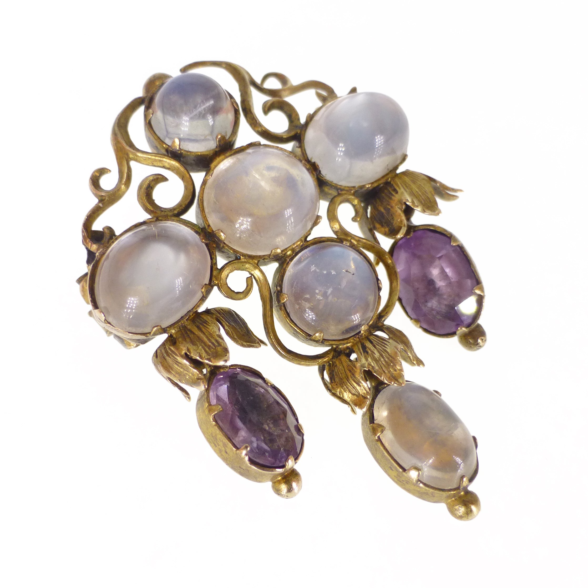 A delightful antique gold brooch dating to the Arts & Crafts period. The brooch is set with beautiful domed moonstone cabochons with two faceted amethyst drops hanging from gold leaf tops. The brooch is finished with a secure hook clasp and does not feature any hallmarks. It is most likely English in origin.