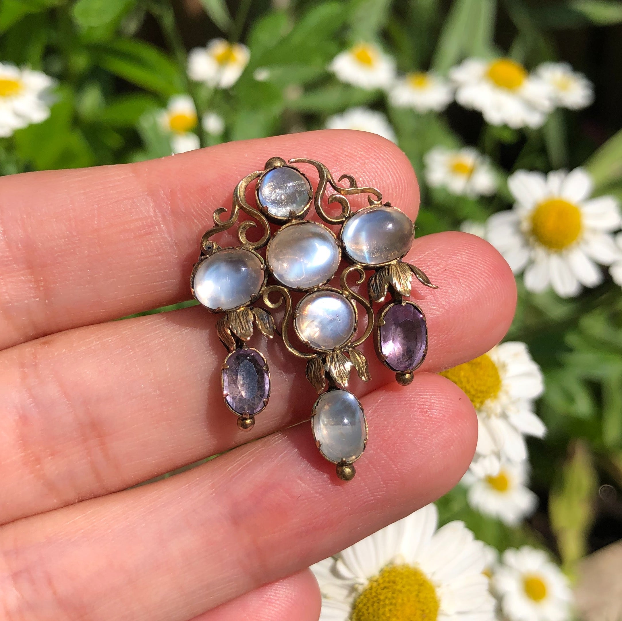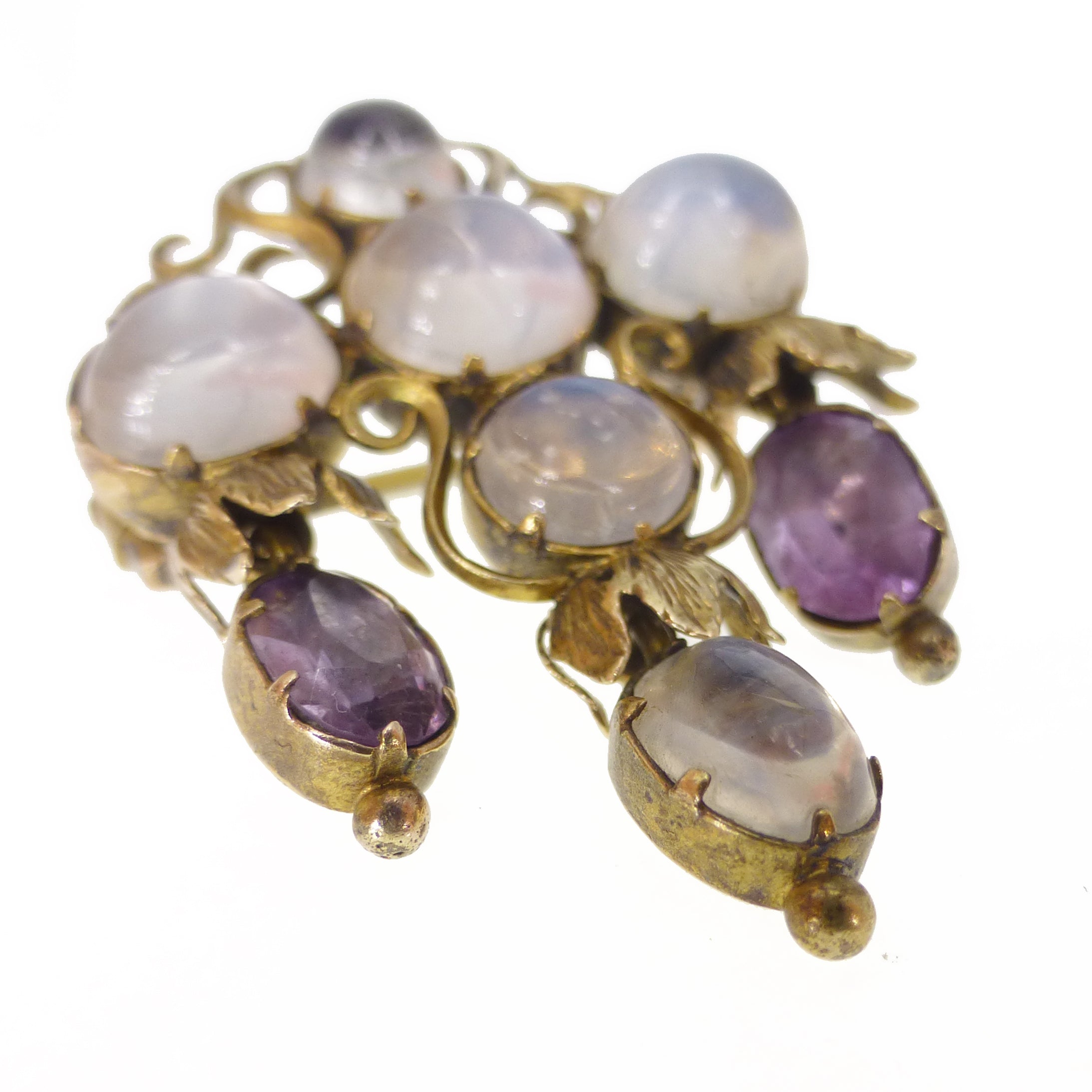 Antique Arts & Crafts Era Gold Moonstone & Amethyst Brooch