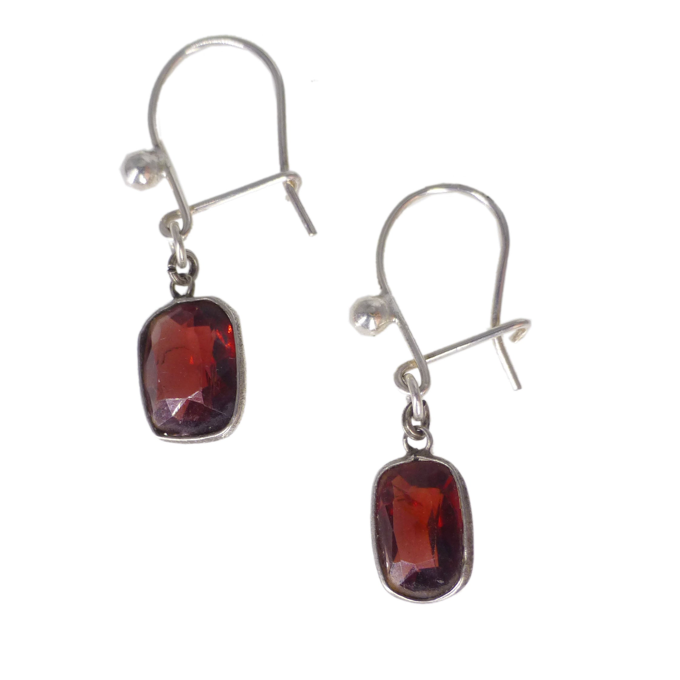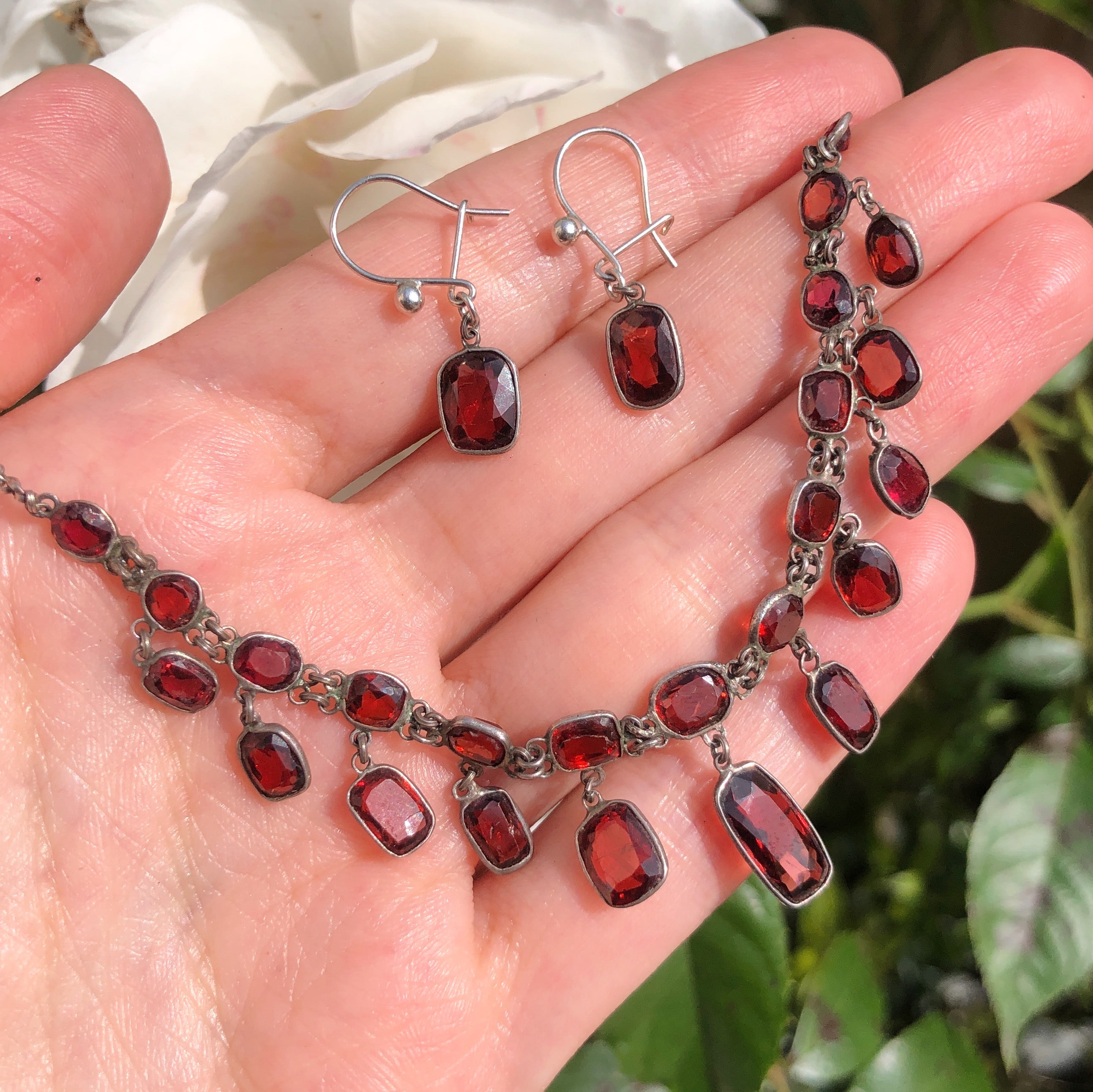 The necklace would have originally featured a hooked 'S' clasp but this has been replaced at some point with a silver bolt ring. The earrings feature a matching garnets that hang from more modern silver pierced hooks.