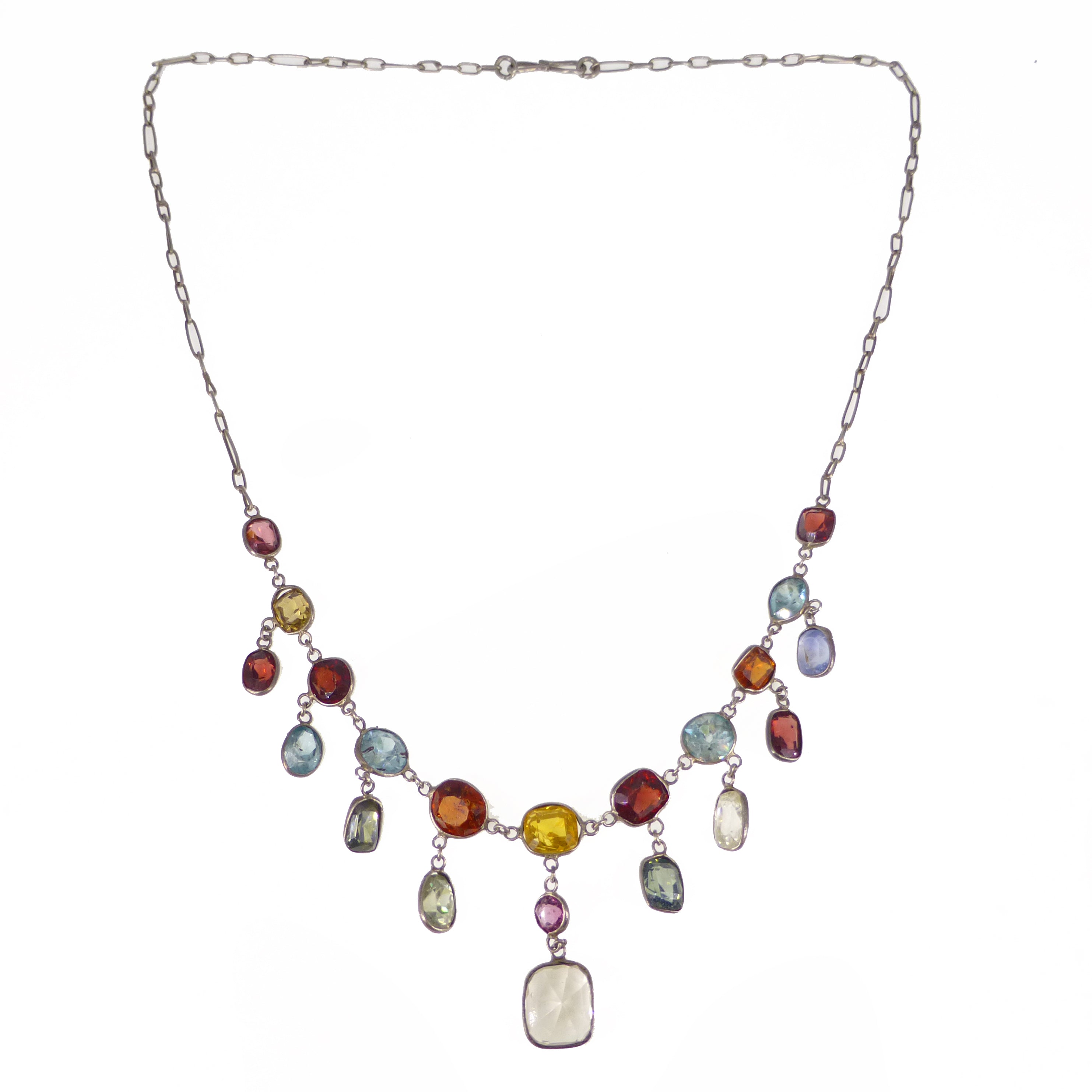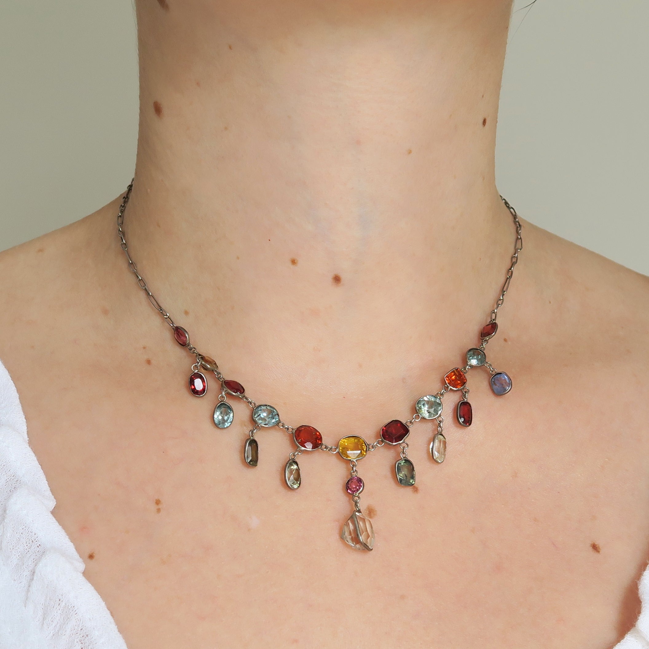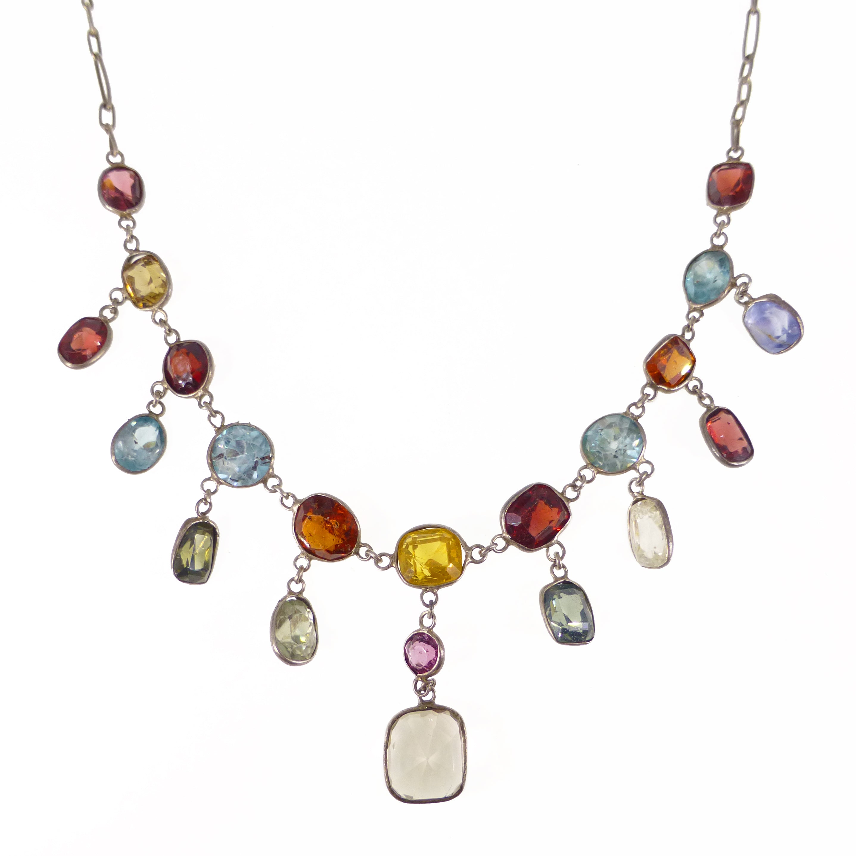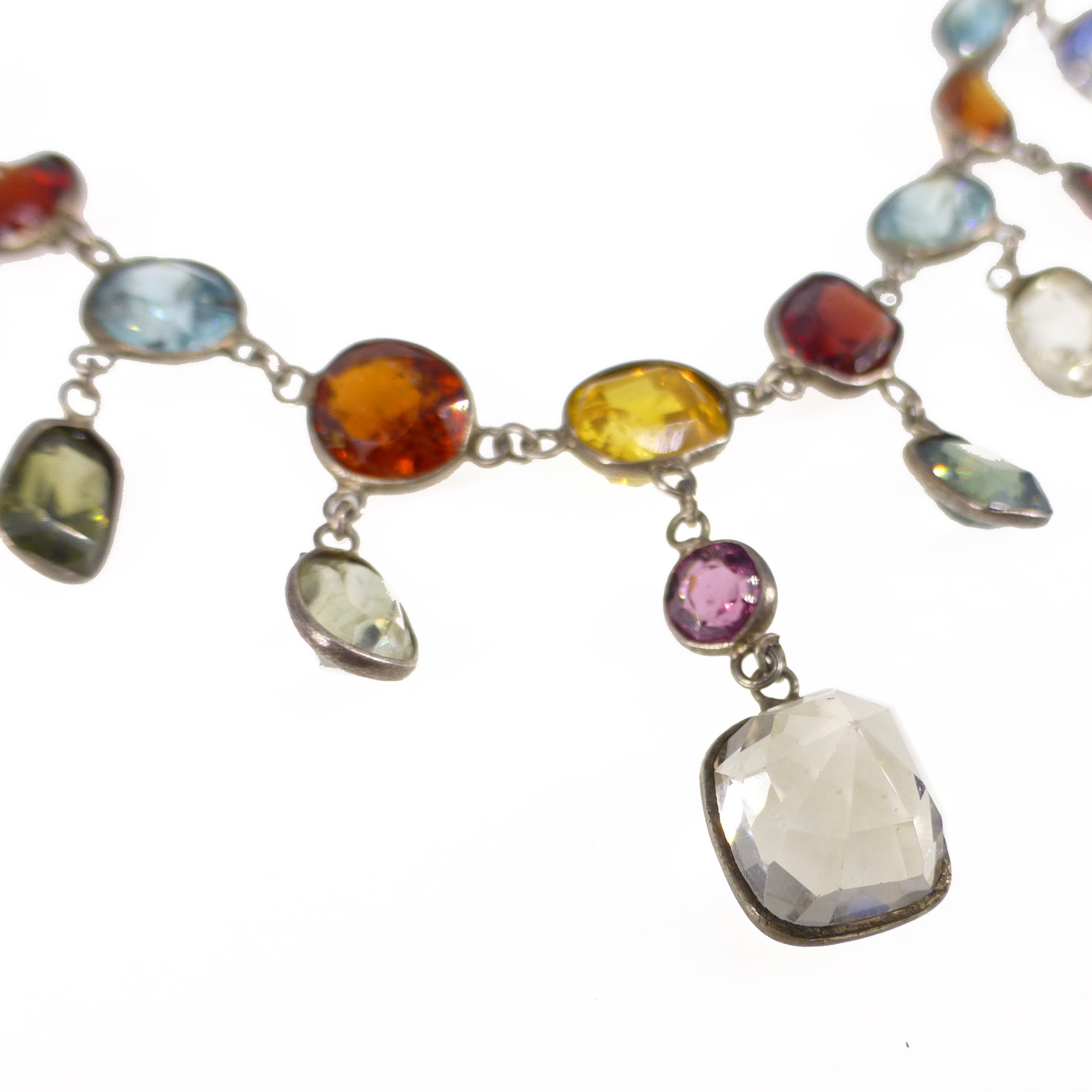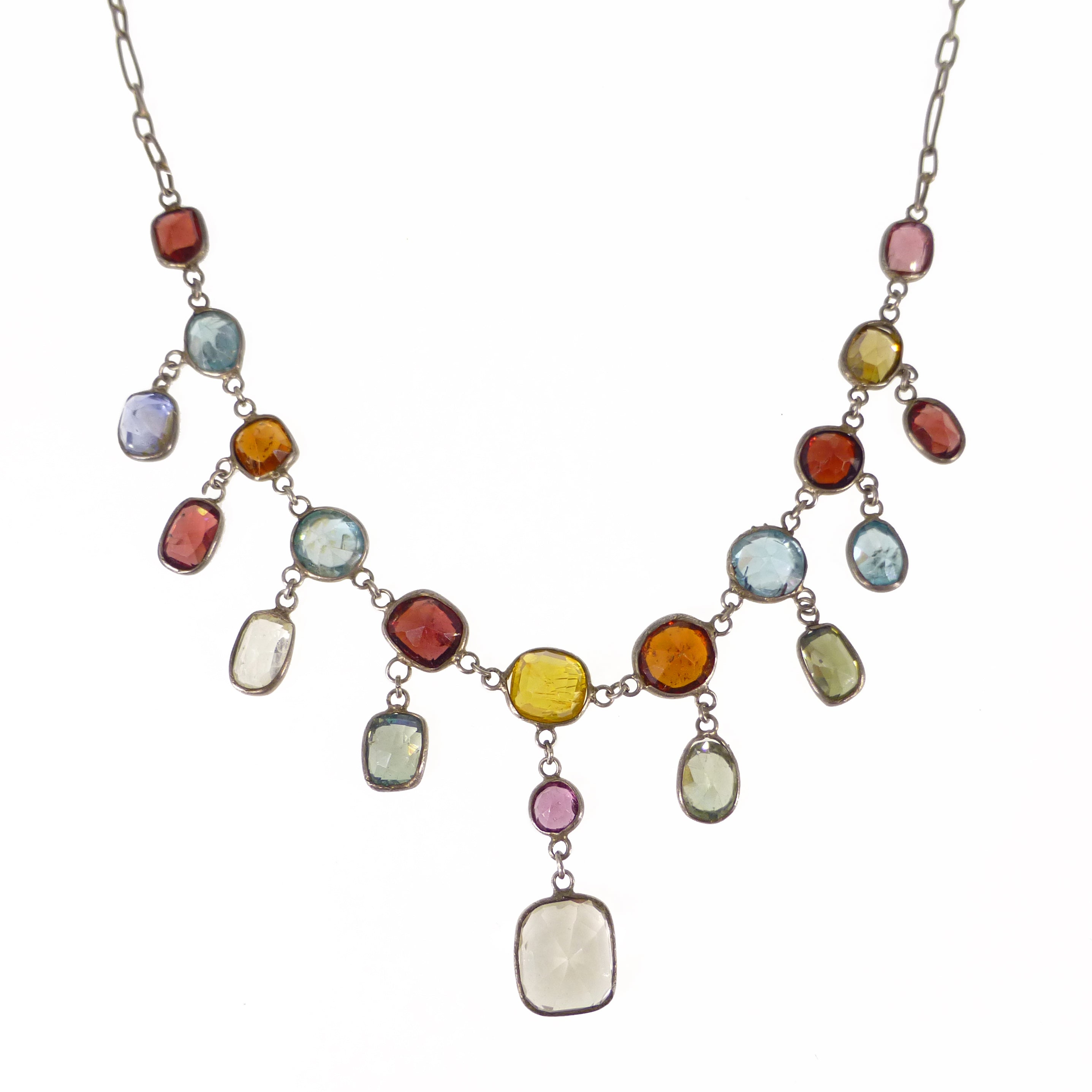 A wonderful antique silver festoon necklace dating to the Arts & Crafts period. The necklace is set with colourful semi precious stones including garnets, citrine and zircons, with a large rock crystal drop at the centre. The stones are bezel set and attached to a delicate silver chain finished with a secure hook clasp.