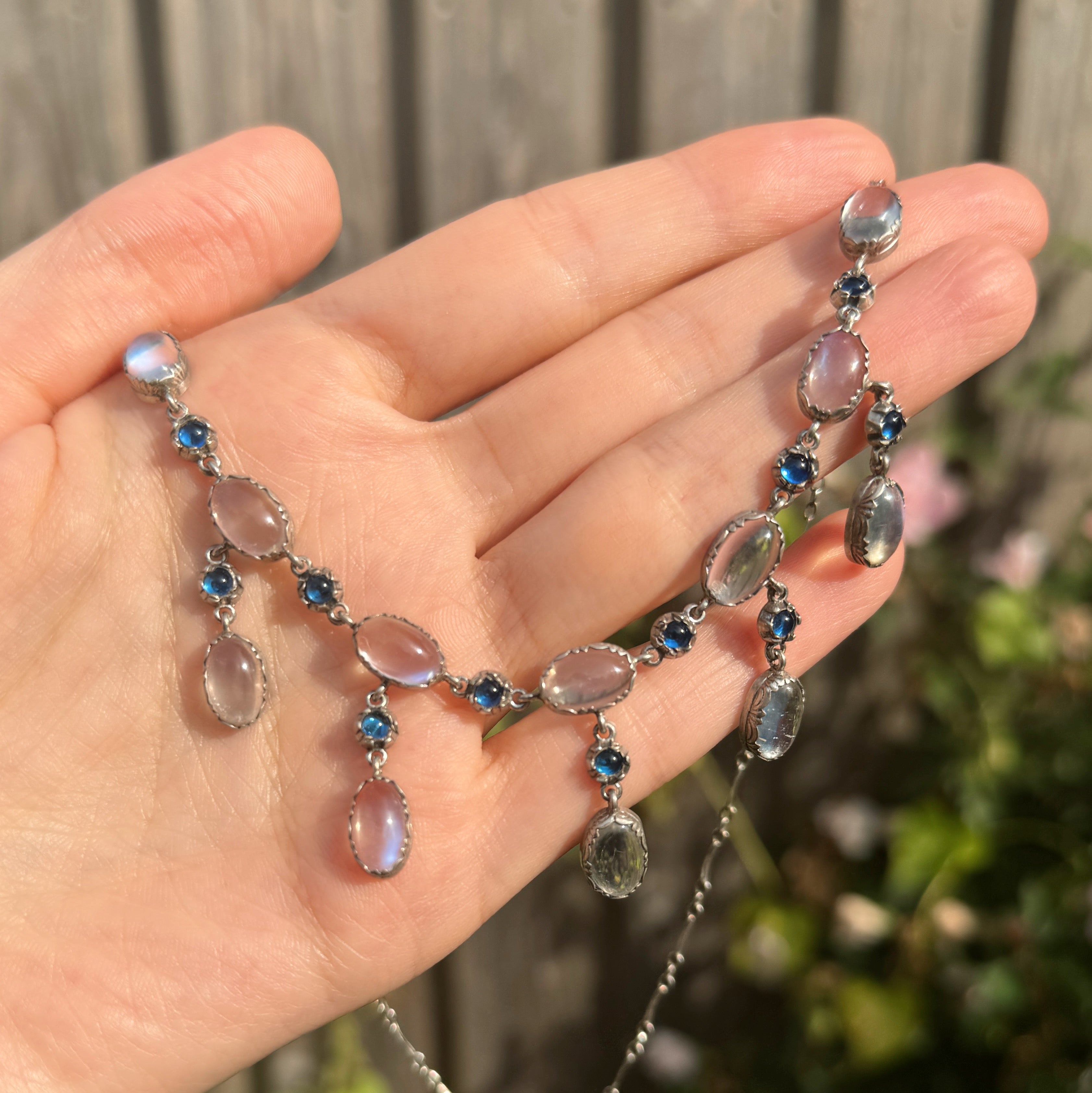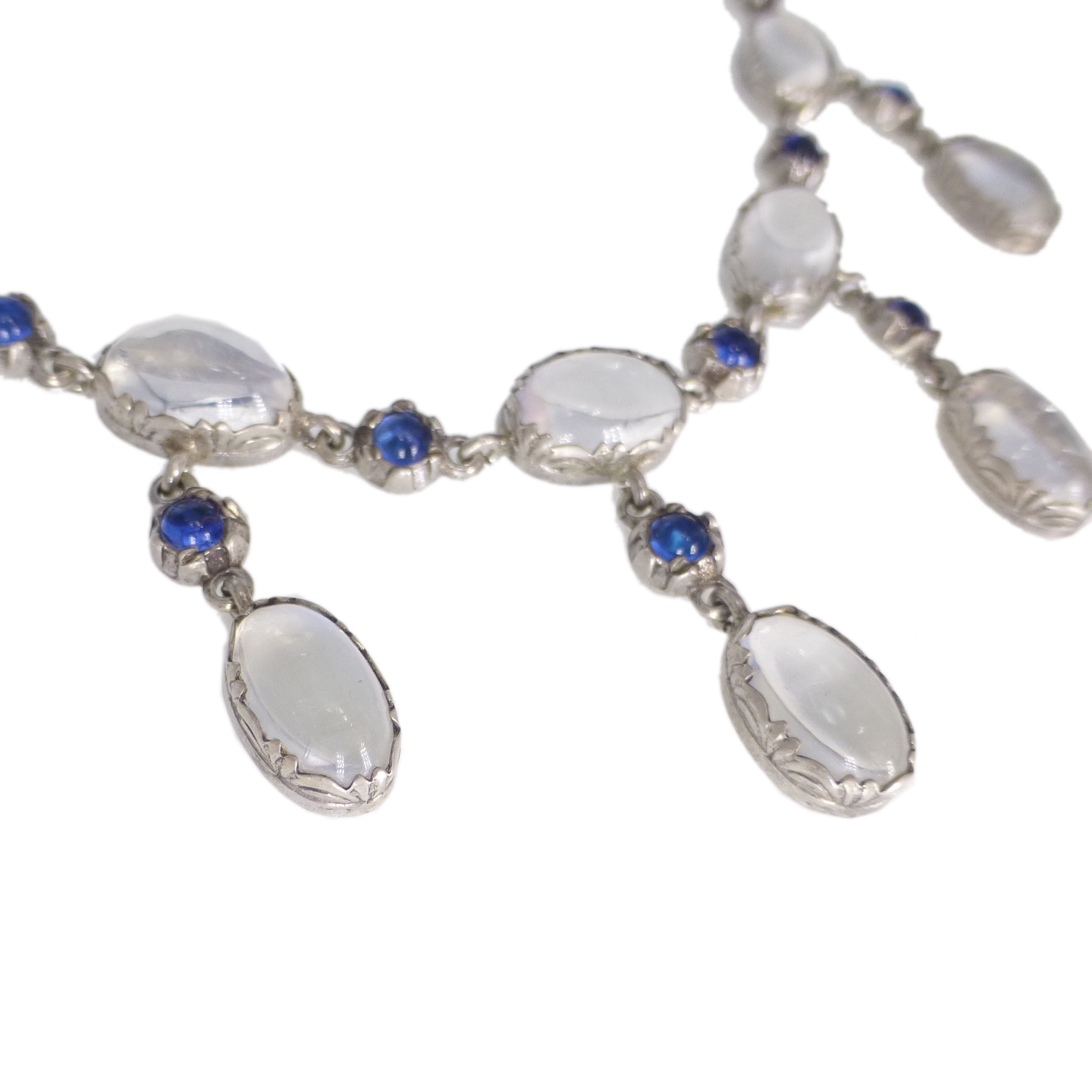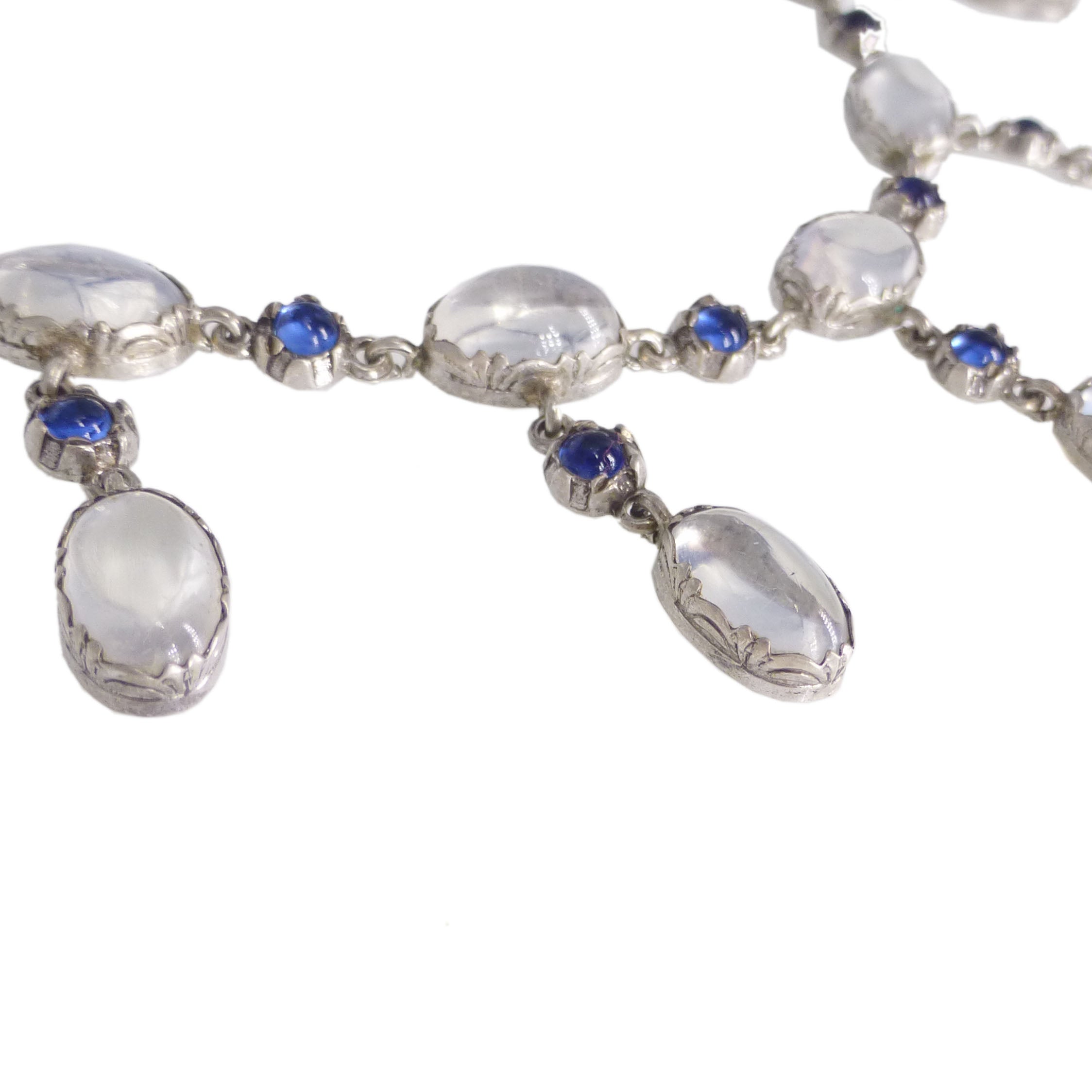 A wonderful antique silver necklace dating to the Arts & Crafts period. The necklace features blue tinted moonstones encased in decorative silver frames with little blue glass cabochons illuminating each stone.