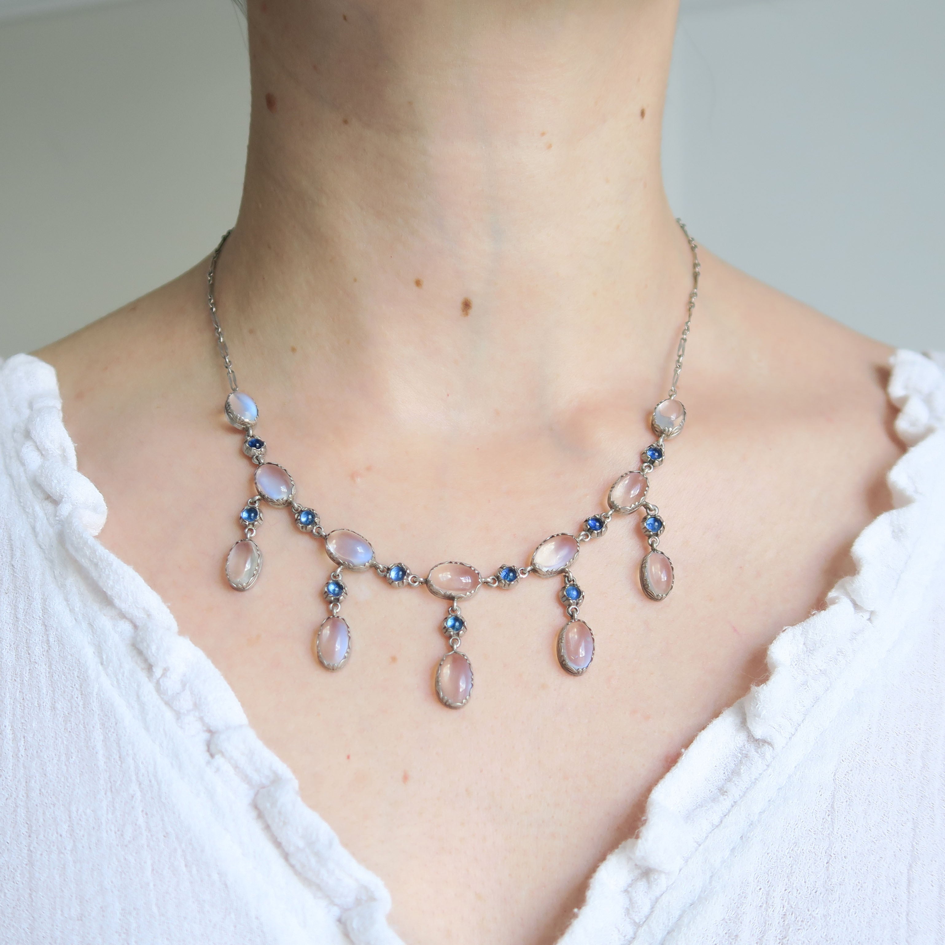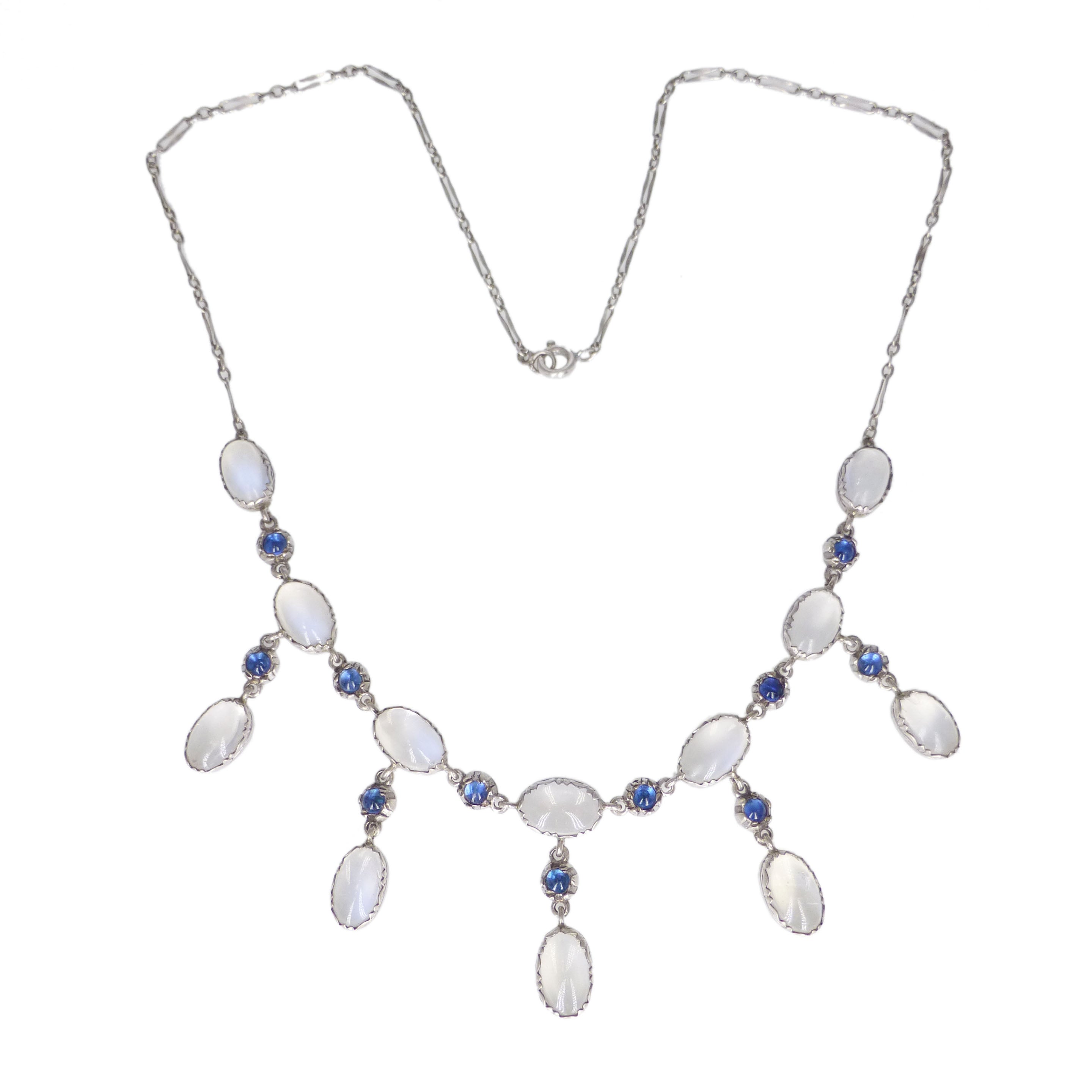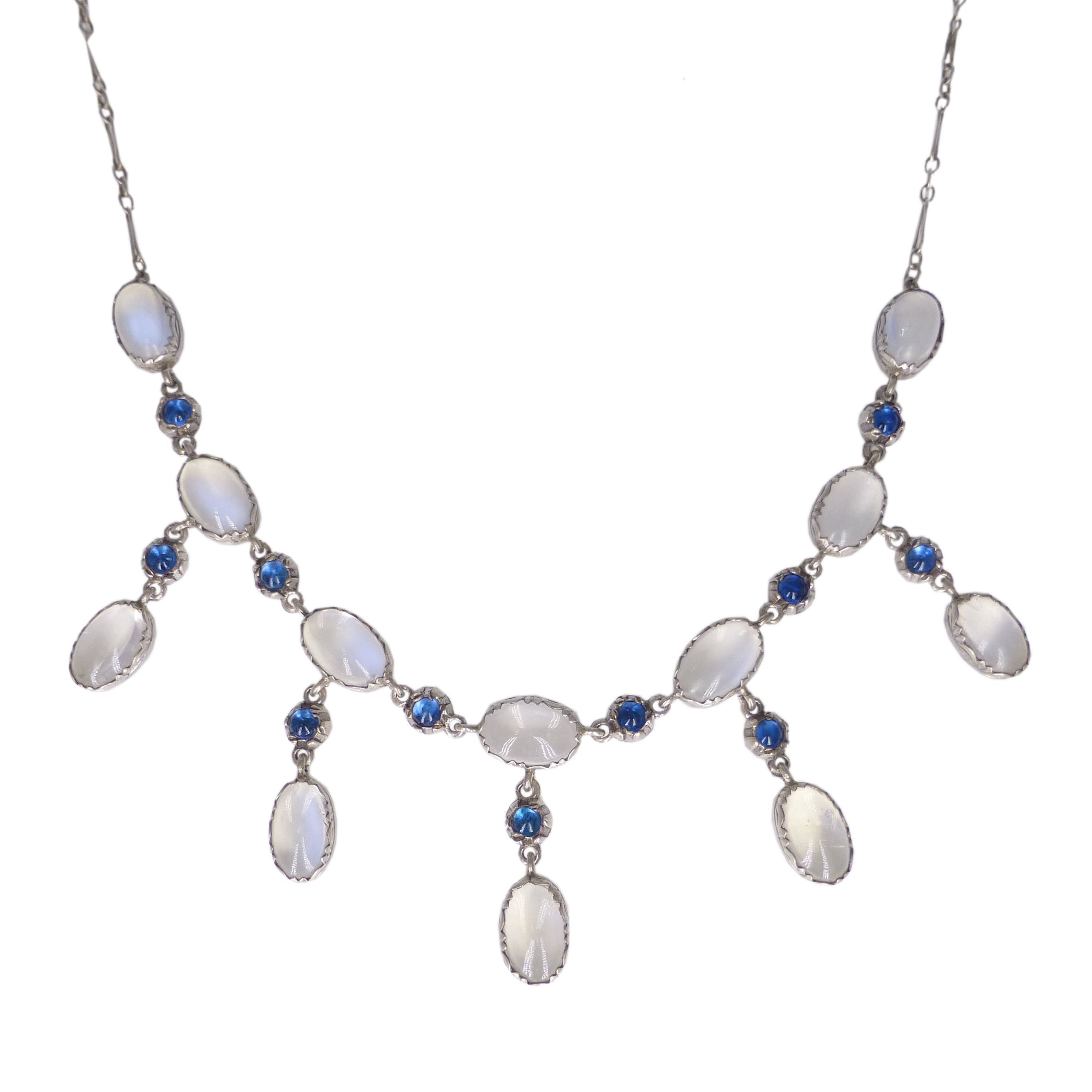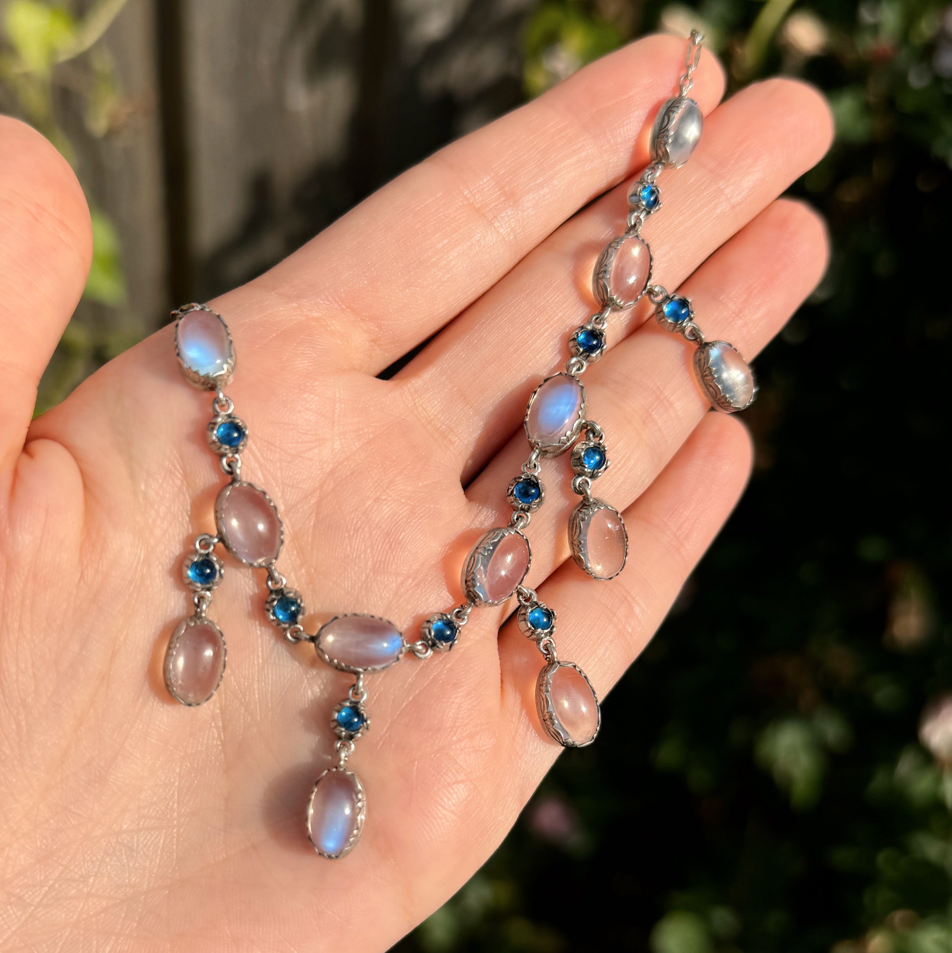 A wonderful antique silver necklace dating to the Arts & Crafts period. The necklace features blue tinted moonstones encased in decorative silver frames with little blue glass cabochons illuminating each stone.