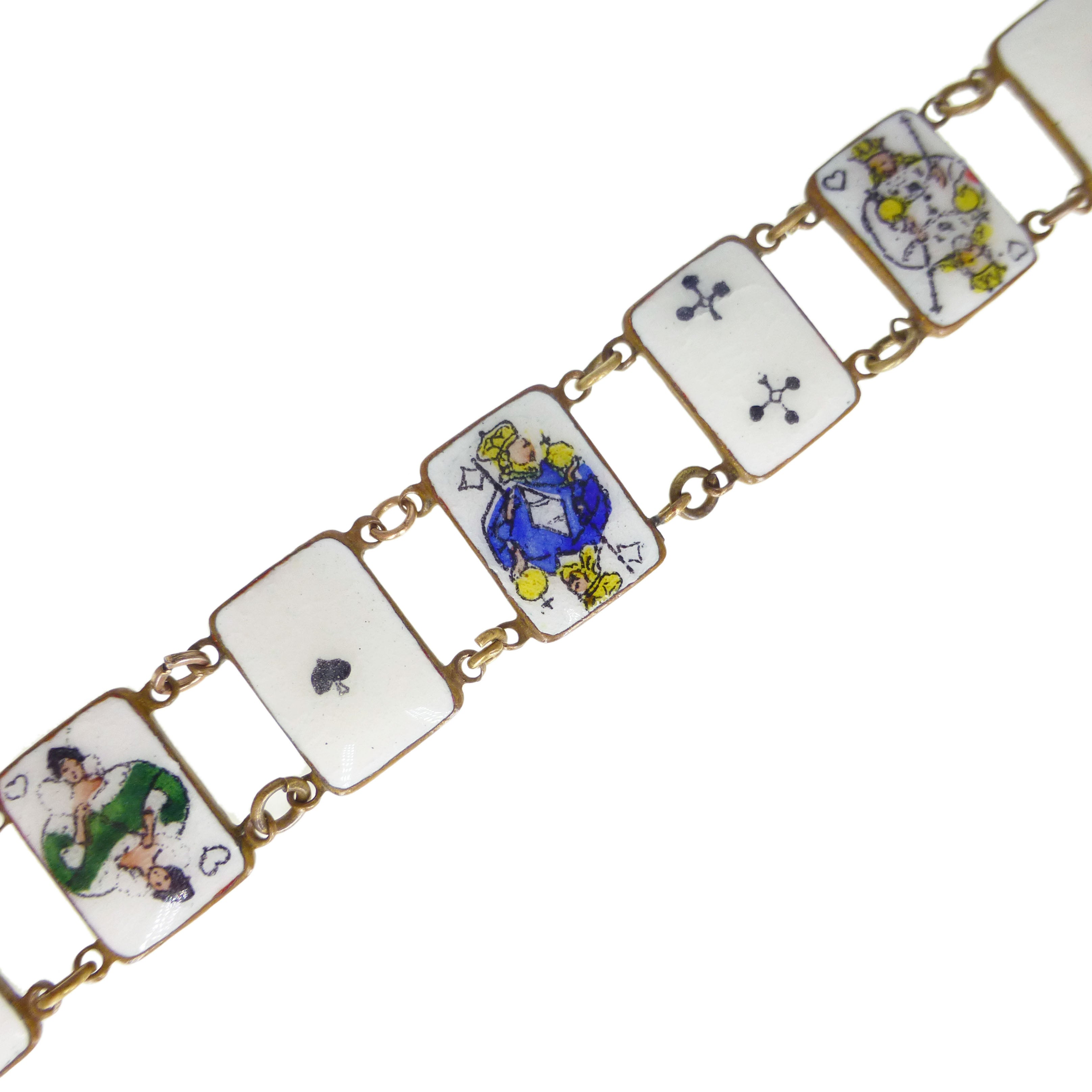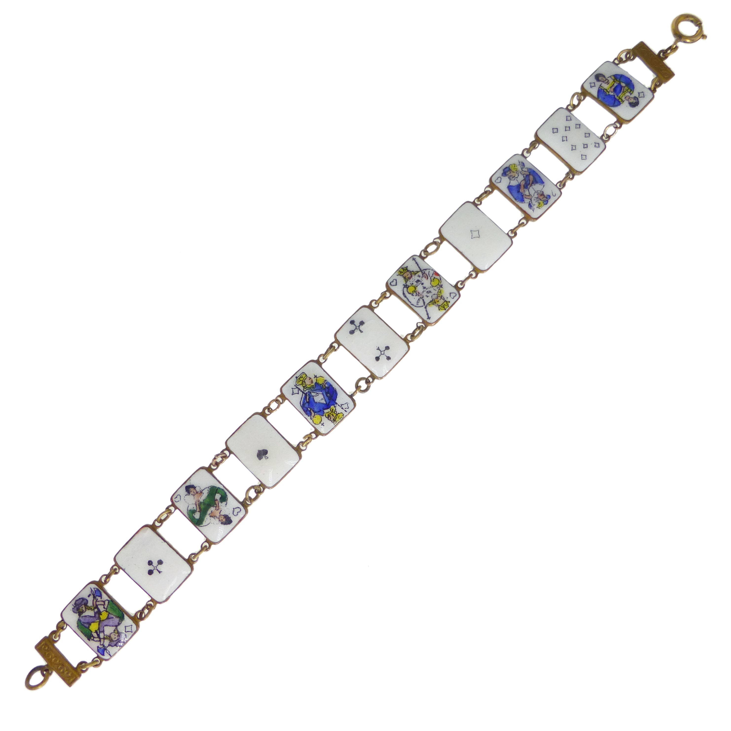 A rare antique souvenir bracelet in the form of enamel playing cards. Each metal panel depicts an individual card from a deck with little patterned metal frames at each end.