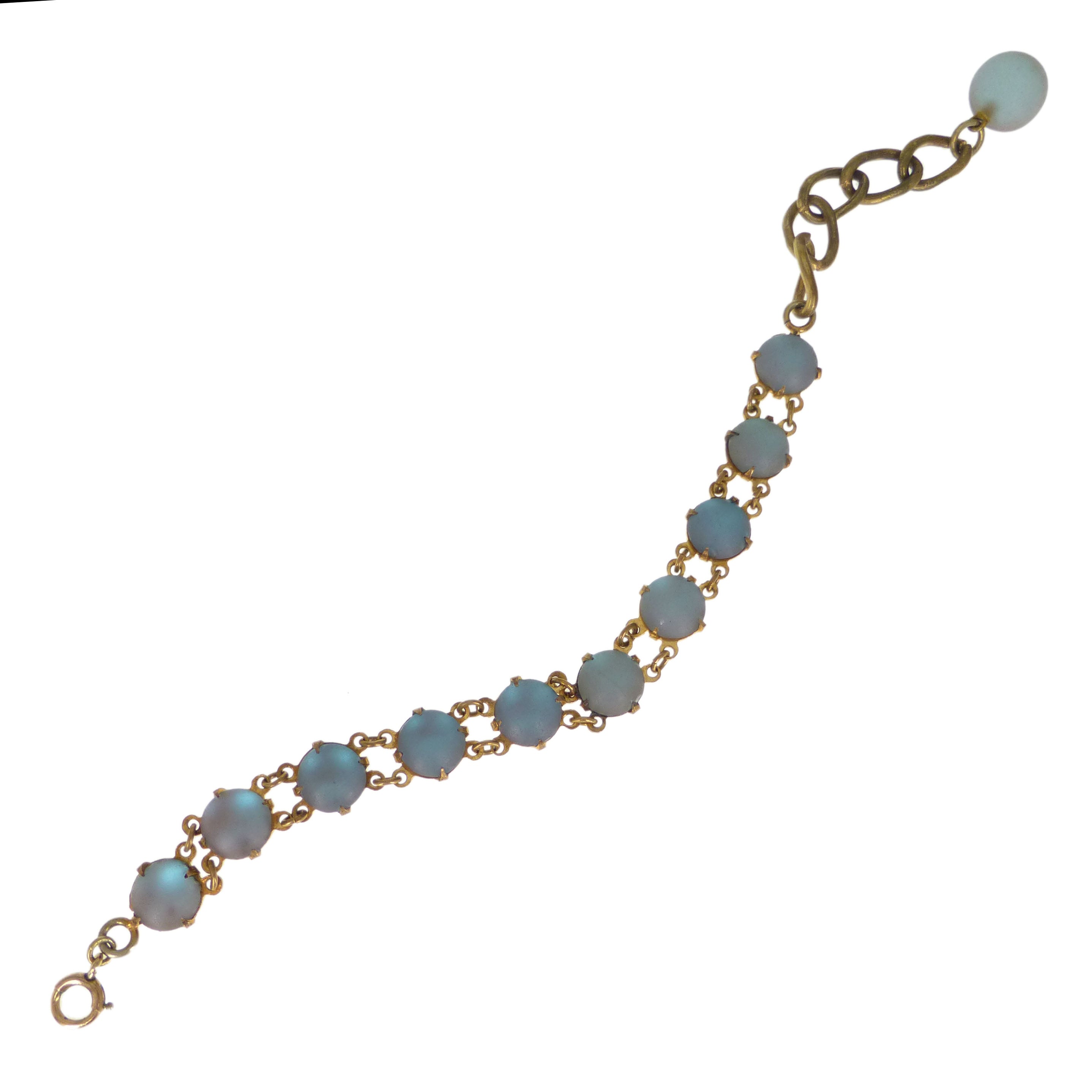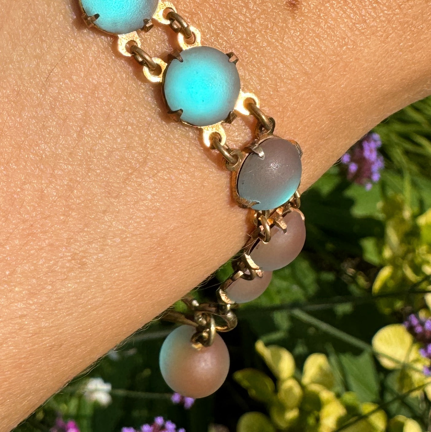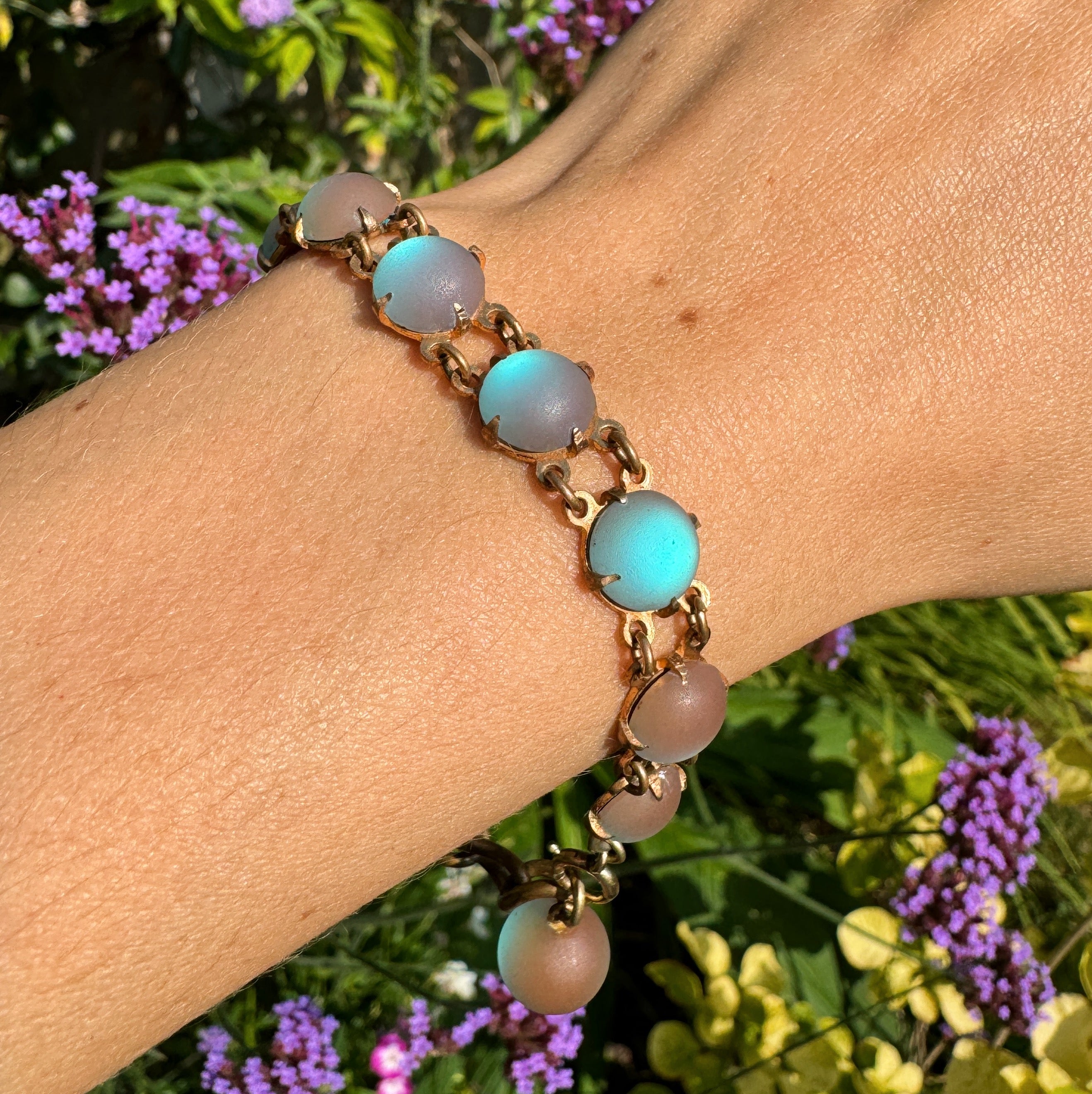 A beautiful antique saphiret bracelet featuring ten matte saphiret glass stones set into rolled gold panels with a lovely saphiret bead hanging from the bracelet chain.