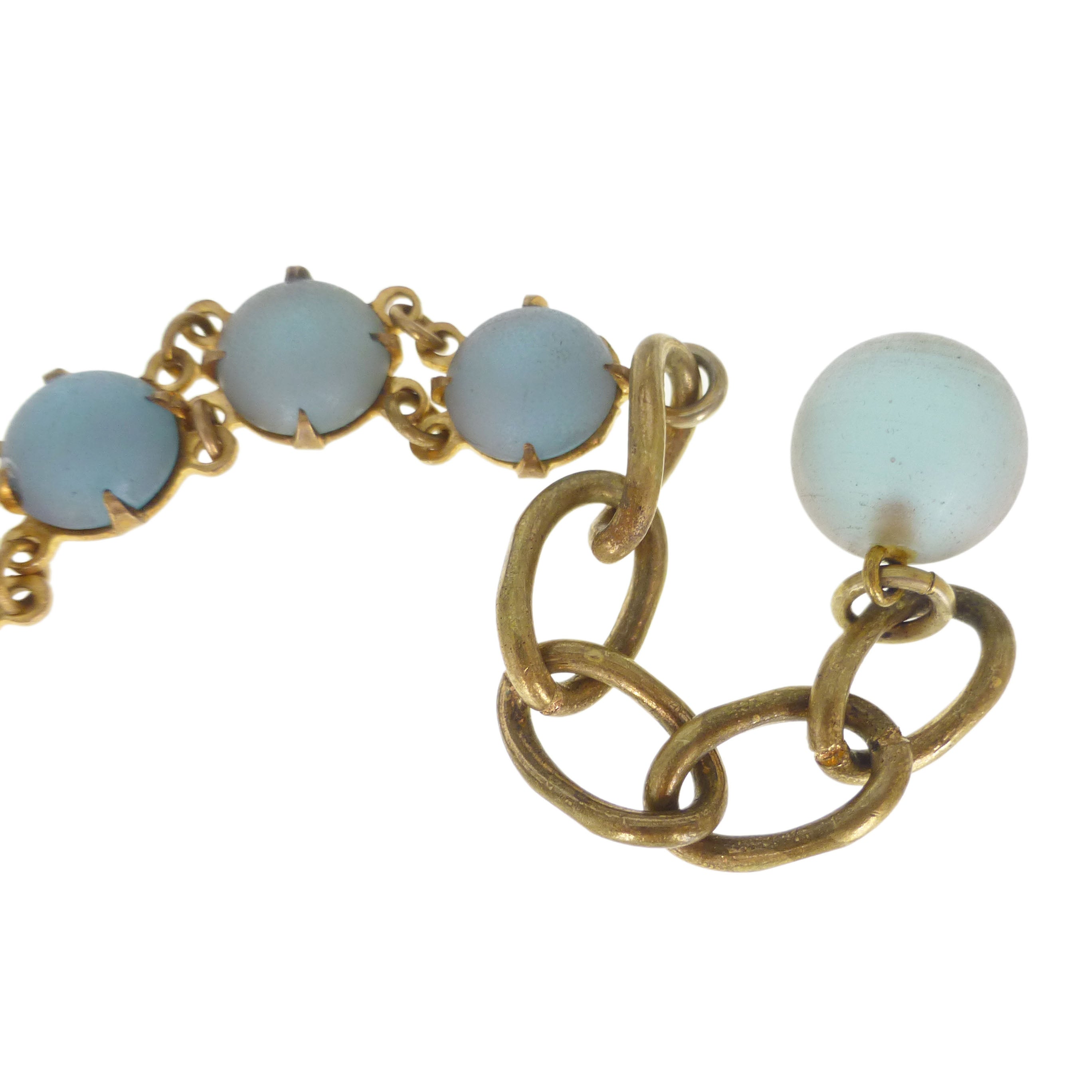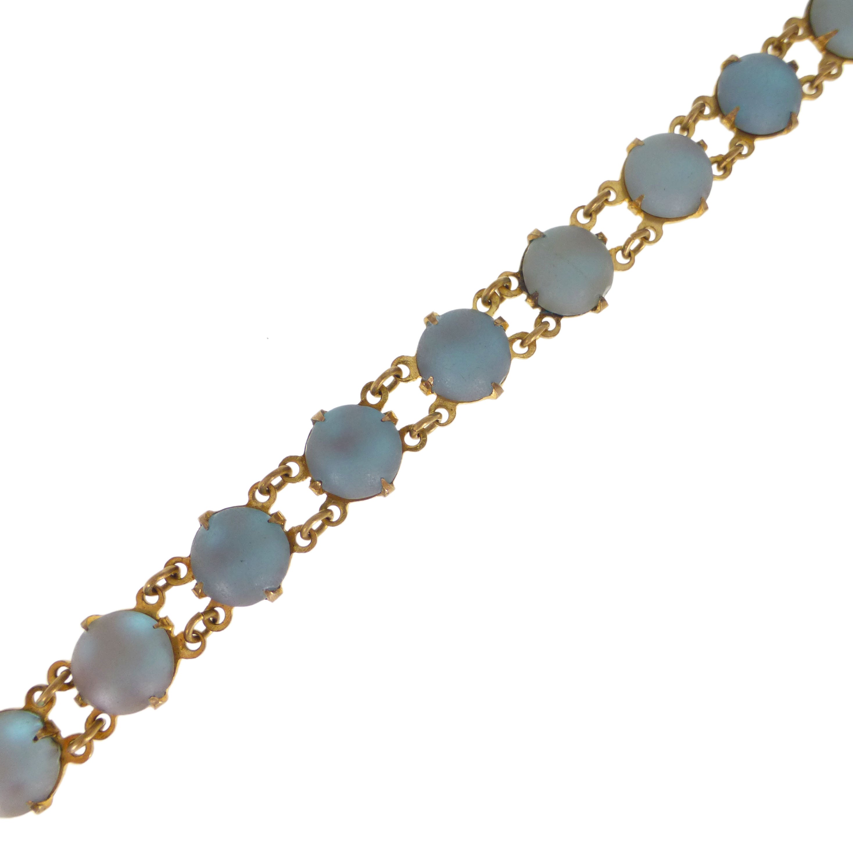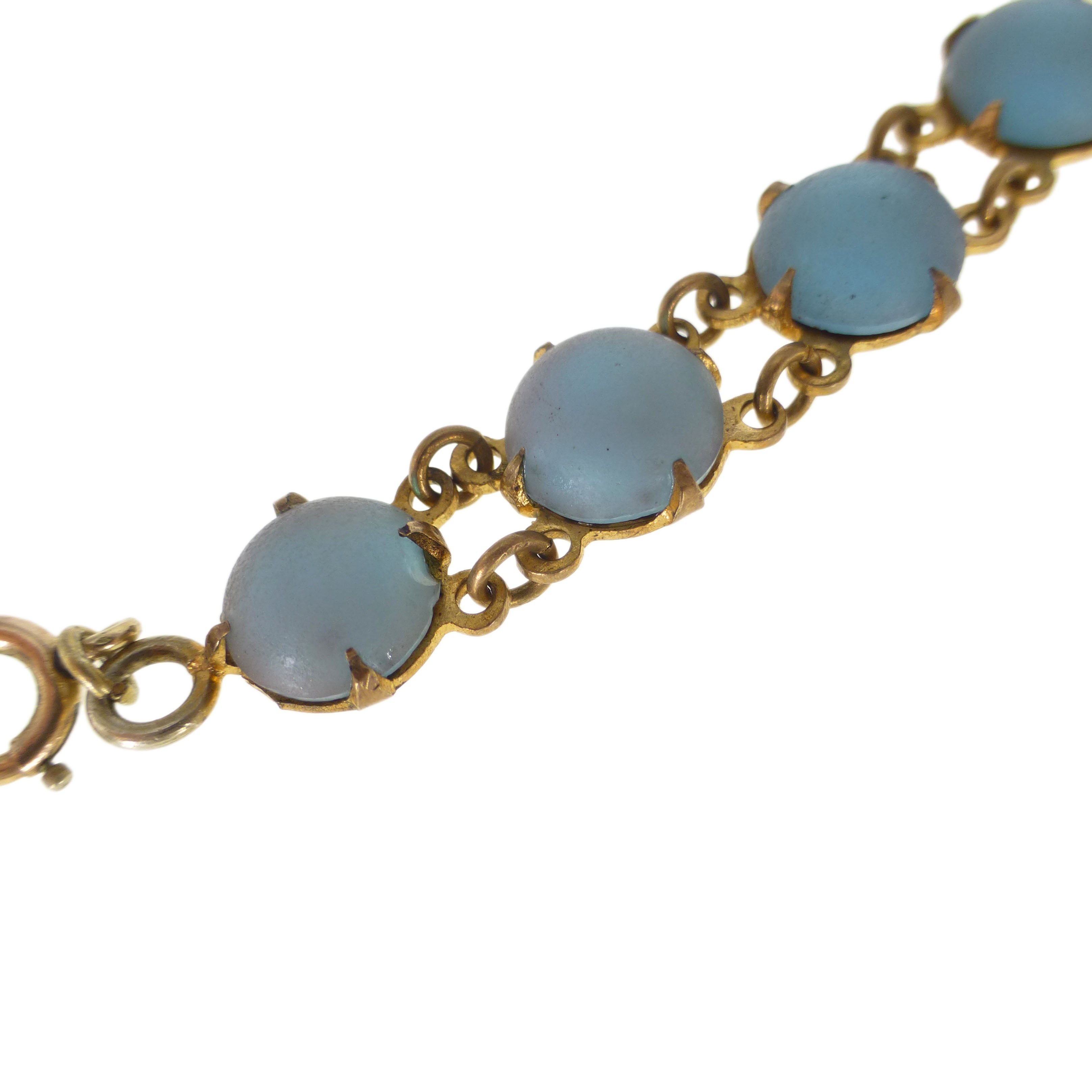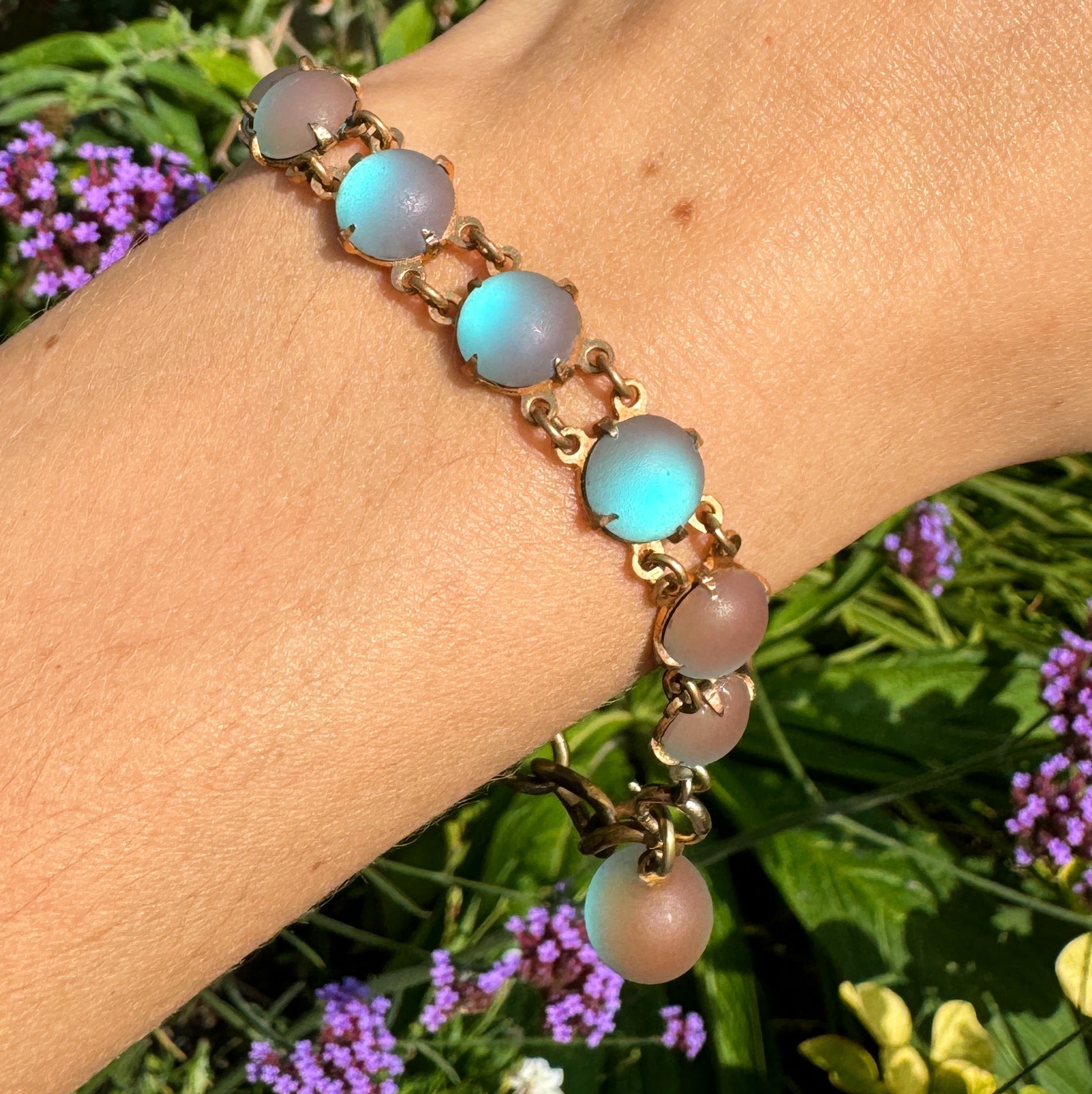 A beautiful antique saphiret bracelet featuring ten matte saphiret glass stones set into rolled gold panels with a lovely saphiret bead hanging from the bracelet chain.