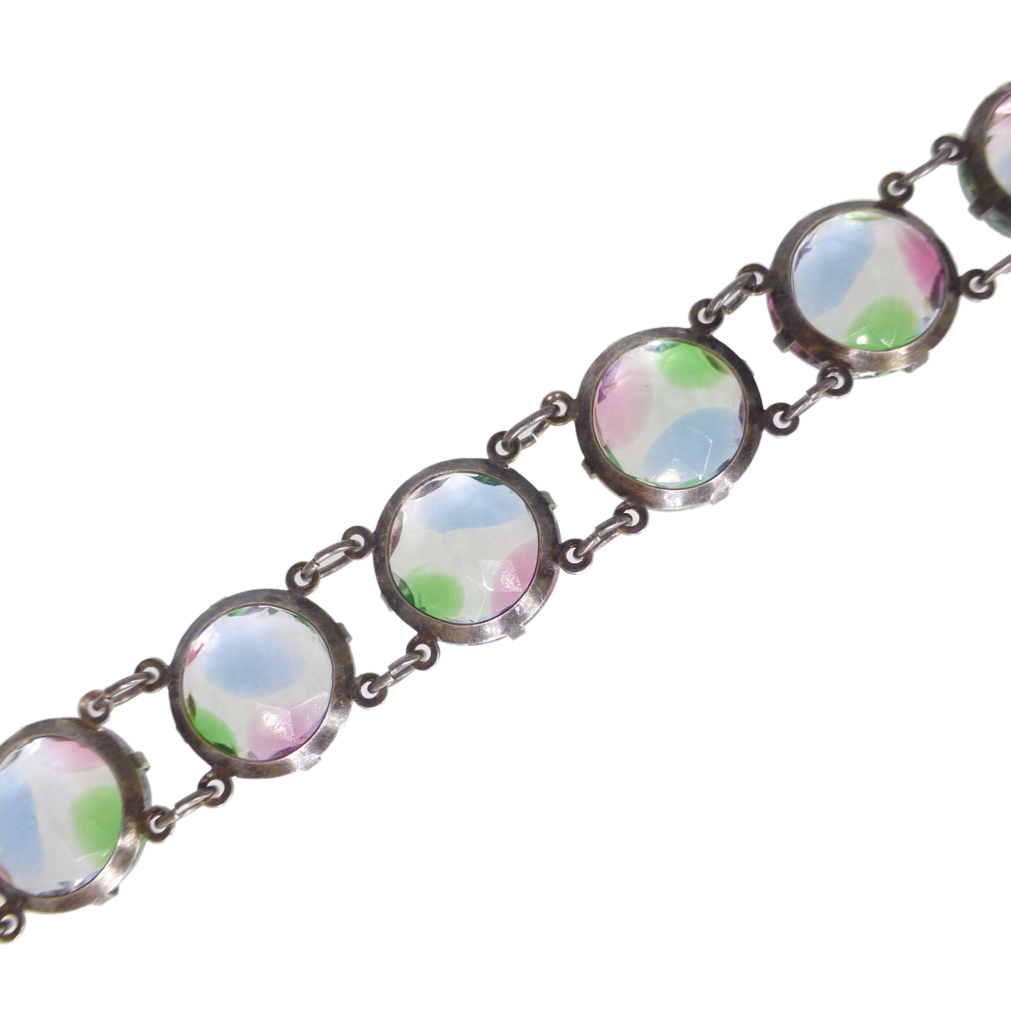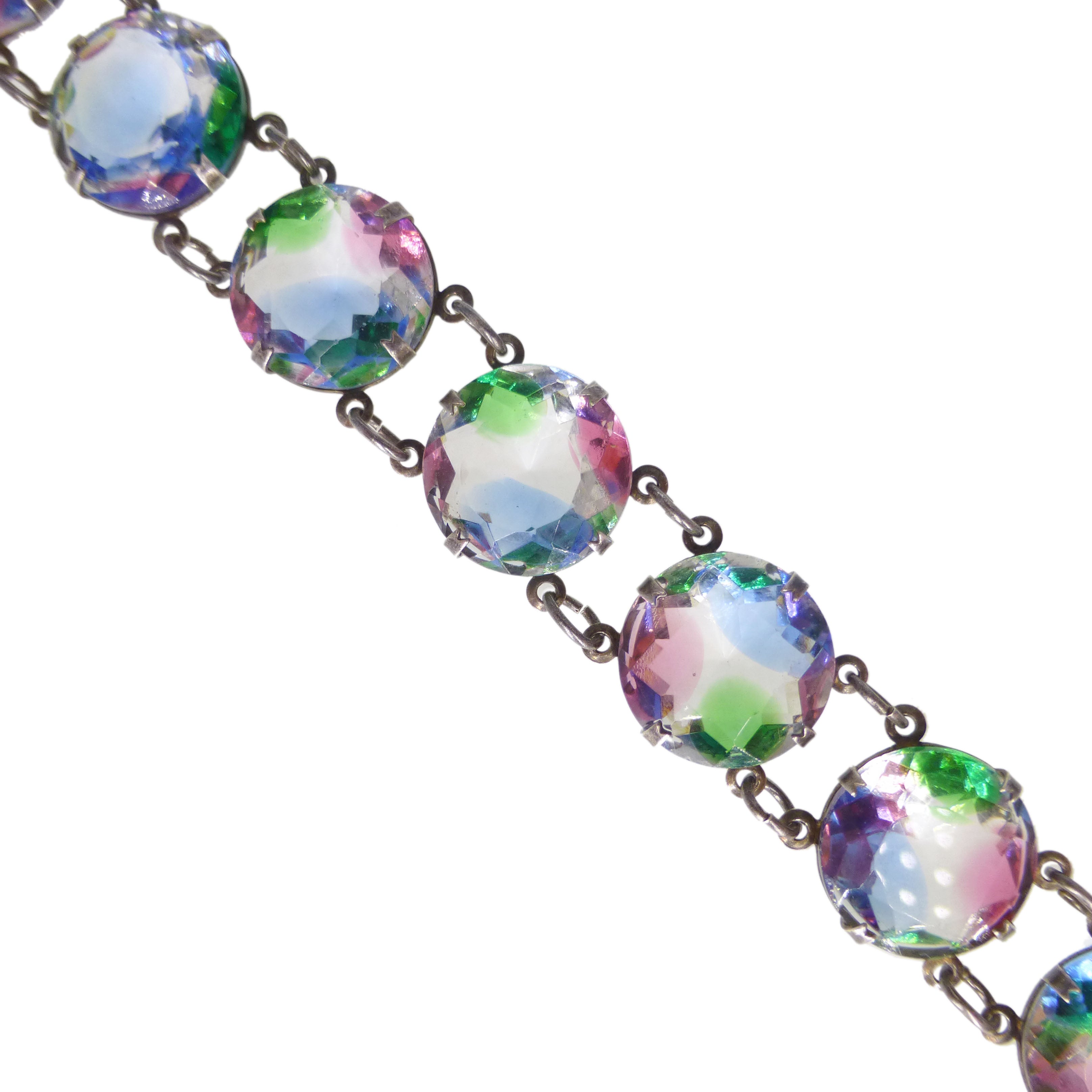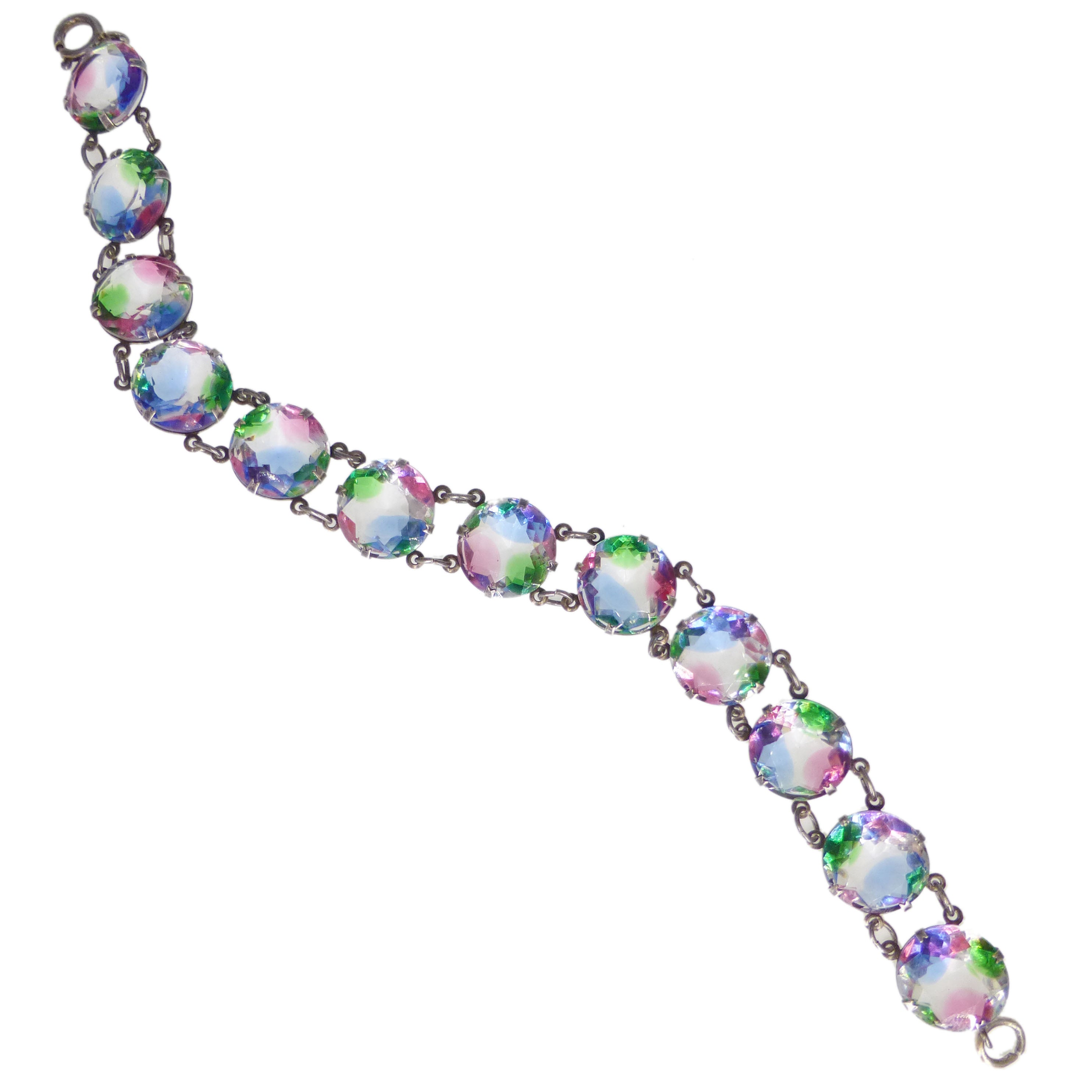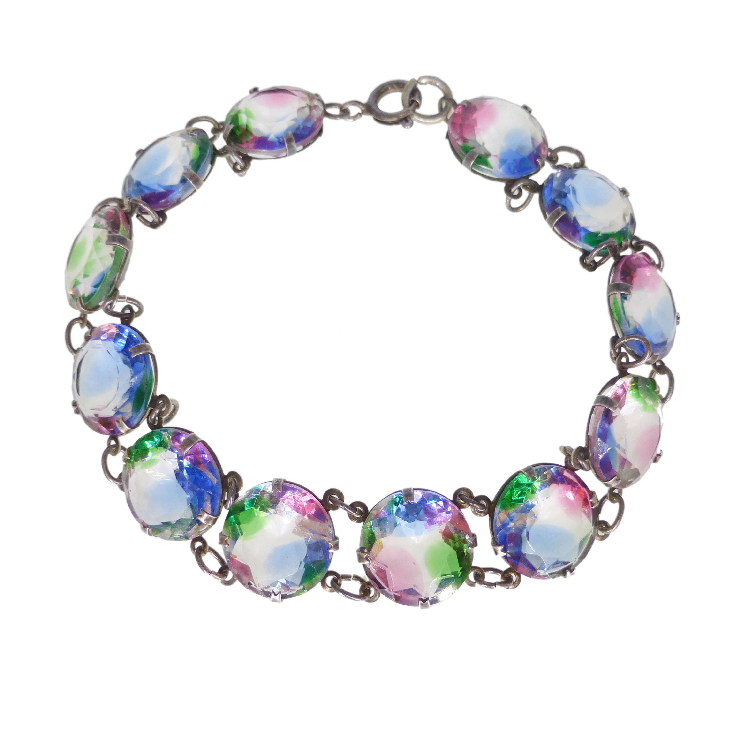 A beautiful late Art Deco bracelet set with colourful iris glass stones. Each stone is embedded with patches of pink, blue and green into a clear glass base.