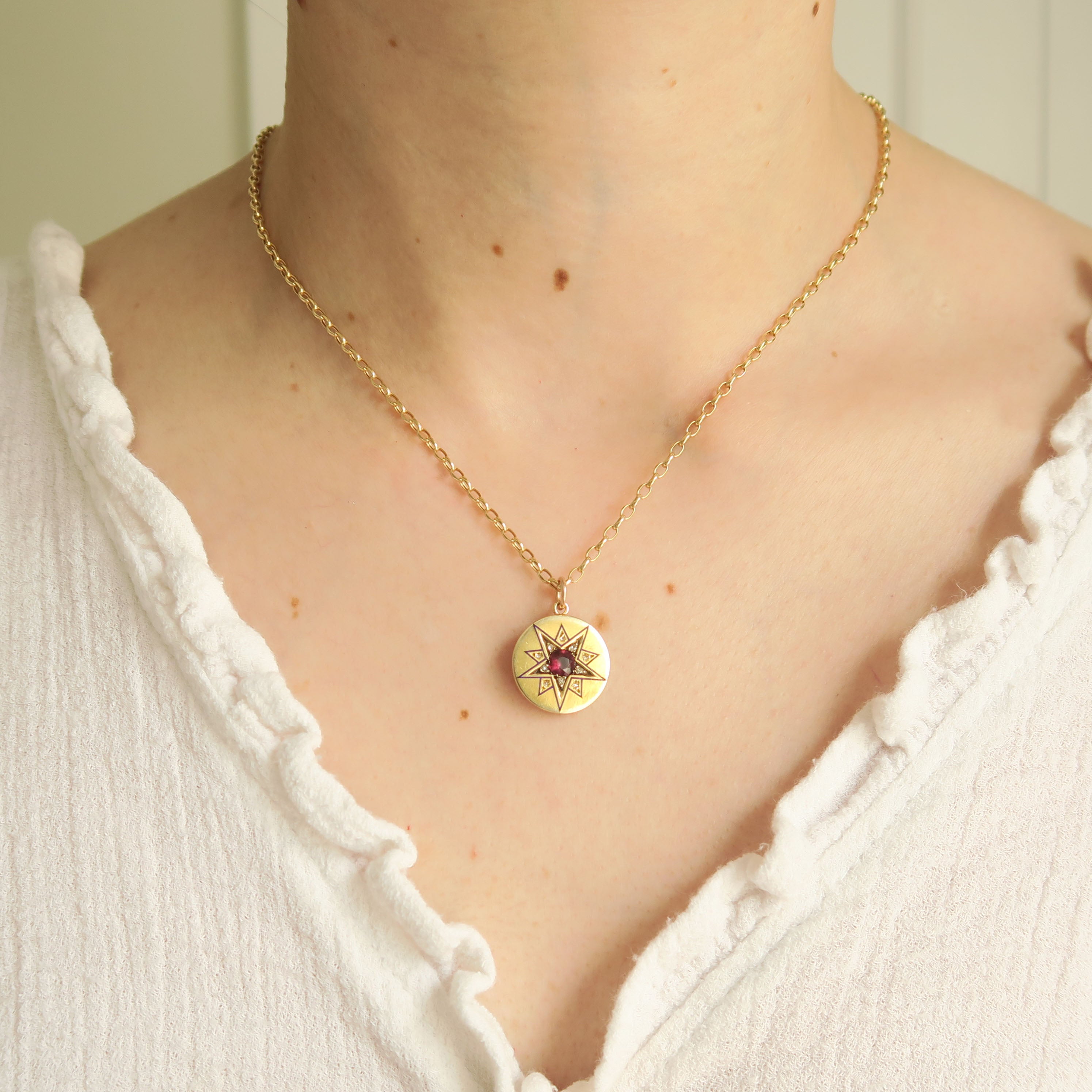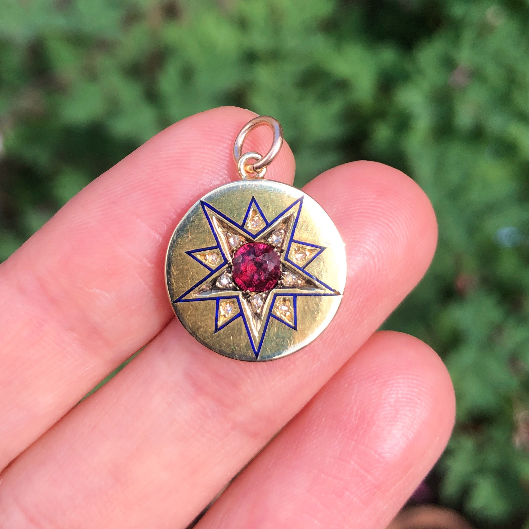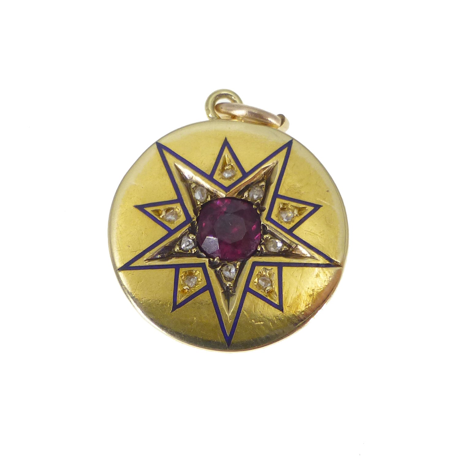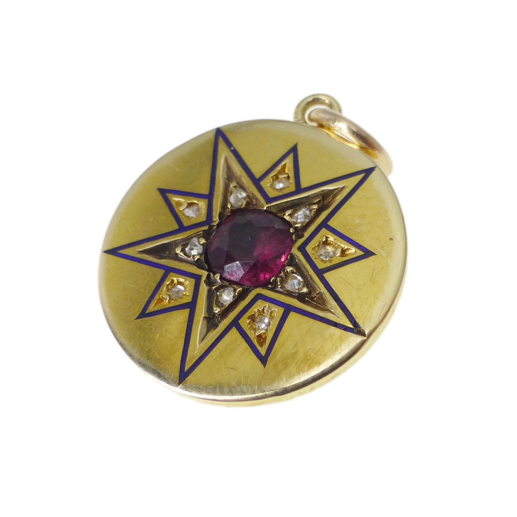 The round gold pendant features an enamelled star motif embedded with diamonds with a stunning garnet stone at its centre.