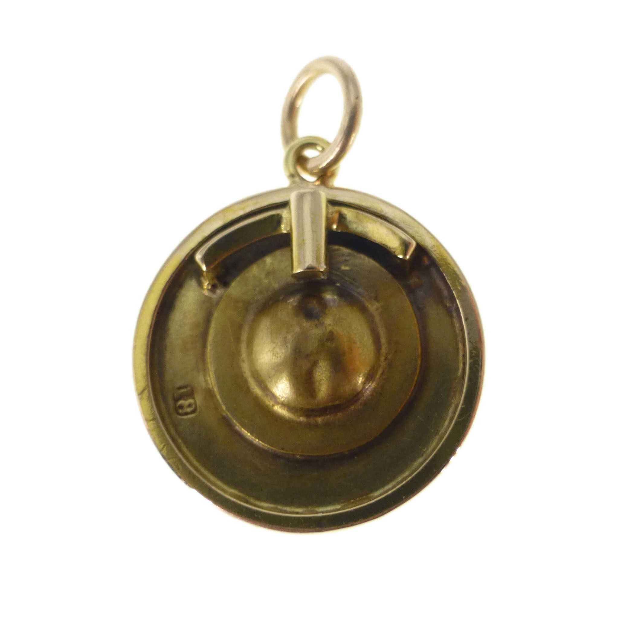 The pendant features a hooked top with a small gold bale attached and is marked '18' for 18ct gold on the reverse.