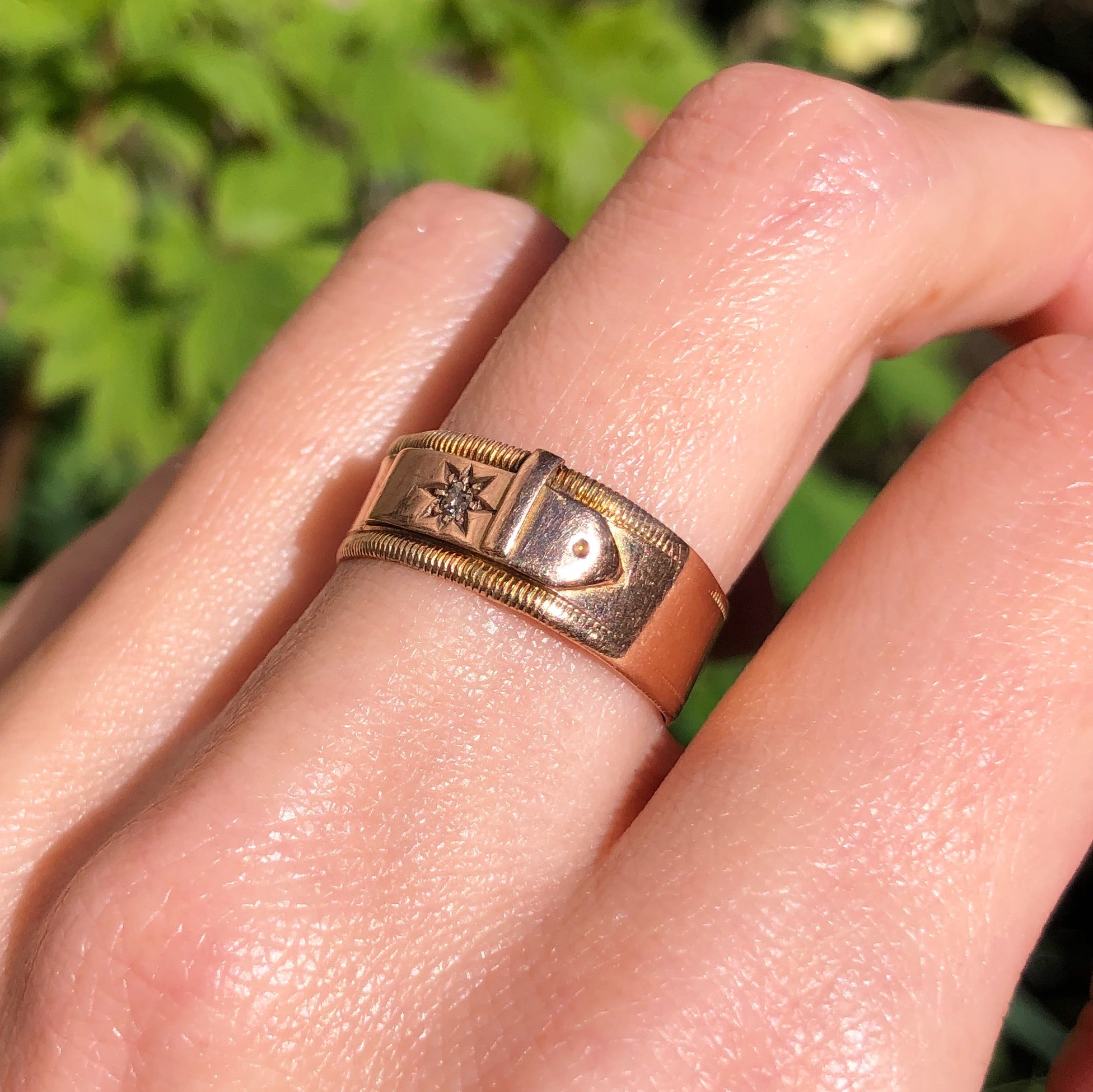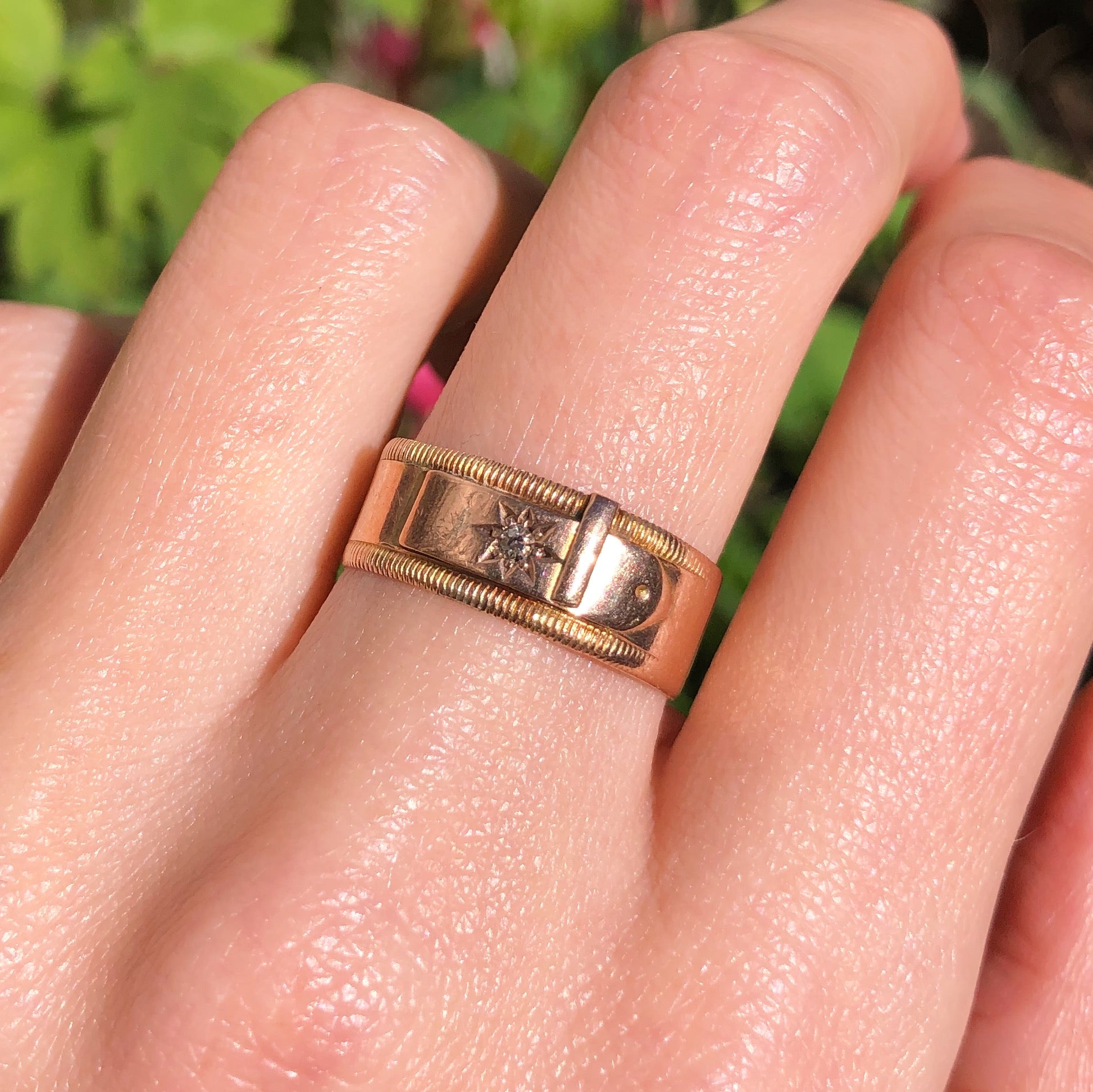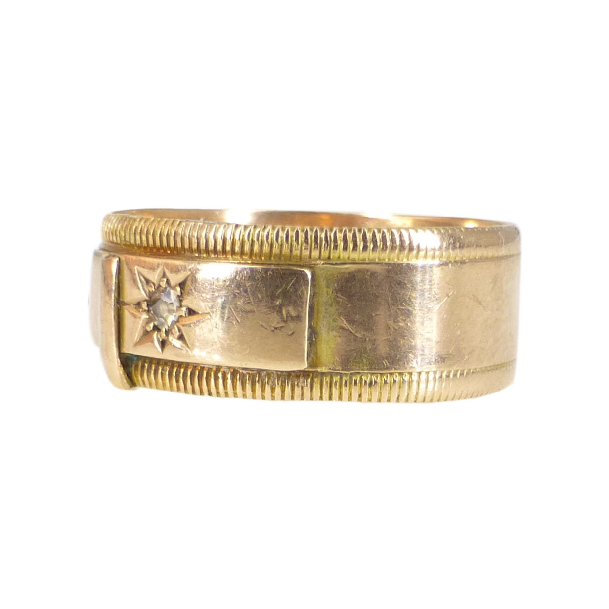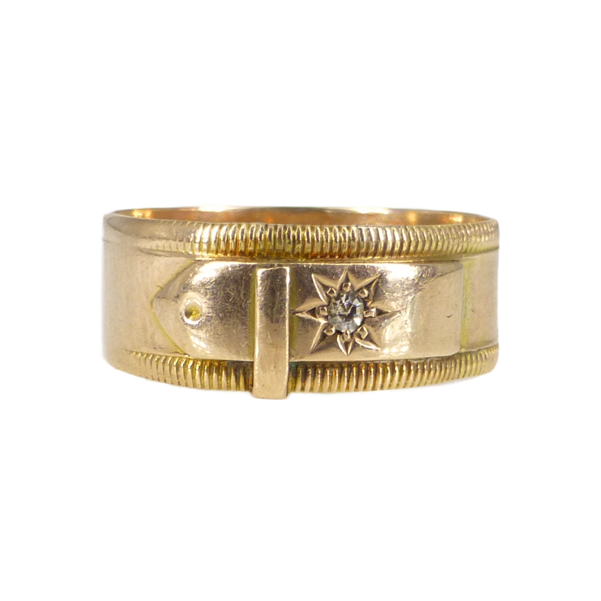 A wonderful Victorian gold buckle ring set with a sparkling diamond stone in a starburst setting.