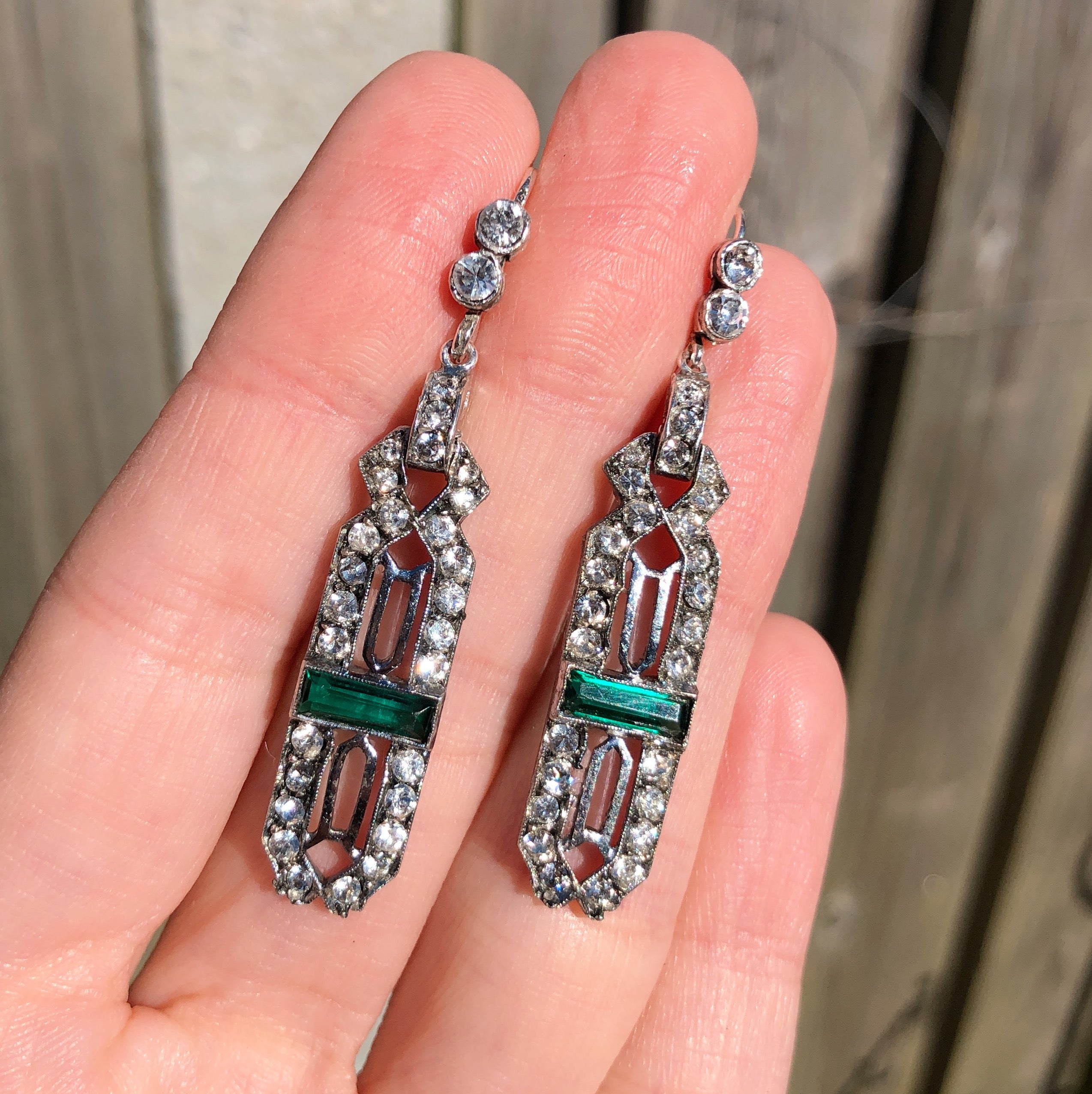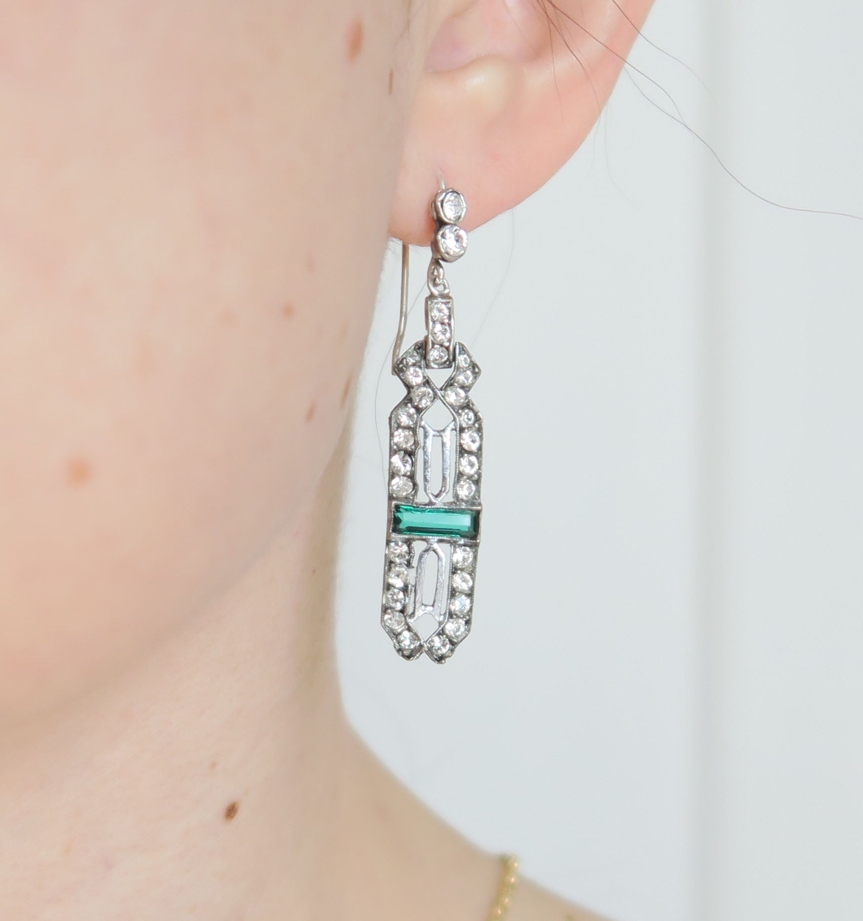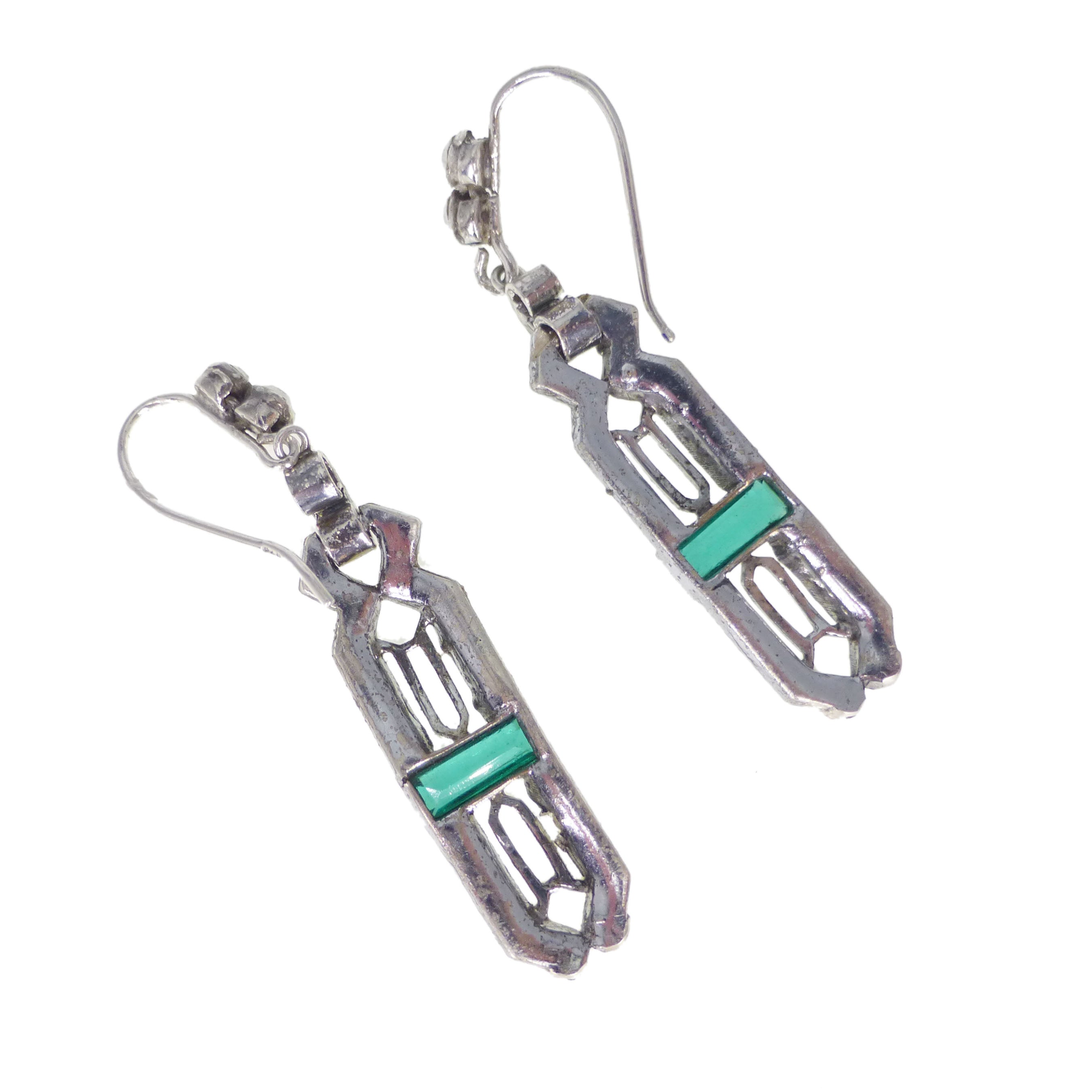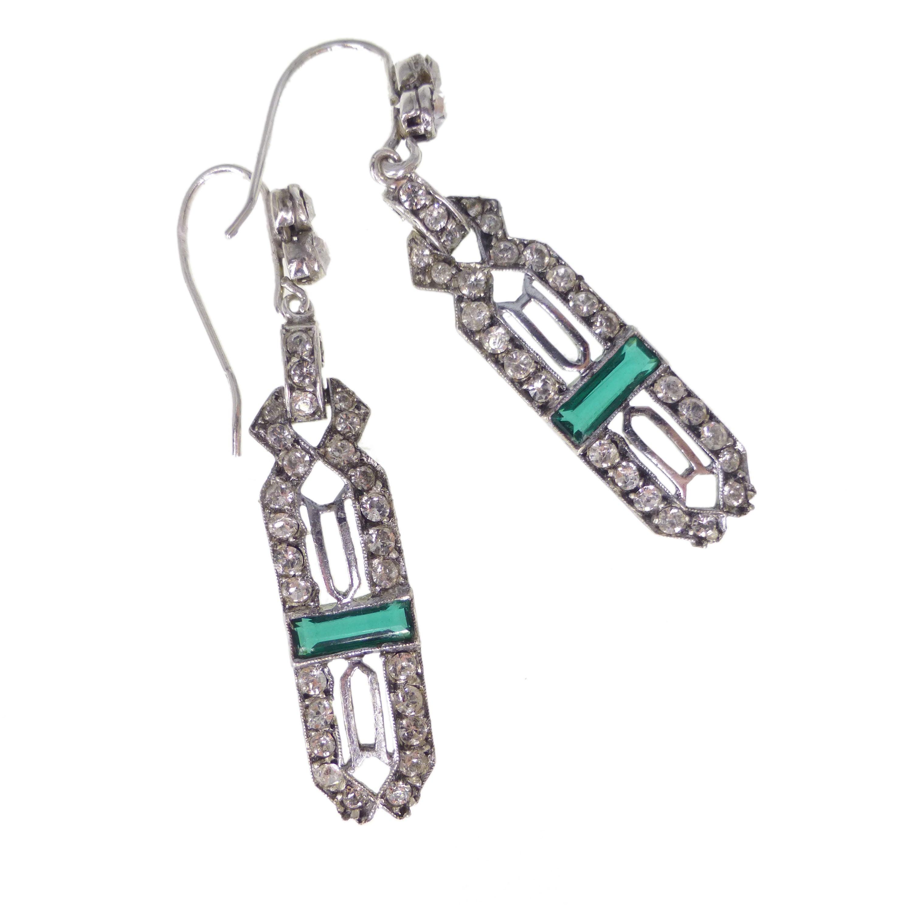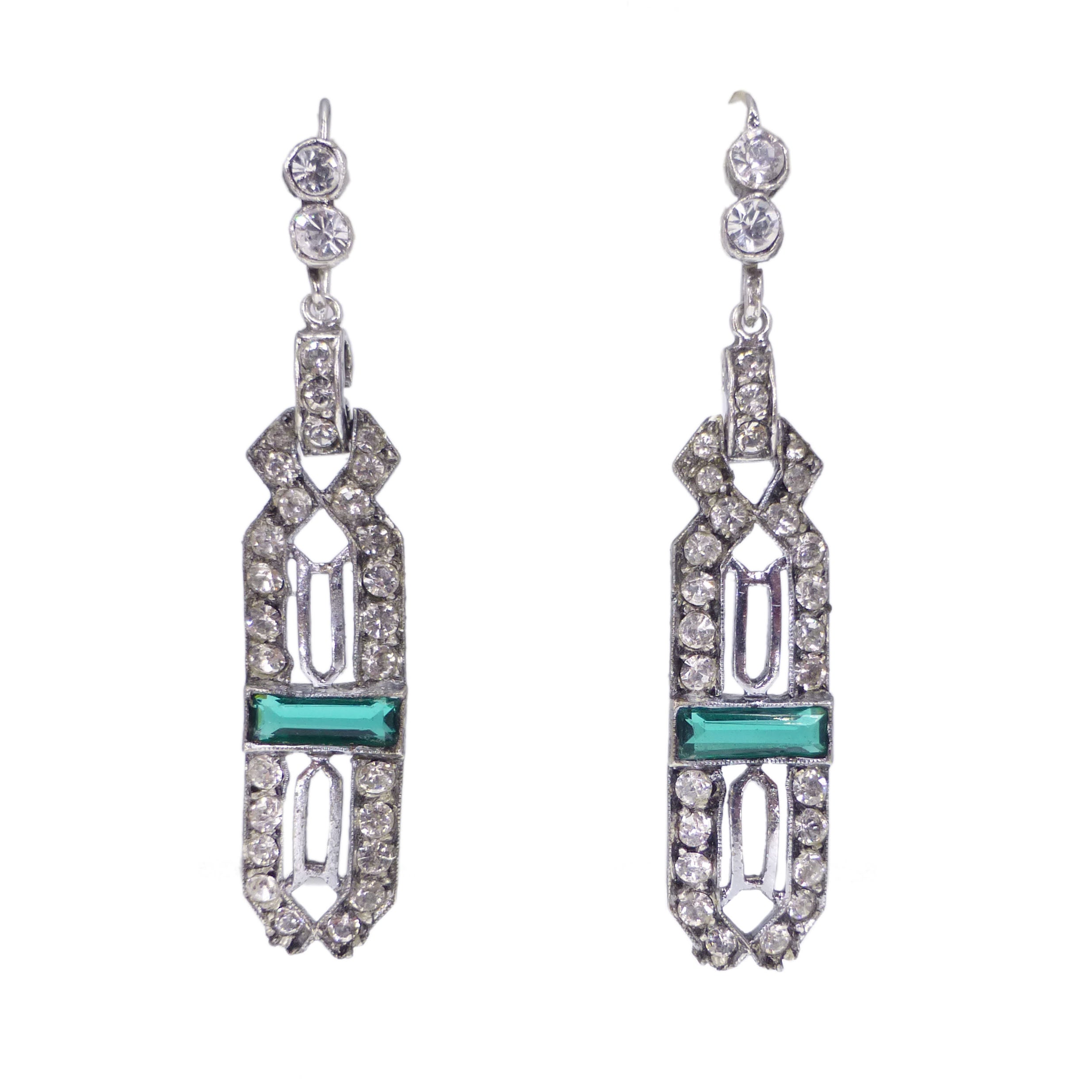 A pretty pair of original Art Deco earrings made from a rhodium plated silver. The earrings are set with sparkling clear paste stones with green glass accents.