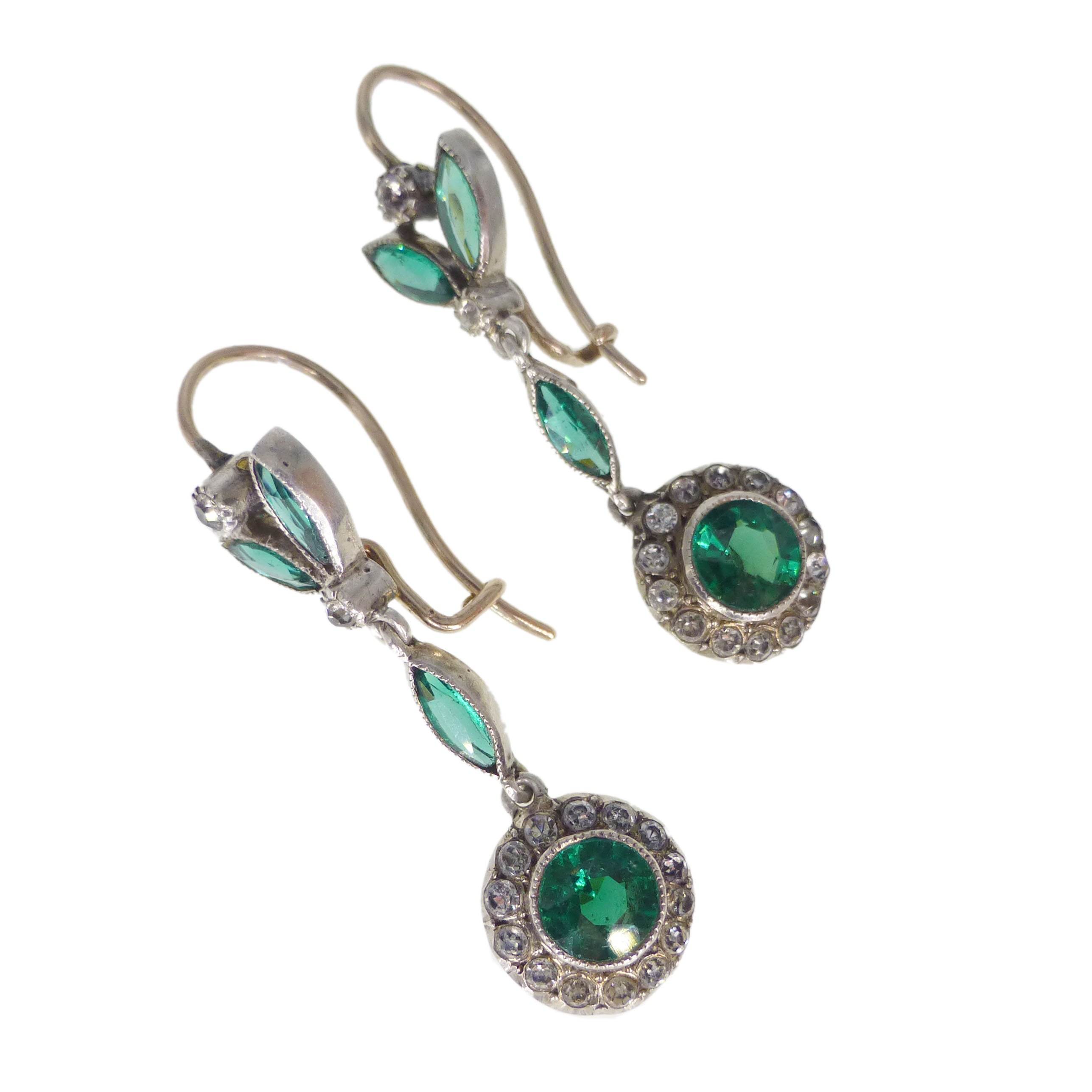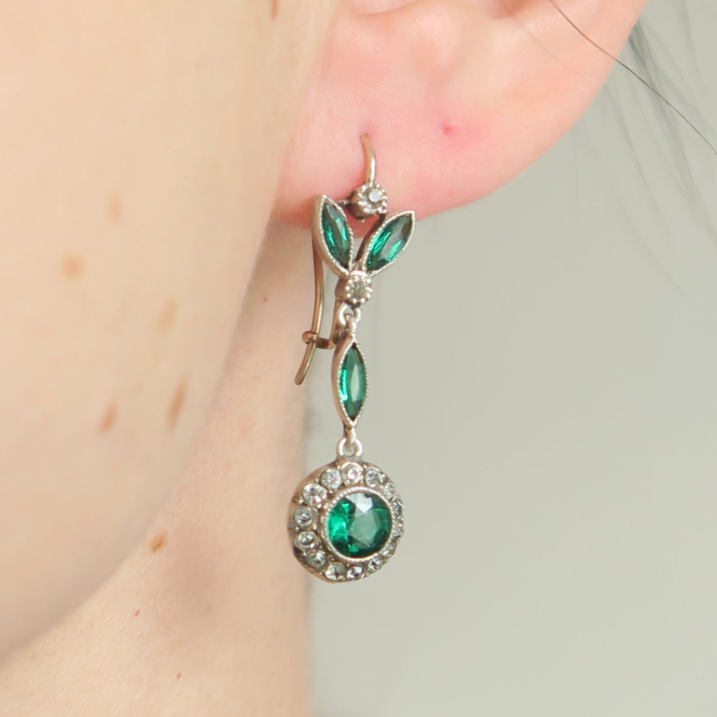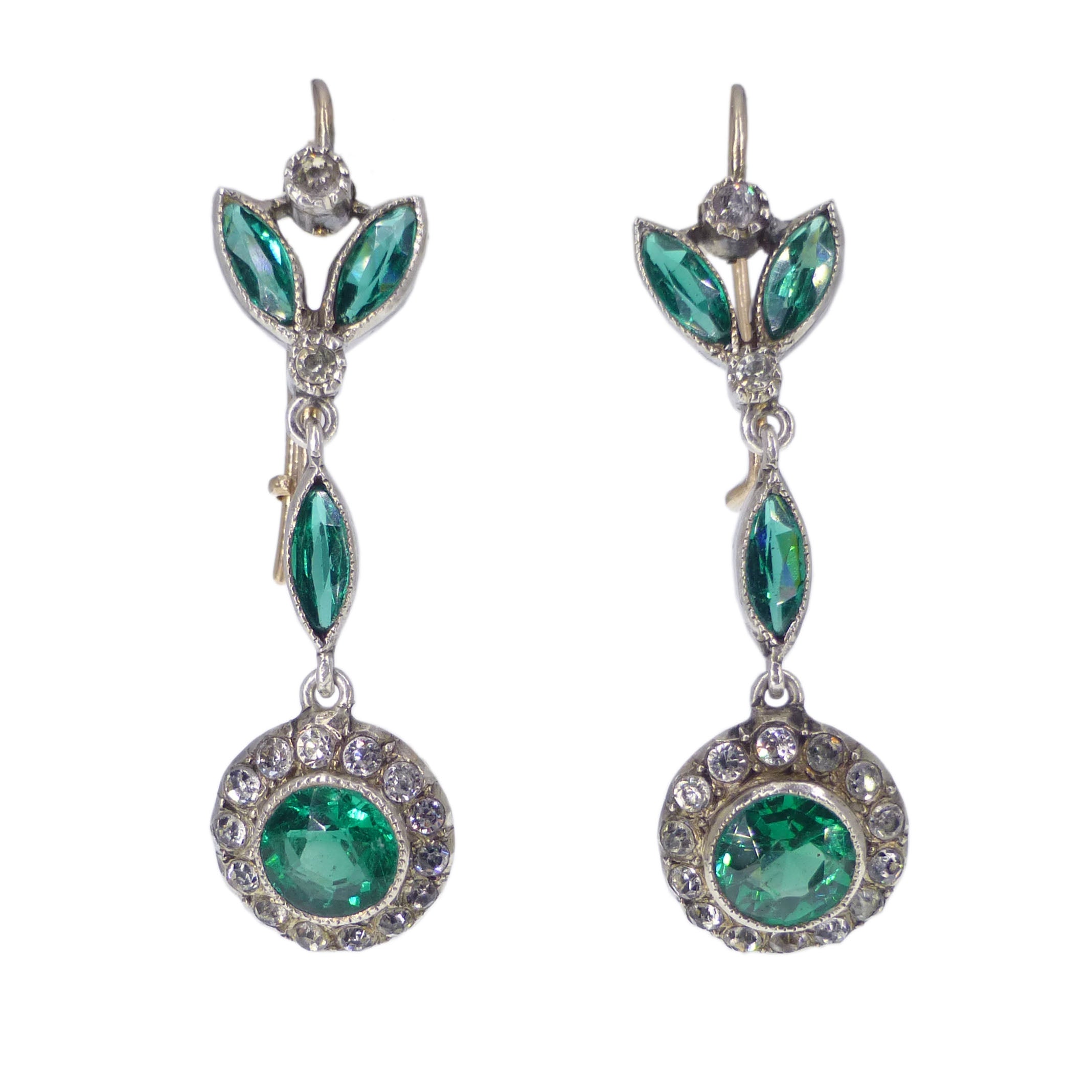 A beautiful pair of antique silver earrings set with green and clear glass stones in a lovely deco design.