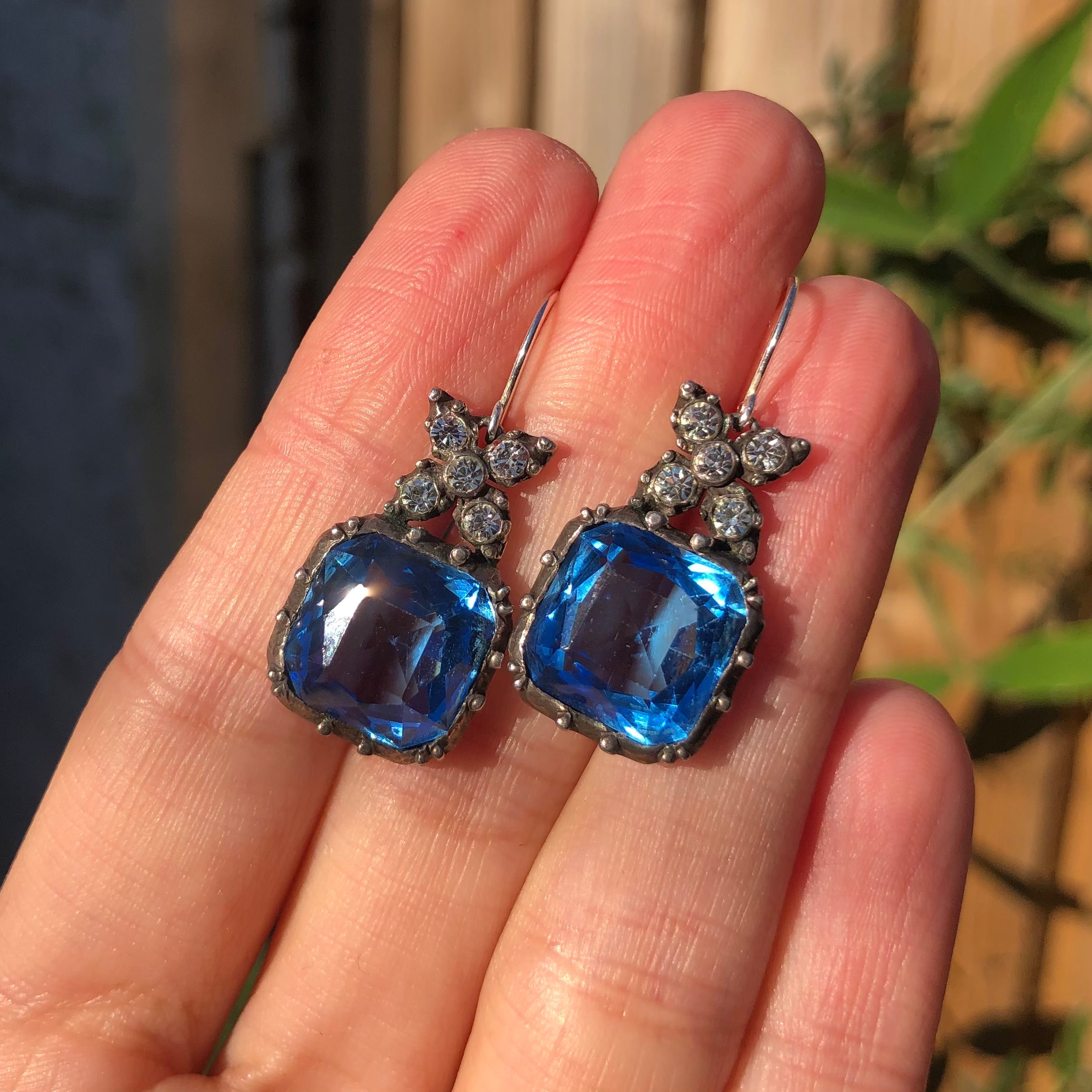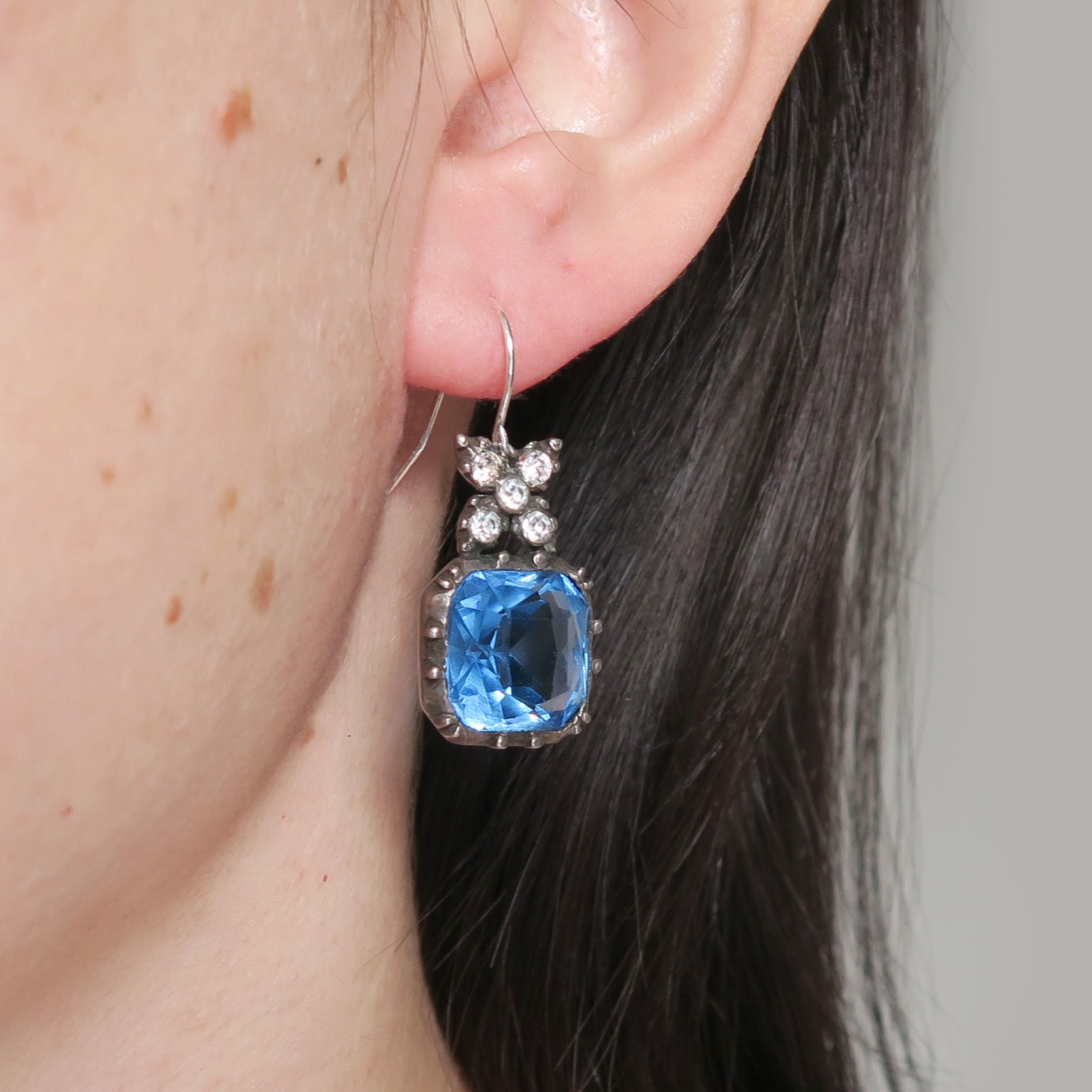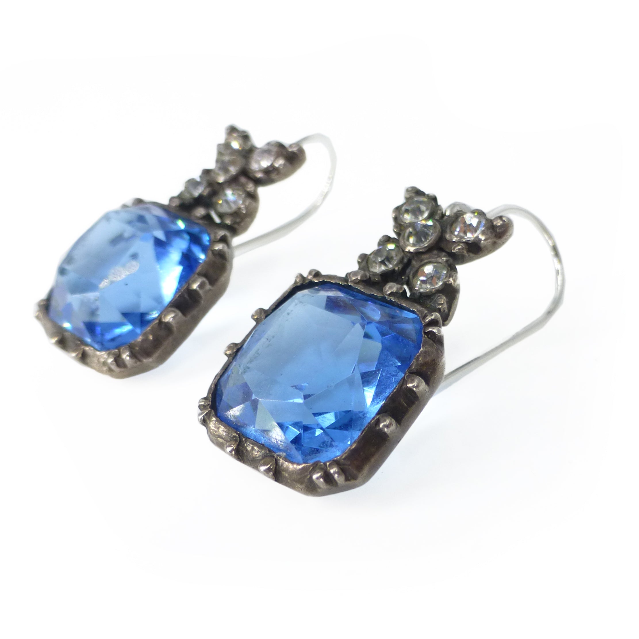 A lovely pair of antique silver earrings set with large faceted blue glass stones with paste studded floral tops.